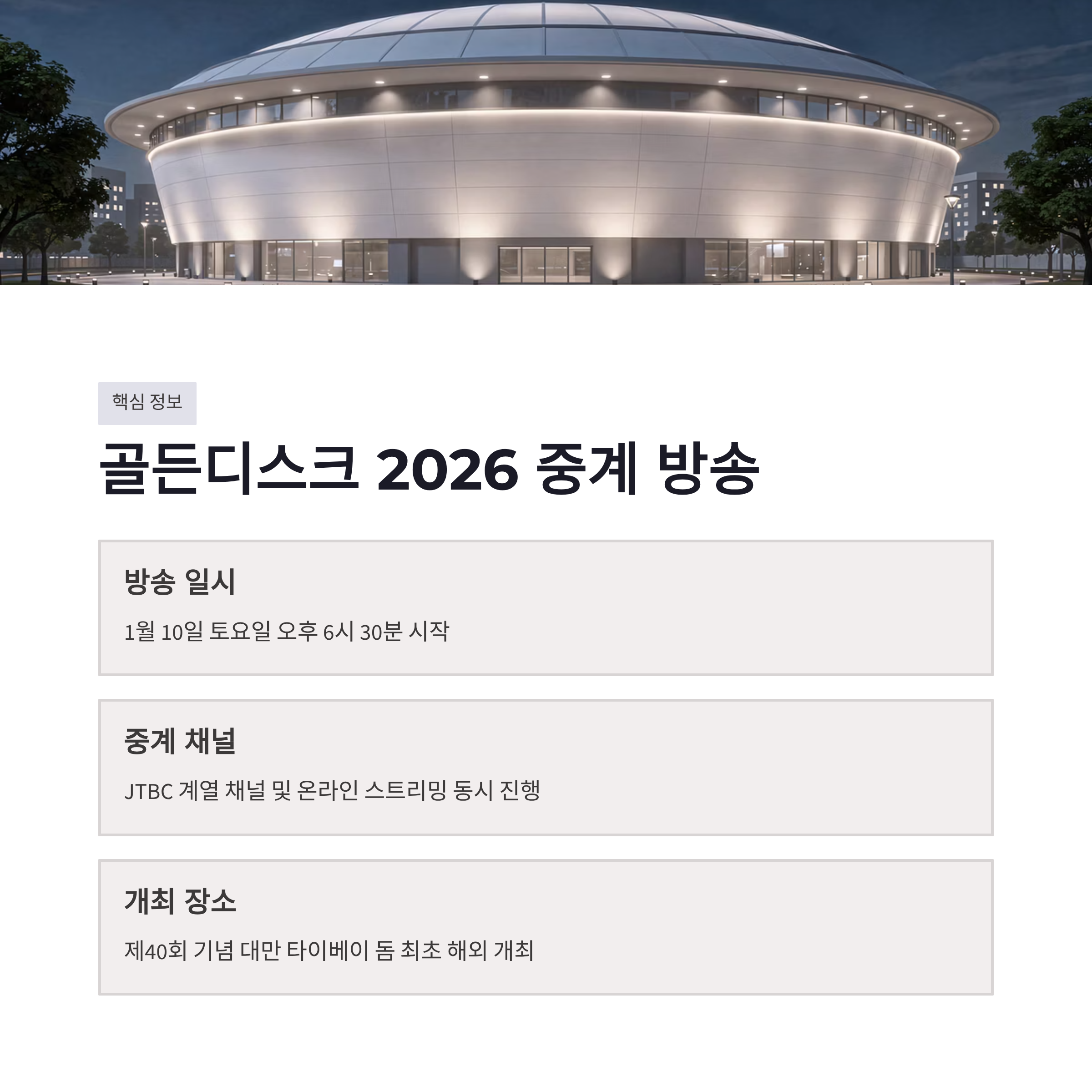드디어 골든디스크 2026가 열립니다. K-POP 팬이라면 이 날짜 캘린더에 체크해두셨을 듯요 ㅎㅎ 골든디스크 2026는 1월 10일 토요일 오후 6시 30분 시작이구요, 제40회를 맞아 처음으로 해외, 대만 타이베이 돔에서 개최됩니다. 이 소식 듣고 저도 “와… 규모 장난 아니겠는데?” 했습니다. 중계는 국내 기준 JTBC 계열 채널과 온라인 스트리밍으로 동시에 진행됩니다. TV로 보면 무대 연출이 시원하게 들어오고, 모바일·PC로 보면 레드카펫부터 실시간 반응까지 챙기기 좋더라구요. 골든디스크 2026 중계 방송은 생방이라 타이밍 놓치면 다시 보기 전까지는 답답… 미리 대기 추천입니다. 개인적으로는 음원·음반 대상 발표 순간은 꼭 생중계로 보는 게 제맛이더라구요, 심장 쫄깃 ㅋㅋ