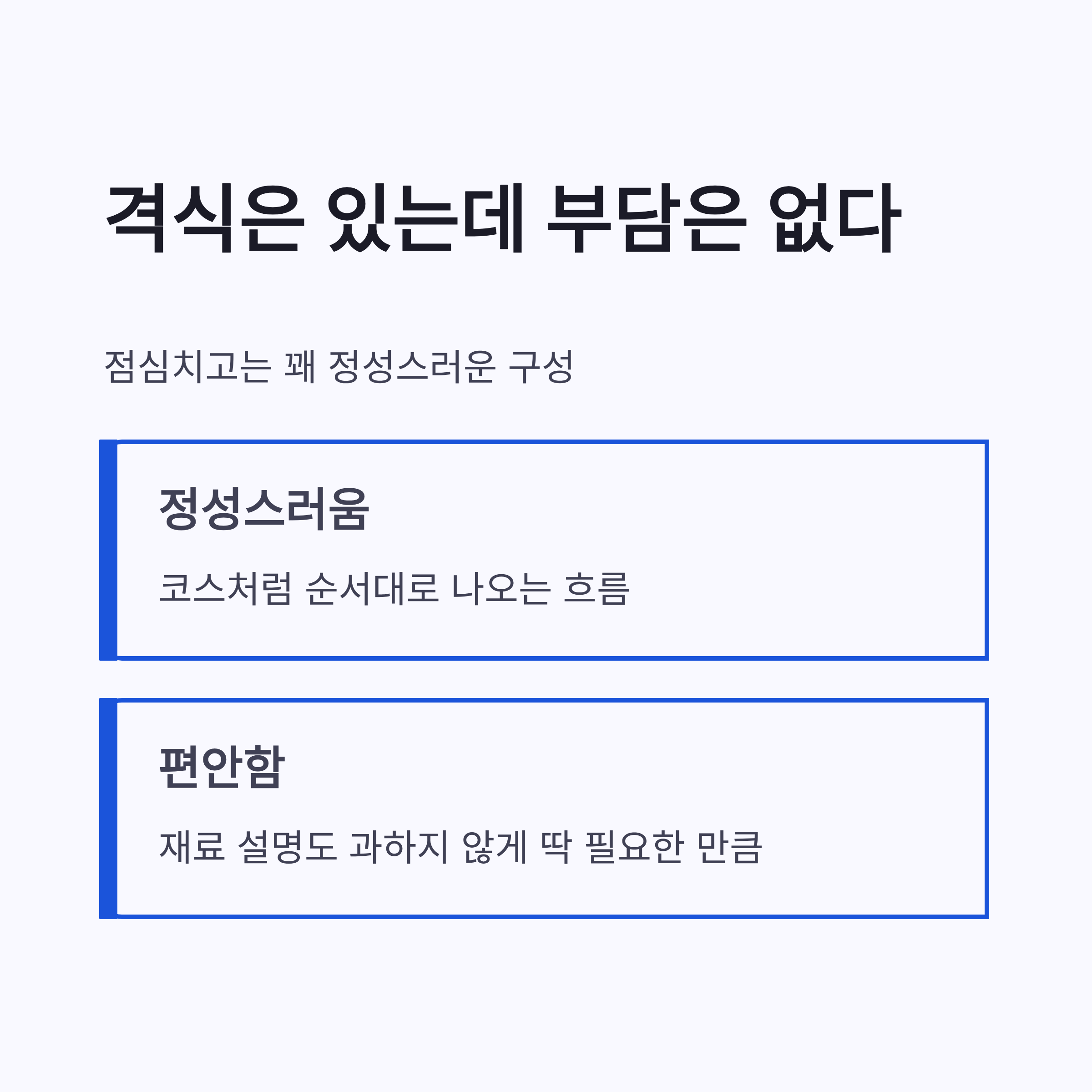 | 디저트 | 깔끔한 마무리 | 부담 없음 |