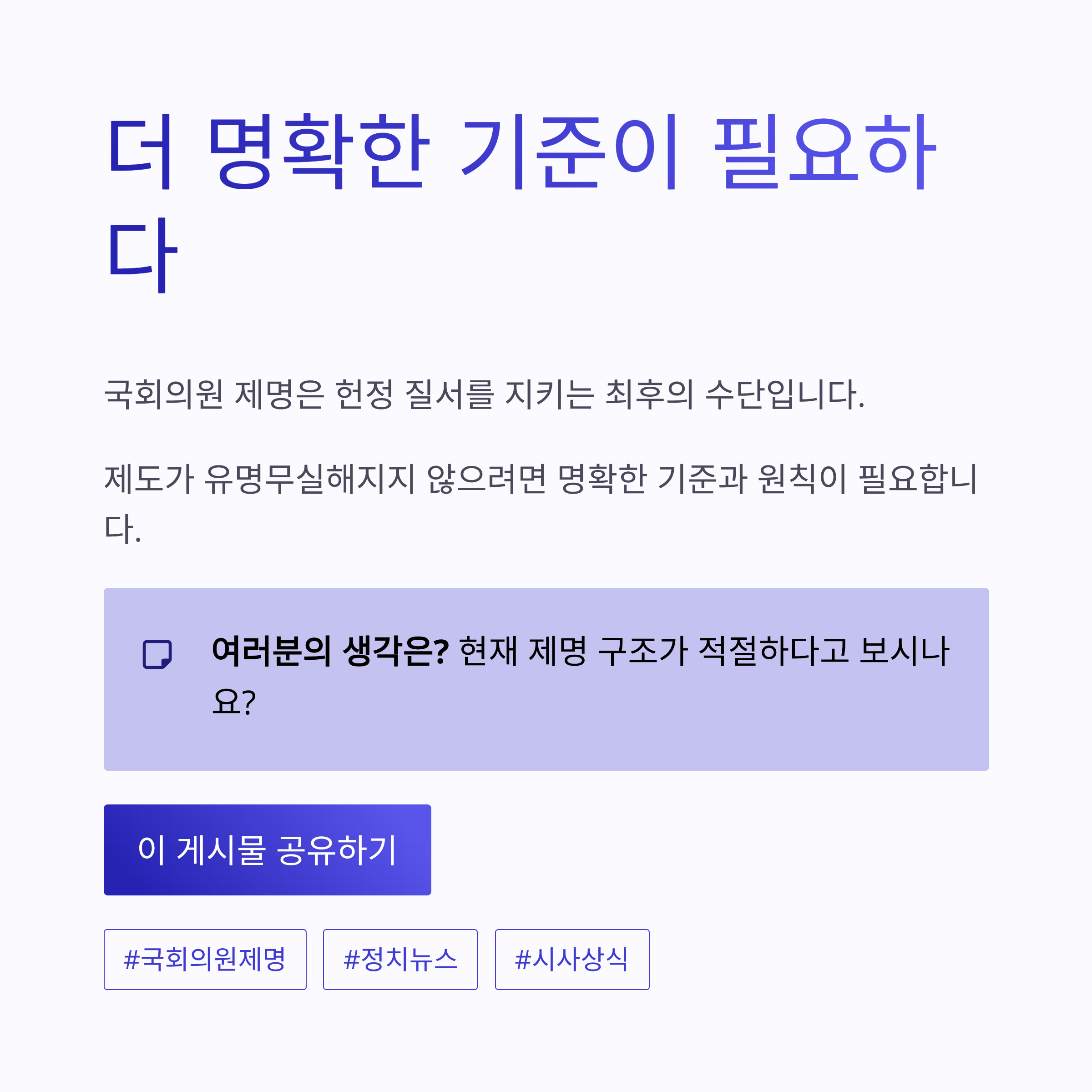 정리해보면 국회의원 제명은 단순한 징계가 아니라, 헌정 질서와 직결된 최후의 수단입니다. 그래서 정치 뉴스에서 국회의원 제명 얘기만 나와도 이렇게 시끄러운 거겠죠. 개인적으로는 제도가 너무 유명무실해지지 않으려면, 최소한의 기준과 원칙은 좀 더 명확해졌으면 좋겠다는 생각도 들더라구요. 여러분은 어떻게 보시나요? 국회의원 제명, 지금 구조가 맞다고 느껴지시나요?