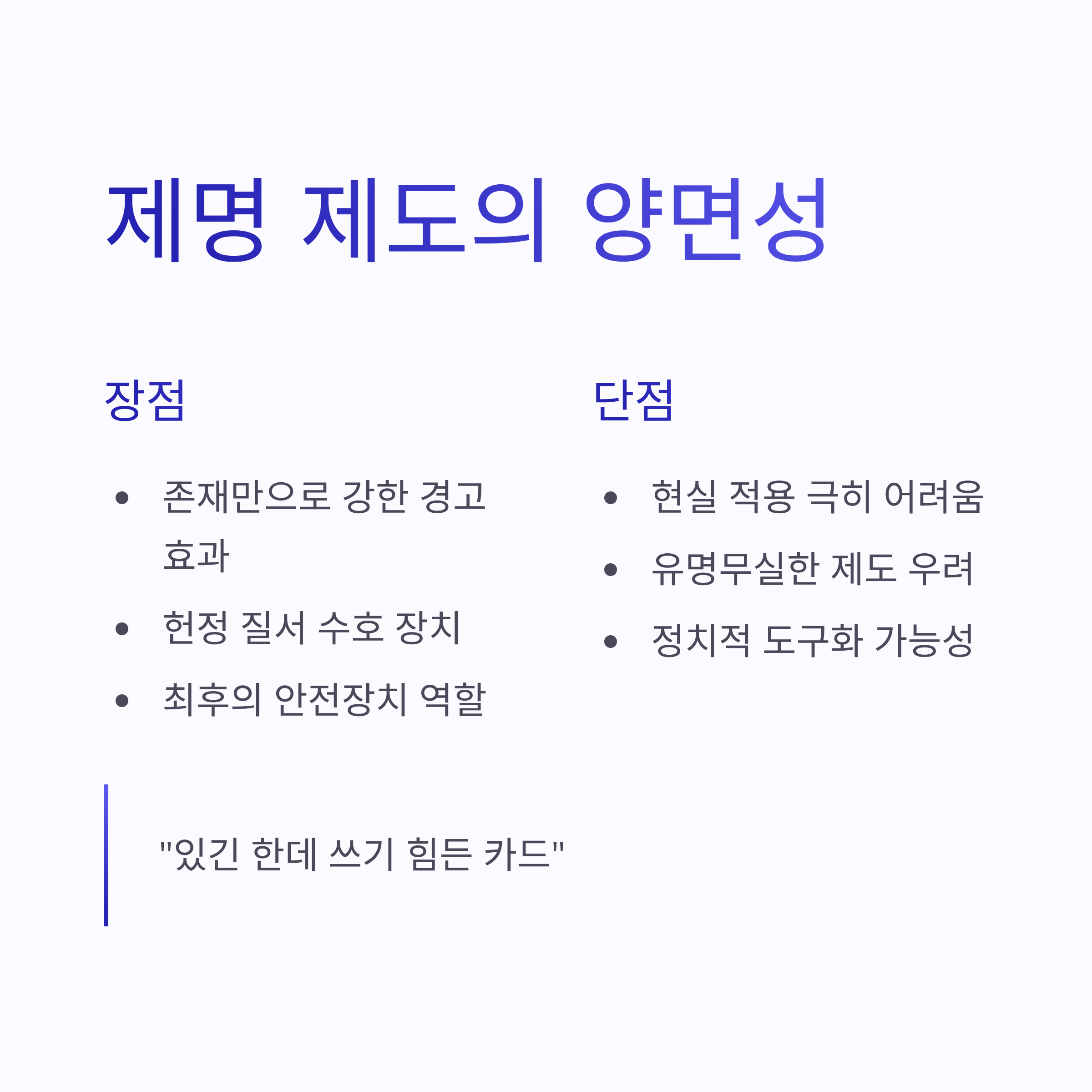 현실적으로 국회의원 제명은 거의 일어나지 않습니다. 실제 사례를 봐도 손에 꼽을 정도예요. 이유는 단순합니다. 국회의원 제명은 정치적 부담이 너무 커요. 한 사람을 제명하는 순간, 정당 간 갈등이 폭발하고 여론도 양쪽으로 갈리거든요. 그래서 대부분은 제명까지 안 가고 출당, 제명 권고, 공개 사과 같은 선에서 정리되는 경우가 많았습니다. 장점이라면, 제명 제도가 존재 자체만으로도 국회의원들에게 강한 경고 효과가 있다는 점? 단점은… 현실 적용이 너무 어렵다는 거죠. 솔직히 “있긴 한데 쓰기 힘든 카드” 느낌이랄까용 ㅋㅋ