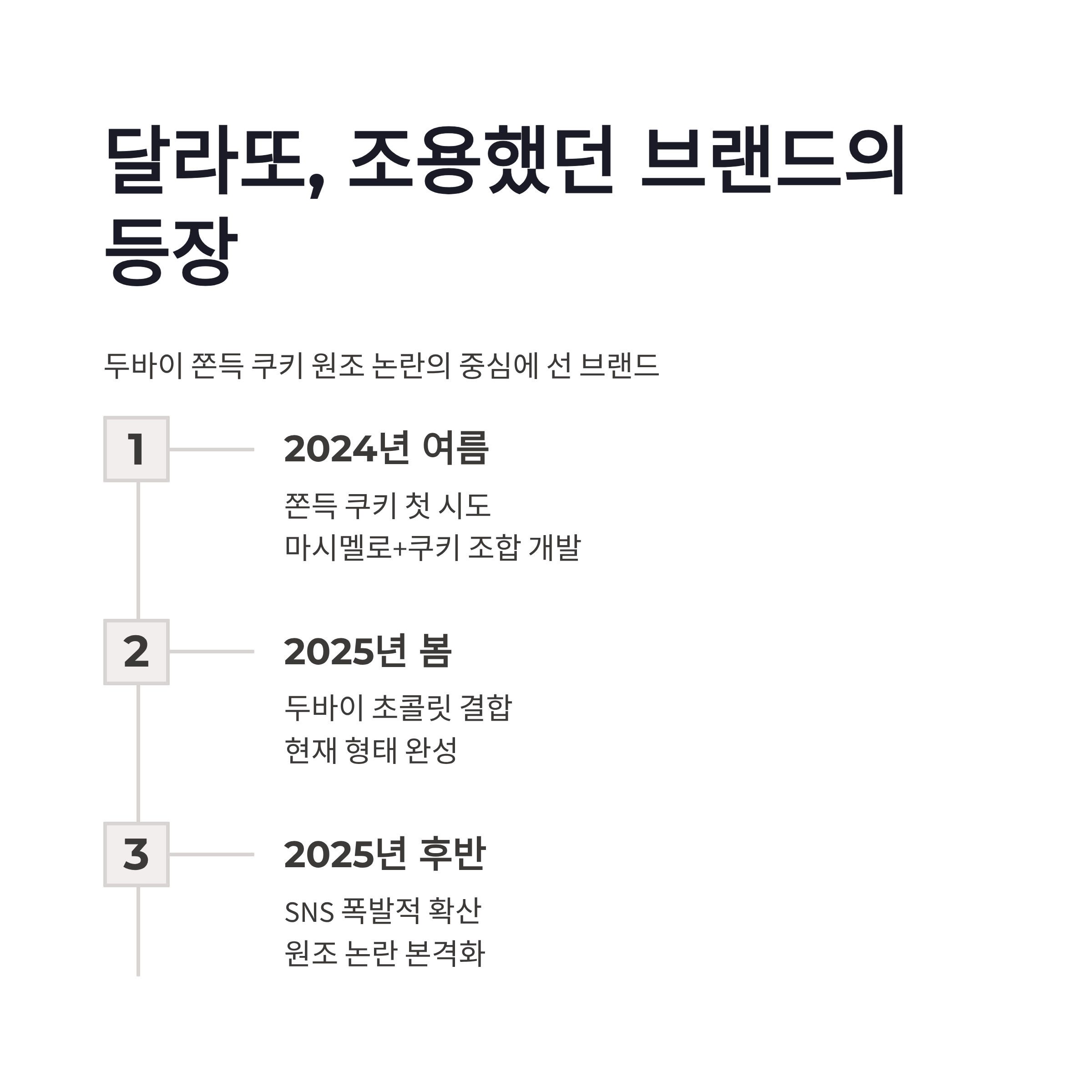 이 표로 보니까, 두바이 쫀득 쿠키 원조 논란이 왜 나올 수밖에 없었는지도 좀 보이더라구요. 유행은 빠른데, 과정은 길었으니까요.