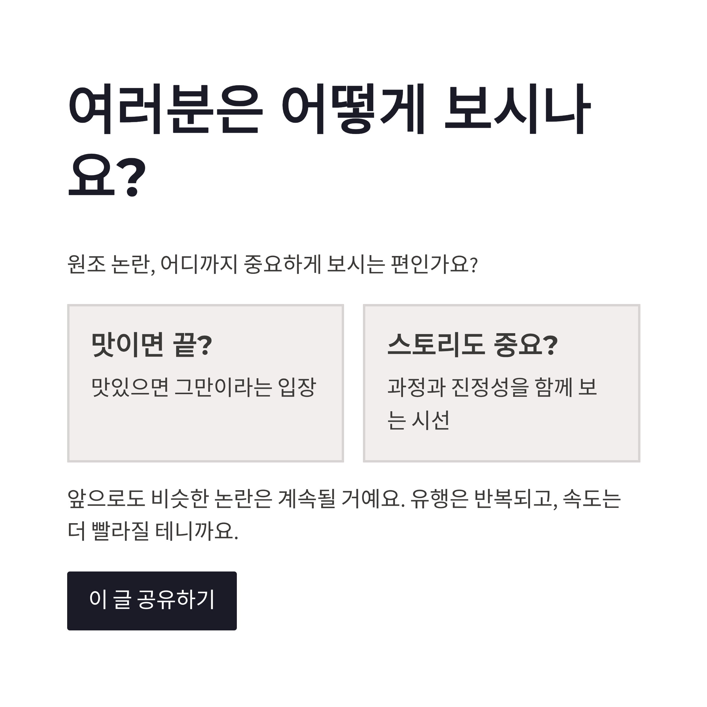 결국 저는 이렇게 생각하게 됐어요. 두바이 쫀득 쿠키 원조 논란이 있다고 해서, 당장 맛이 달라지는 건 아니잖아요. 그래도 이런 이야기를 알고 먹으면, 한 입의 무게가 조금 달라지긴 하더라구요. 그냥 유행 디저트가 아니라, 누군가의 시행착오가 쌓인 결과라는 느낌? 앞으로도 비슷한 논란은 계속 나올 것 같아요. 유행은 반복되고, 속도는 더 빨라질 테니까요. 여러분은 이런 원조 논란, 어디까지 중요하게 보시는 편인가요? 그냥 맛이면 끝인가요, 아니면 스토리도 함께 보는 쪽이신가요. 저는 요즘은… 둘 다 보게 되더라구요 ㅎㅎ