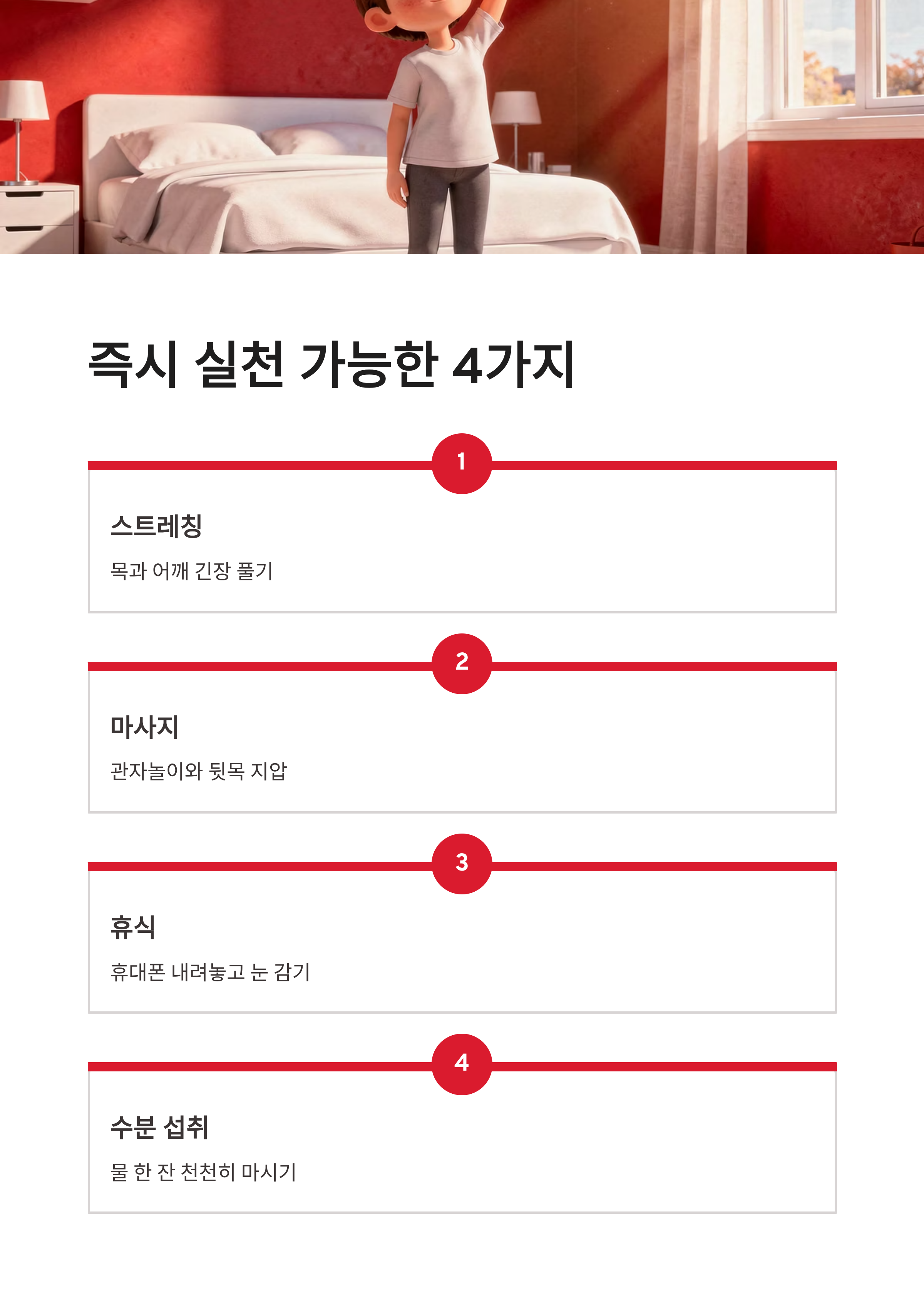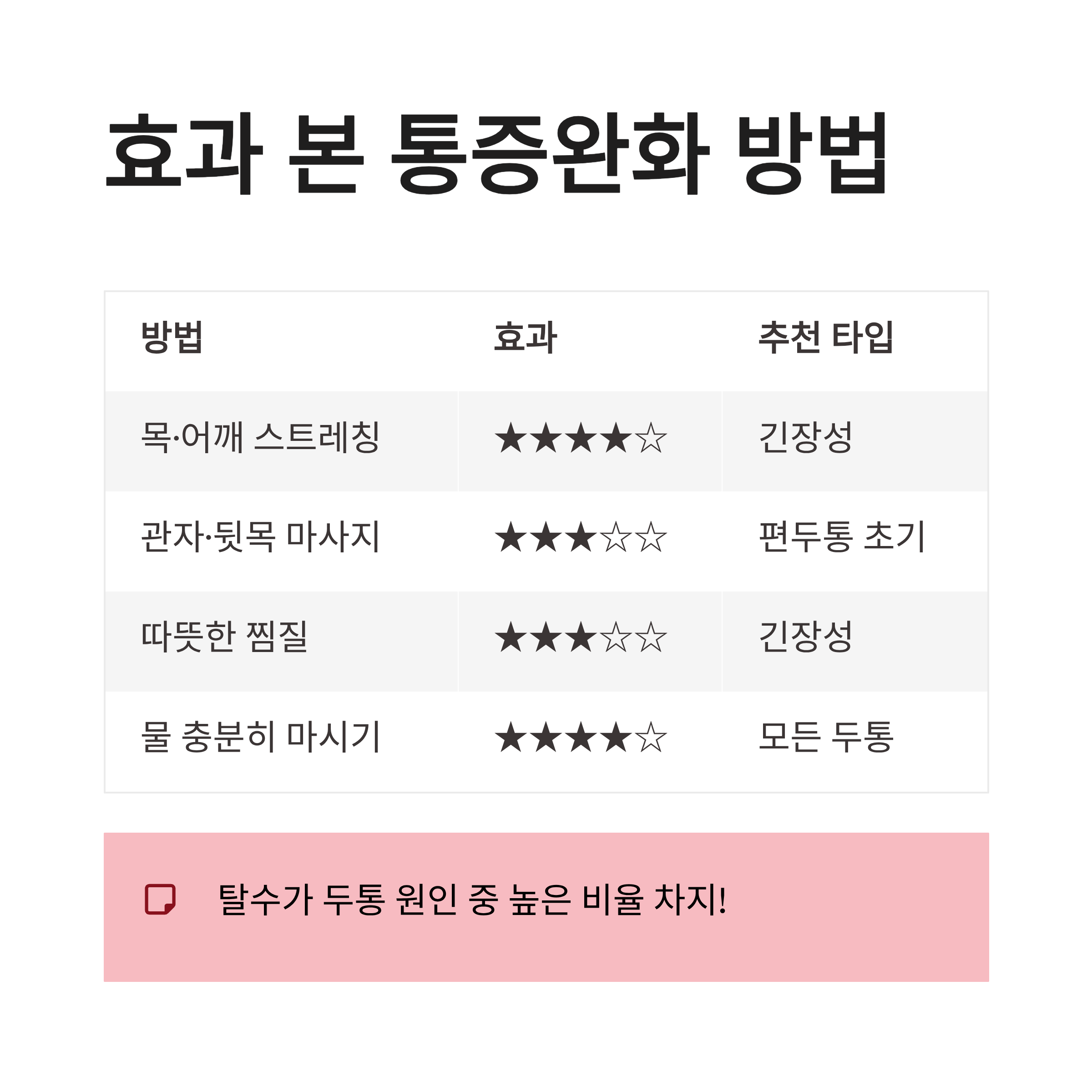 | 목·어깨 스트레칭 | ★★★★☆ | 뻐근한 두통에 바로 풀림 |