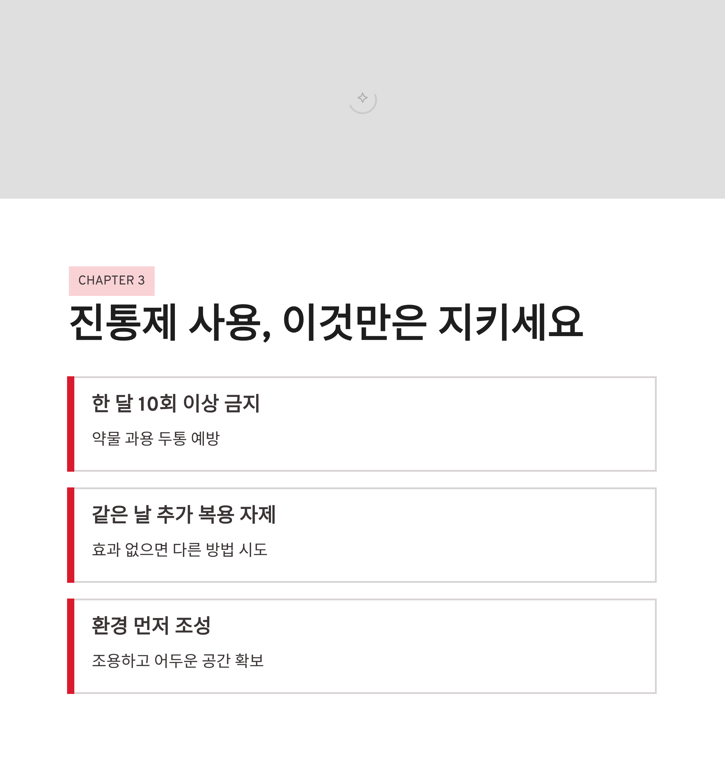 그래서 저는 원칙을 정했어요. ✔ 한 달에 10회 이상은 안 먹기 ✔ 효과 없으면 같은 날 추가 복용 안 하기 ✔ 편두통이면 무조건 조용한 환경 먼저