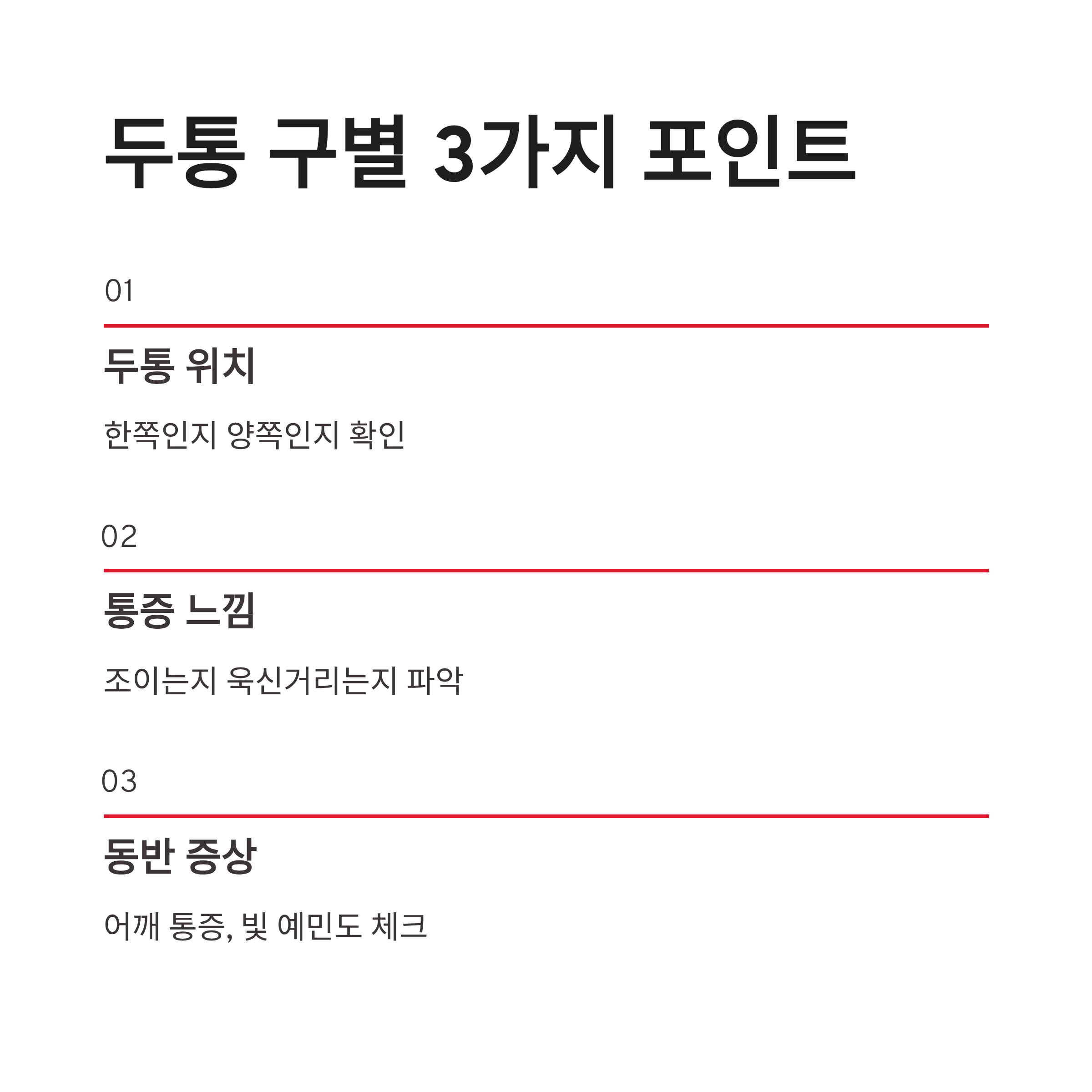 중요한 포인트는 이거예요. 두통 위치, 통증 느낌, 동반 증상. 이 세 가지만 봐도 대충 구별되더라구요.