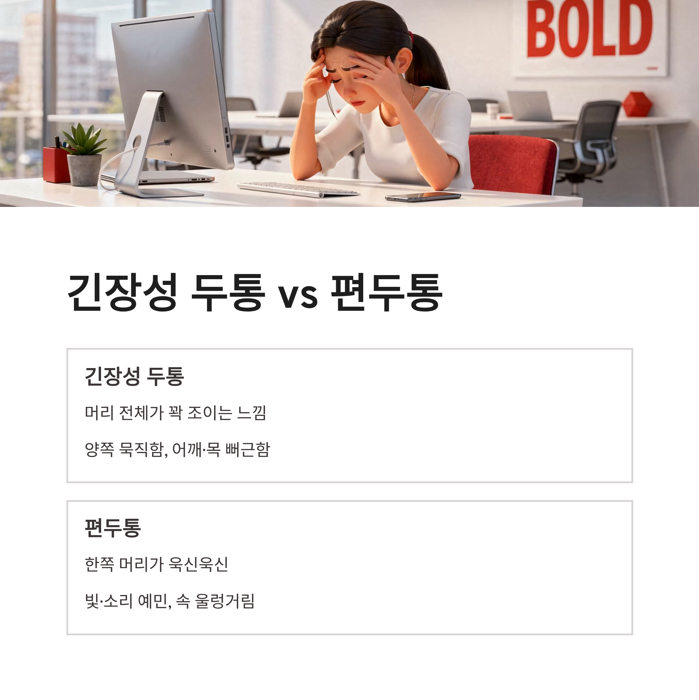 긴장성 두통은 머리 전체가 꽉 조이는 느낌이에요. 양쪽이 묵직하고, 어깨랑 목까지 같이 뻐근한 경우가 많았어요. 저는 장시간 컴퓨터 볼 때 특히 심해지더라구요. 반면 편두통은 한쪽 머리가 욱신욱신… 빛이나 소리에 예민해지고 속도 울렁거리고요. 이때는 진짜 조용한 데서 눈 감고 싶어져요 ㅠㅠ