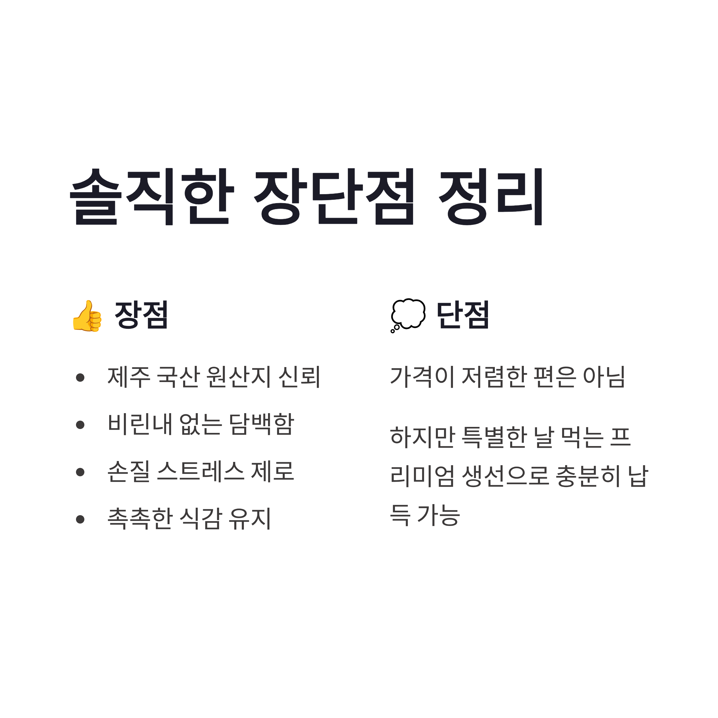 요즘은 너무 짜거나 기름진 생선보다, 깔끔하게 먹을 수 있는 쪽으로 많이 가잖아요. 그런 흐름에서 똑똑제주 반건조 참옥돔은 확실히 장점이 분명합니다. 단백질은 풍부한데 지방 부담은 적고, 굽거나 찌기만 해도 맛이 살아나요. 단점이라면 가격이 저렴한 편은 아니라는 점인데요. 그래도 특별한 날 먹는 제주 옥돔이라 생각하면 납득 가는 수준이었슴다. 냉동실에 하나 있으면 괜히 든든한 그런 생선이에요.