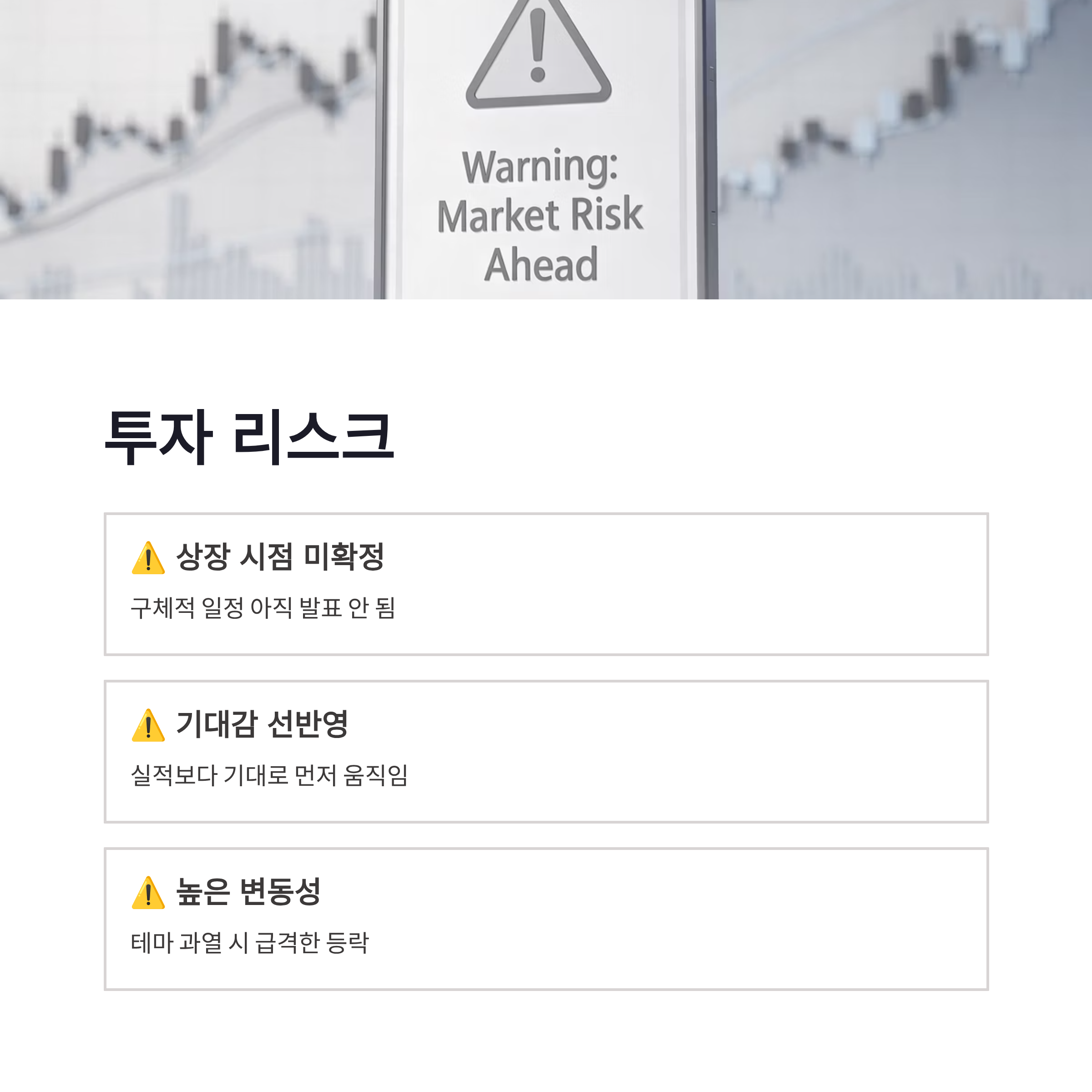 * 상장 시점은 아직 확정 아님 * 실적보단 기대감이 먼저 움직임 * 테마 과열 시 변동성 큼