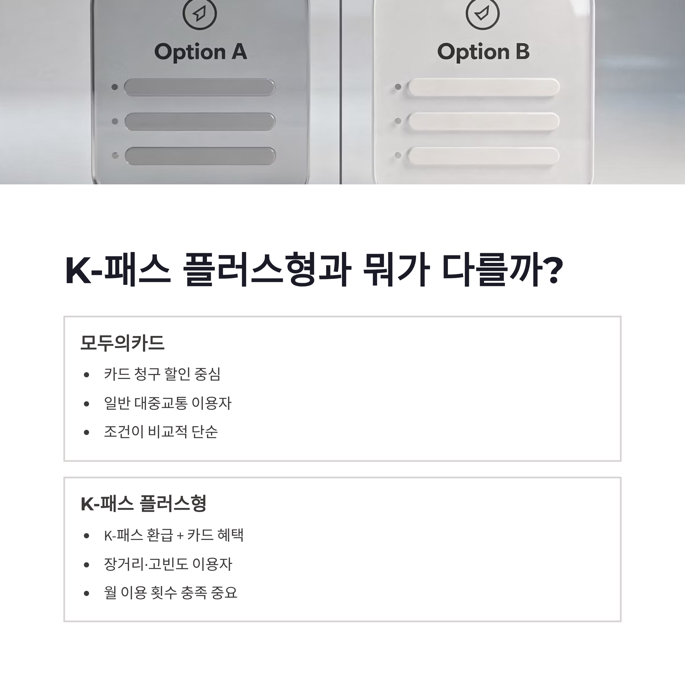 제가 느낀 차이는 이거였어요. 짧게 자주 타면 모두의카드, 장거리 이동 많으면 K-패스 플러스형이 유리하더라구요. 연관 키워드로 많이 나오는 교통비 환급, 대중교통 할인, GTX 교통카드 이 조합이 딱 맞아떨어지는 느낌이었어요.