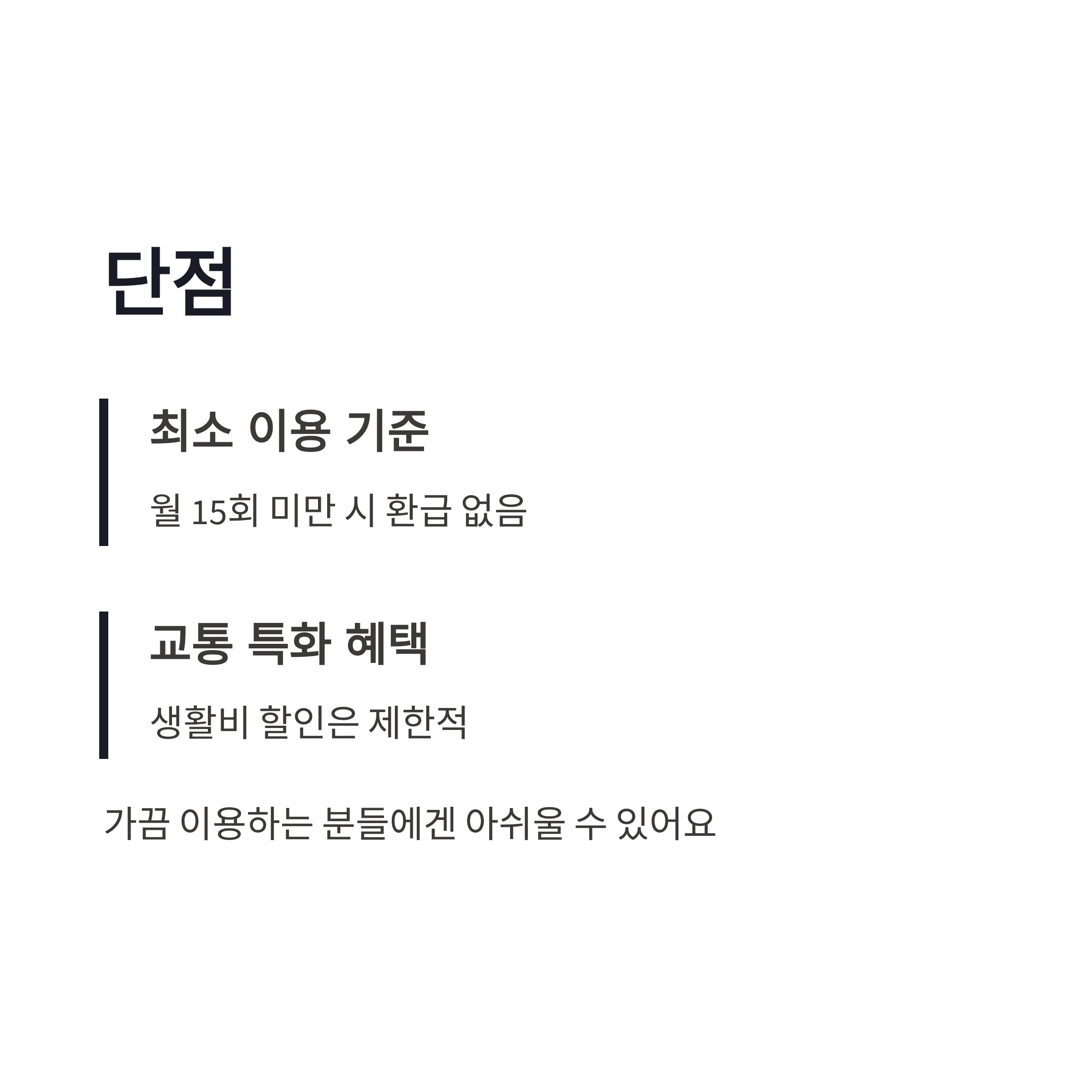 2026년 기준으로 보면 모두의카드 발급 신청의 장점은 꽤 명확합니다. 일단 전국 대중교통 대부분이 적용되고, GTX나 광역버스처럼 비싼 노선일수록 환급 체감이 커요. 자동 계산이라 귀찮음도 없구요. 반대로 단점도 있긴 합니다. 월 15회 미만이면 환급이 없어서 대중교통을 가끔만 타는 분들한텐 애매할 수 있어요. 또 카드 혜택이 교통 쪽에 집중돼 있어서, 생활비 할인용으로는 아쉬울 수 있구요. 그래도 출퇴근 위주라면 모두의카드 발급 신청은 충분히 메리트 있다고 느꼈습니다.