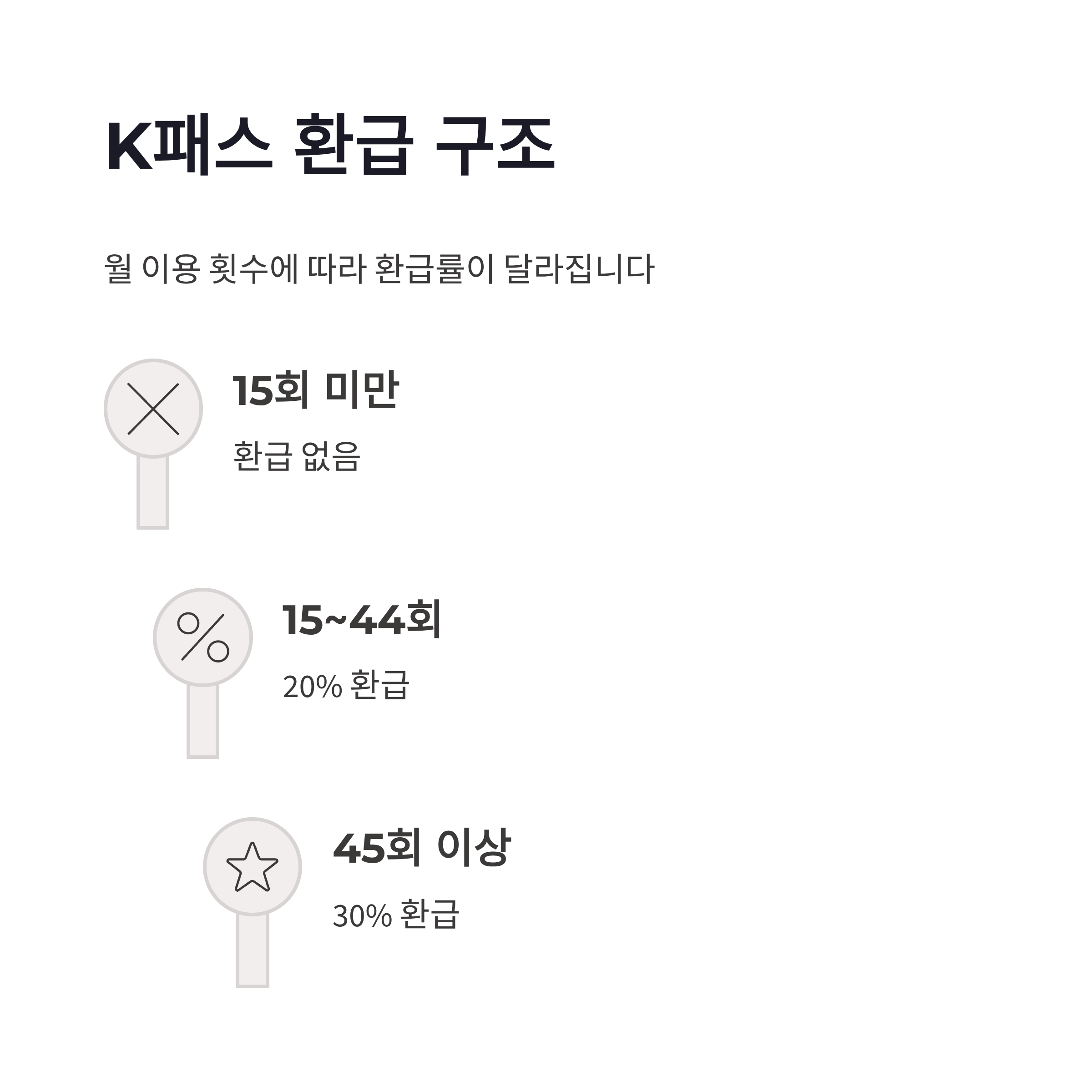 모두의카드 발급 신청하고 나면 꼭 같이 봐야 할 게 K패스 환급 방식이에요. 단순히 몇 % 할인 이런 게 아니라, 월 이용 횟수 기준으로 환급률이 달라집니다. 직접 써보면서 정리한 기준은 아래 표가 제일 이해가 쉽더라구요.