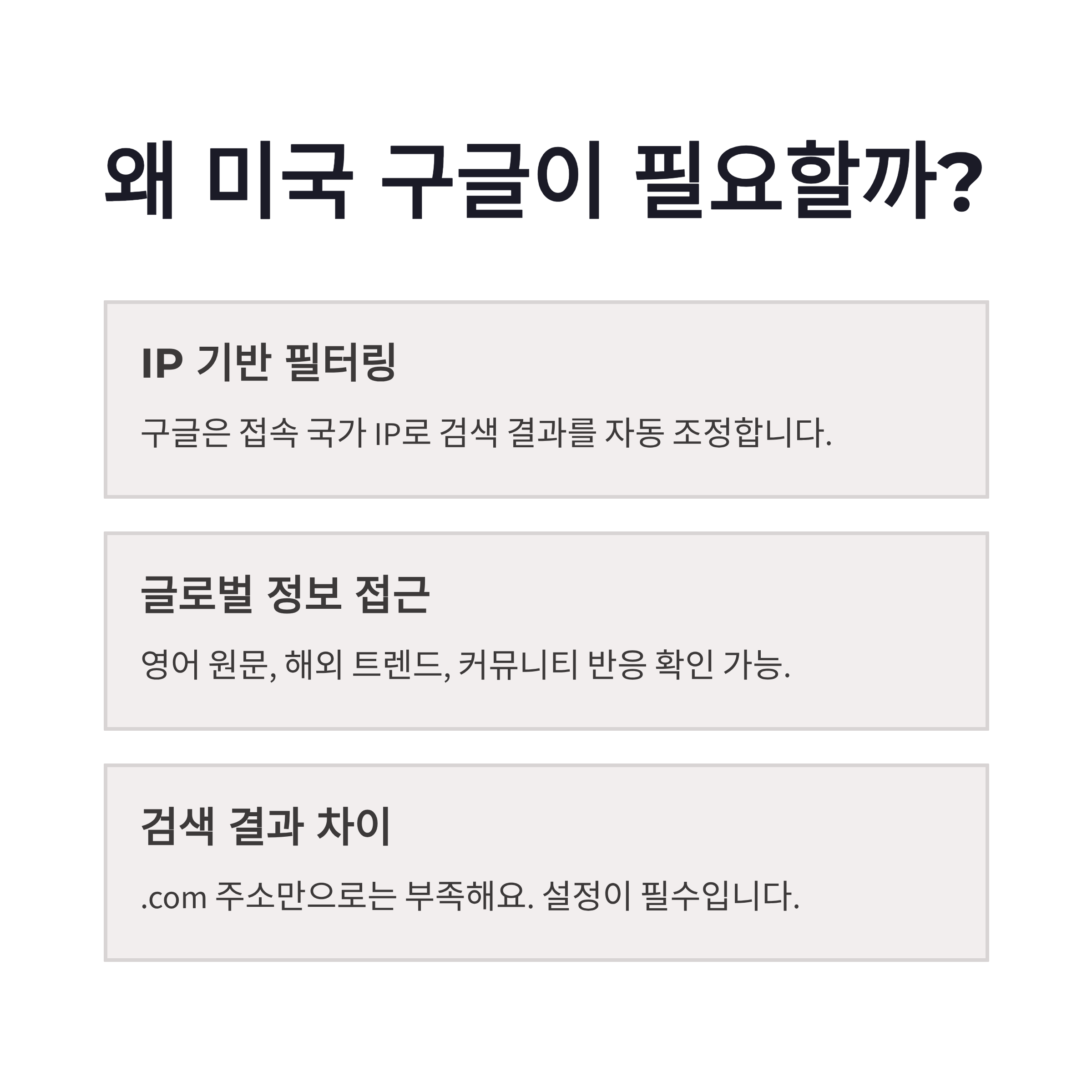 | 구분 | 설정 경로 | 핵심 포인트 | | -- | --------------- | --------- | | 1 | 구글 접속 → 하단 설정 | 시크릿모드 추천 | | 2 | 검색 설정 진입 | 로그인 영향 ↓ | | 3 | 기타 설정 → 언어 및 지역 | 여기 중요 | | 4 | 검색 결과 지역 | 미국 선택 |