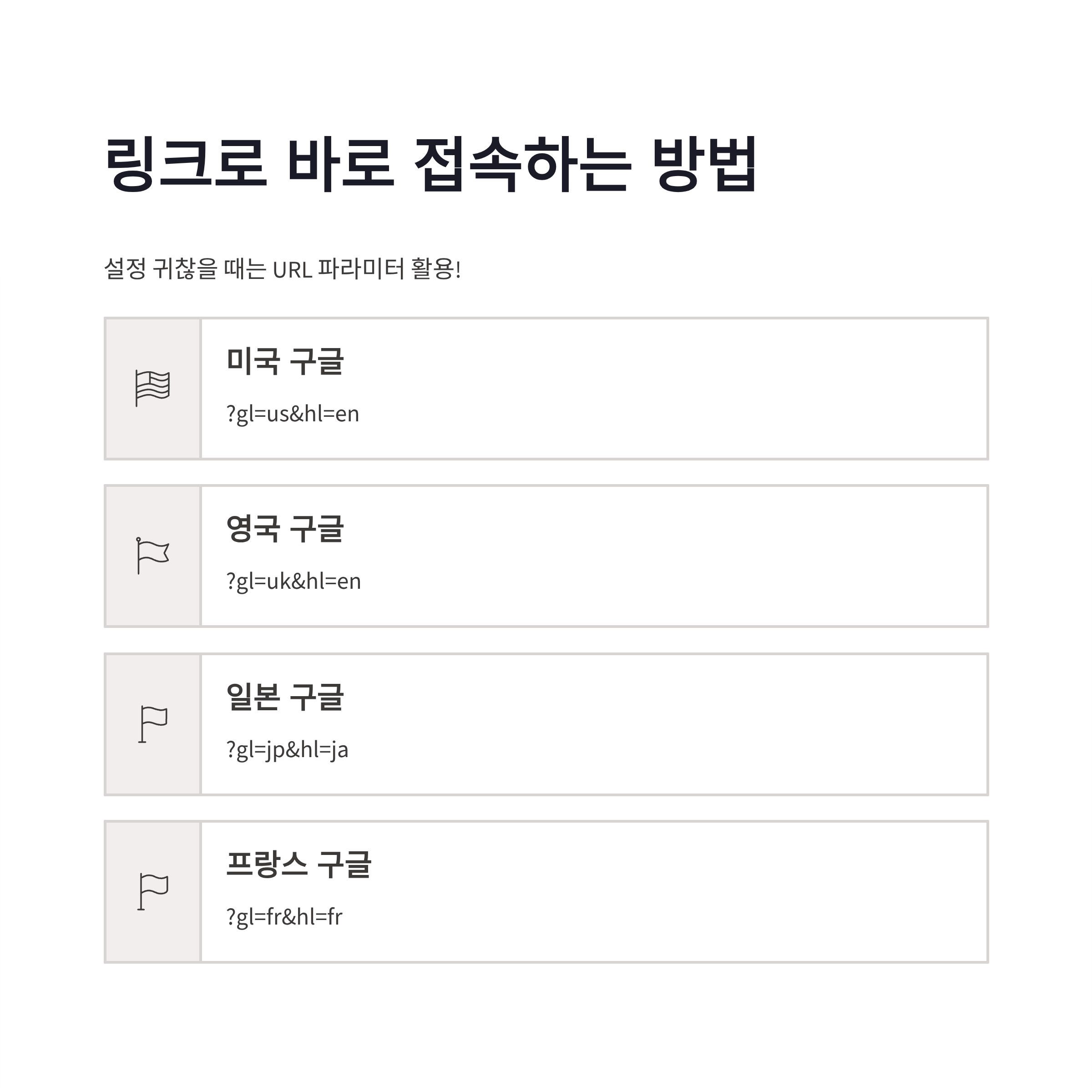* 미국 구글: `?gl=us&hl=en` * 영국 구글: `?gl=uk&hl=en` * 일본 구글: `?gl=jp&hl=ja` * 프랑스 구글: `?gl=fr&hl=fr`