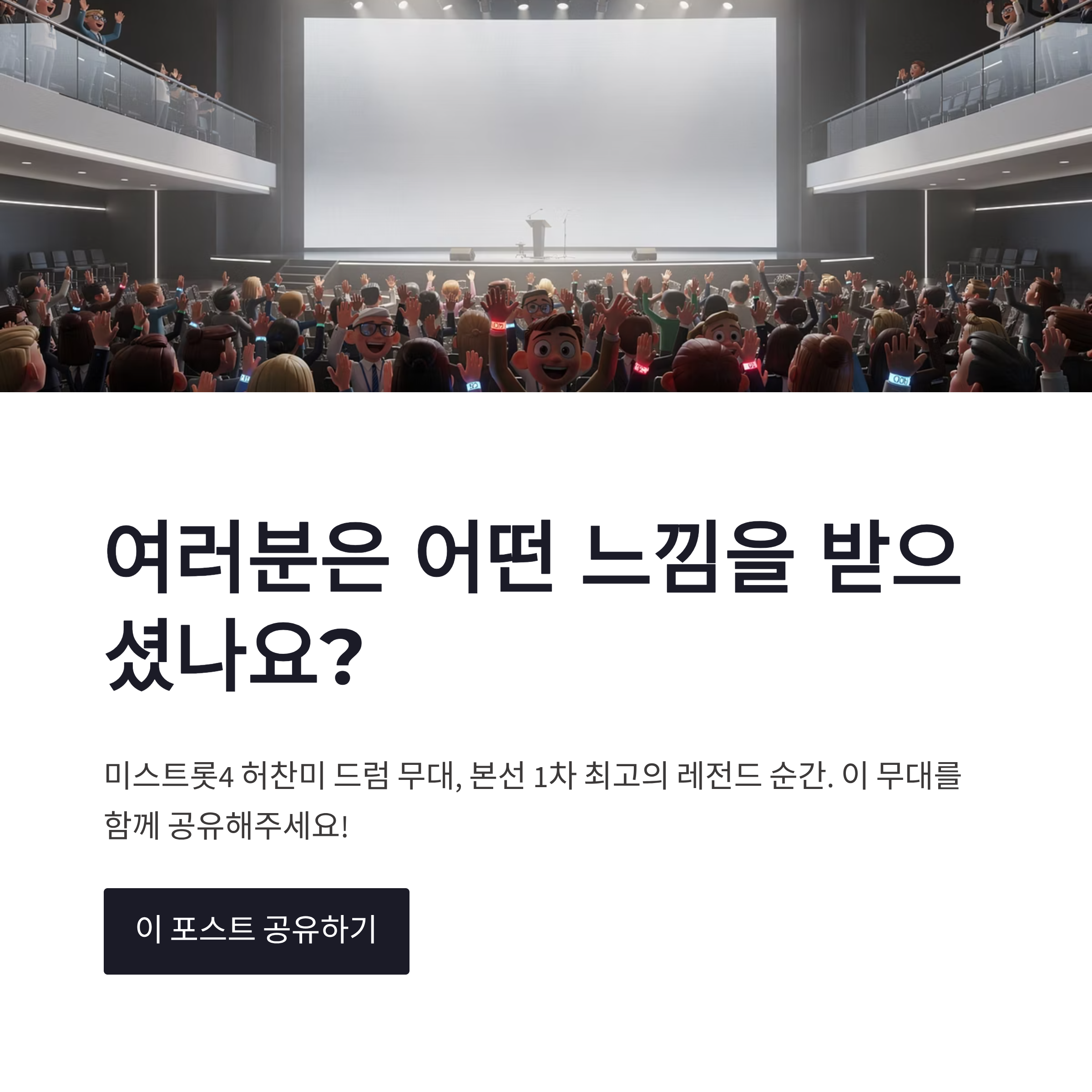 정리하자면 미스트롯4 허찬미 드럼 무대는 본선 1차에서 가장 강하게 기억에 남는 순간 중 하나였어요. 기술, 감정, 캐릭터까지 다 잡은 무대랄까. 앞으로 미스트롯4가 진행될수록 허찬미가 어떤 선택을 하고, 어떤 무대를 보여줄지 괜히 더 챙겨보게 될 것 같더라구요. 저만 그런 거 아니쥬? ㅎㅎ 여러분은 이 무대 보면서 어떤 느낌 받으셨나요. 다시 떠올려도 아직 여운이 남는 그런 무대였던 것 같아요.
