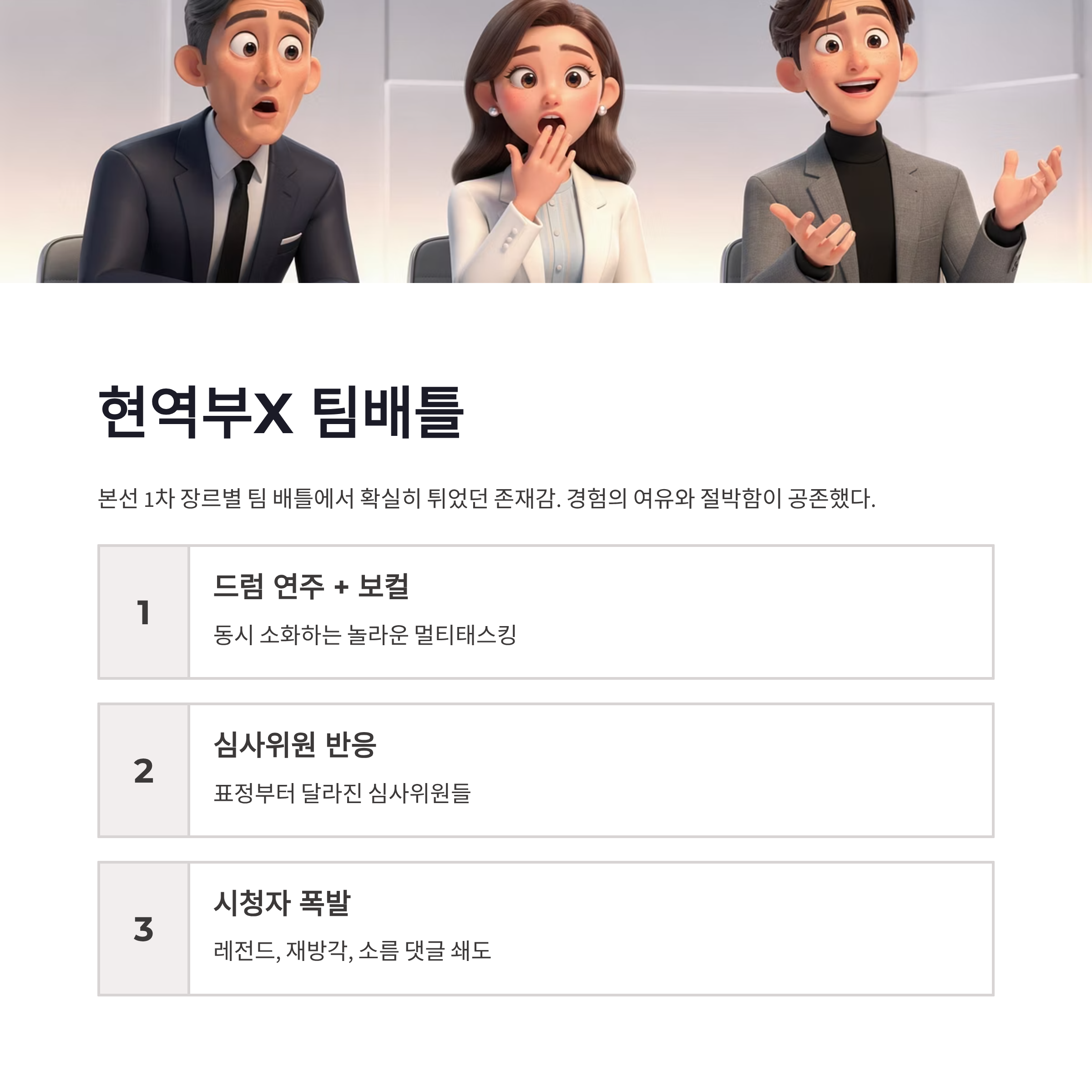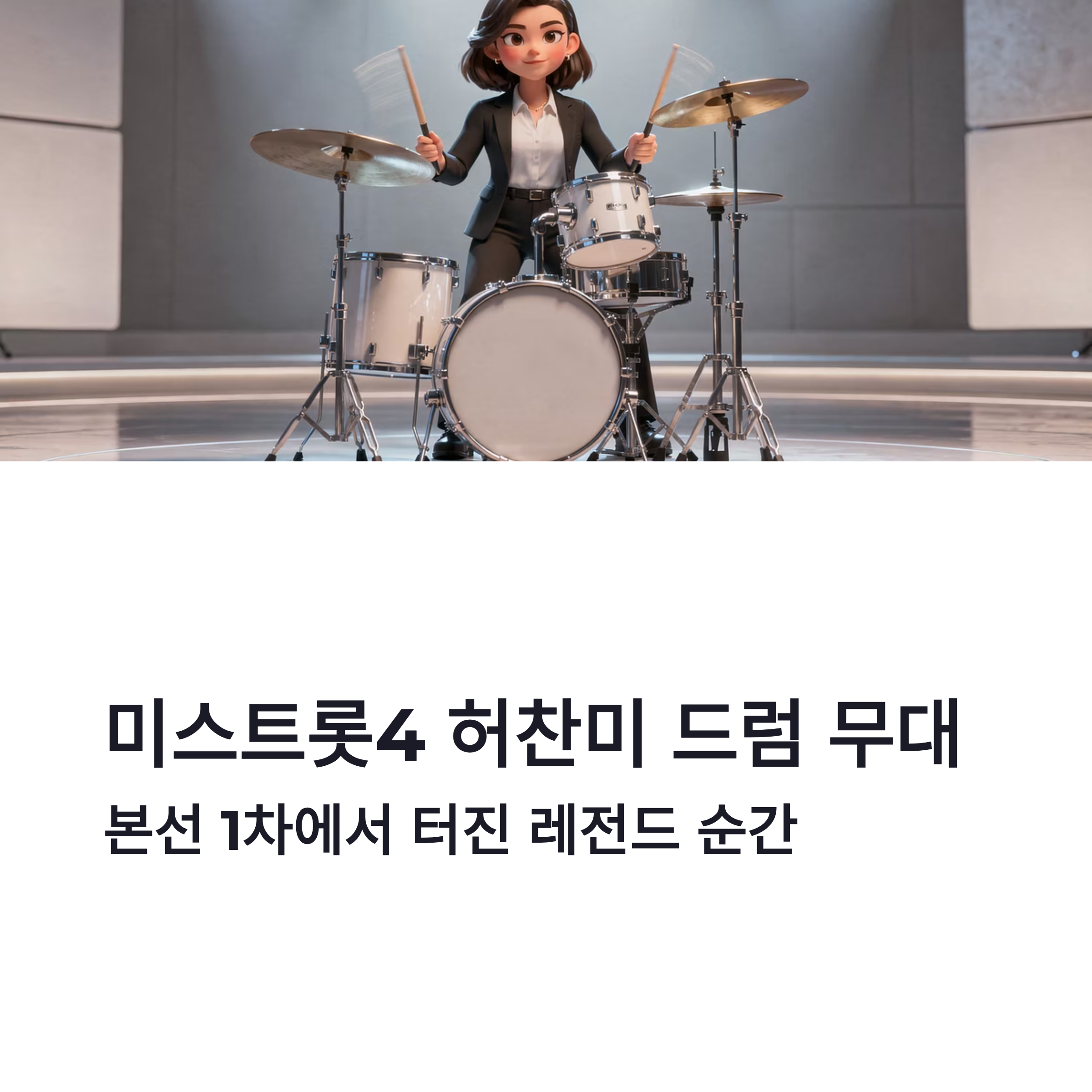 솔직히 말해서요, 미스트롯4 본선 1차전 보다가 저도 모르게 소리 나왔어요. “어… 뭐야?” 이런 느낌 ㅋㅋ 현역부X 팀 무대에서 허찬미가 드럼 스틱을 잡는 순간, 분위기가 확 바뀌더라구요. 그냥 노래 잘하는 참가자 중 한 명일 줄 알았는데, 그게 아니었음다. 드럼 앞에 앉자마자 무대 공기가 달라졌고, 관객도 심사위원도 동시에 집중하는 게 느껴졌어요. 진짜 오랜만에 소름 돋는 무대였구요. 단순한 퍼포먼스가 아니라, 음악을 몸으로 때려 넣는 느낌? 말이 좀 이상한데 진짜 그랬다니까요 ㅎㅎ 미스트롯4 허찬미 드럼 무대는 시작 몇 초 만에 “아 이건 남는다” 싶었어요.