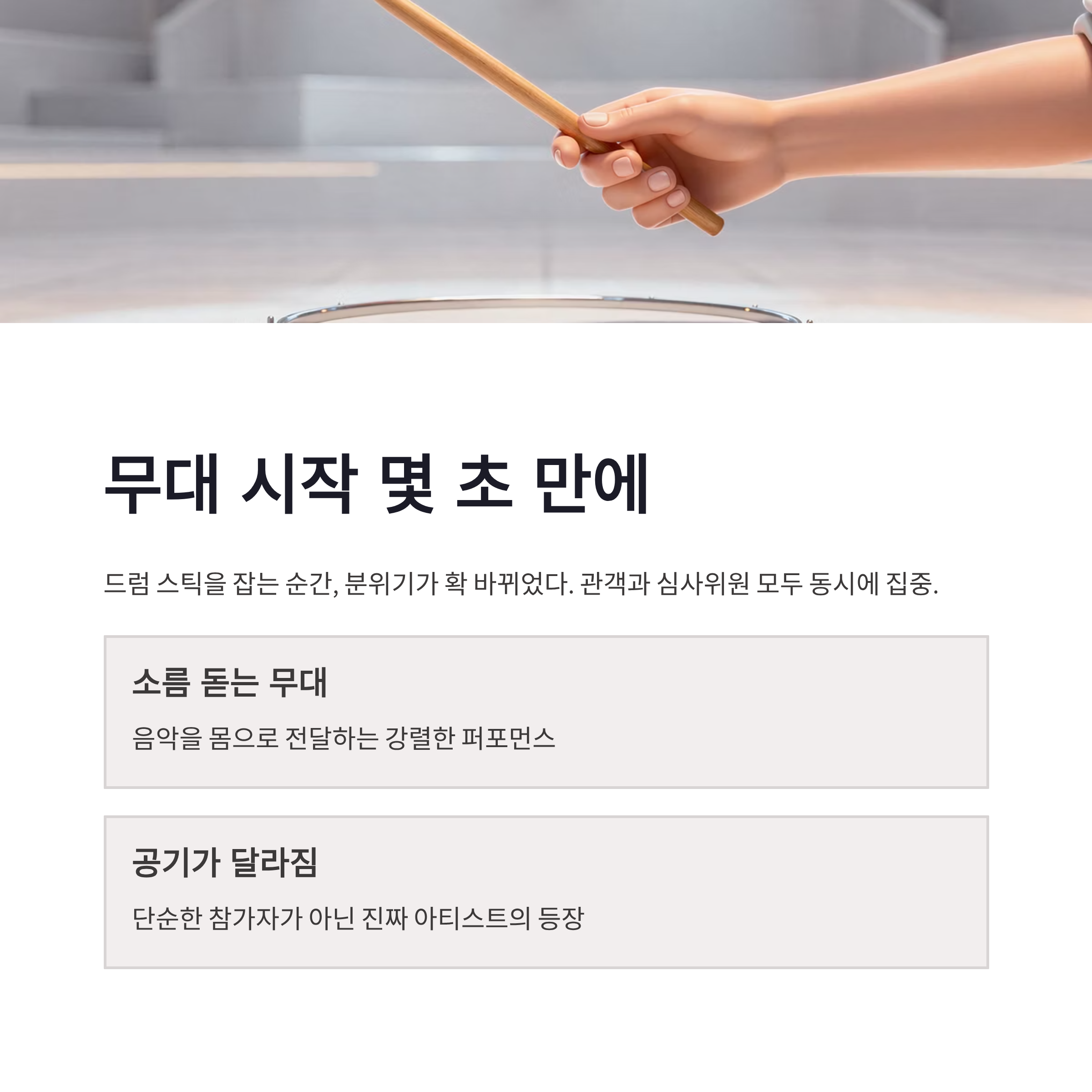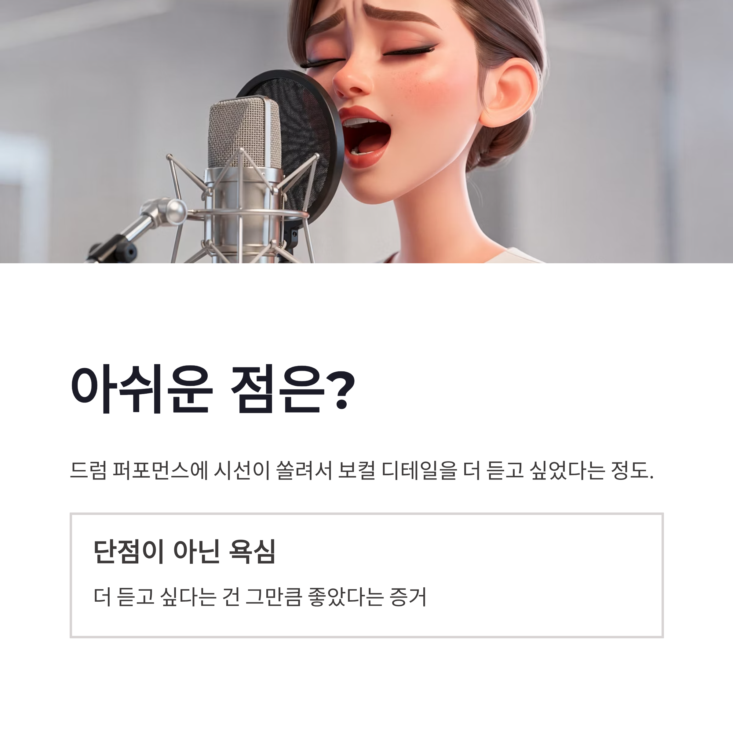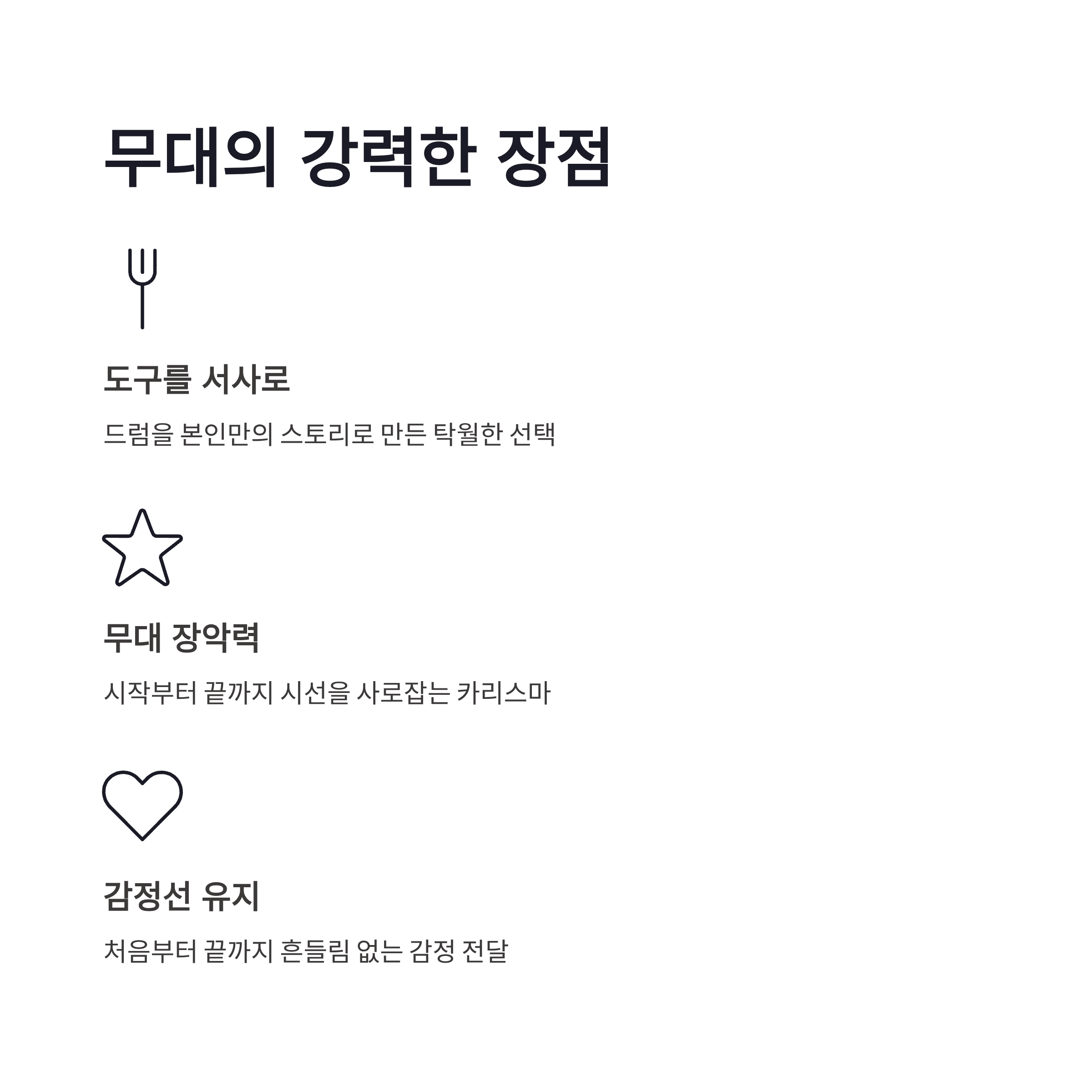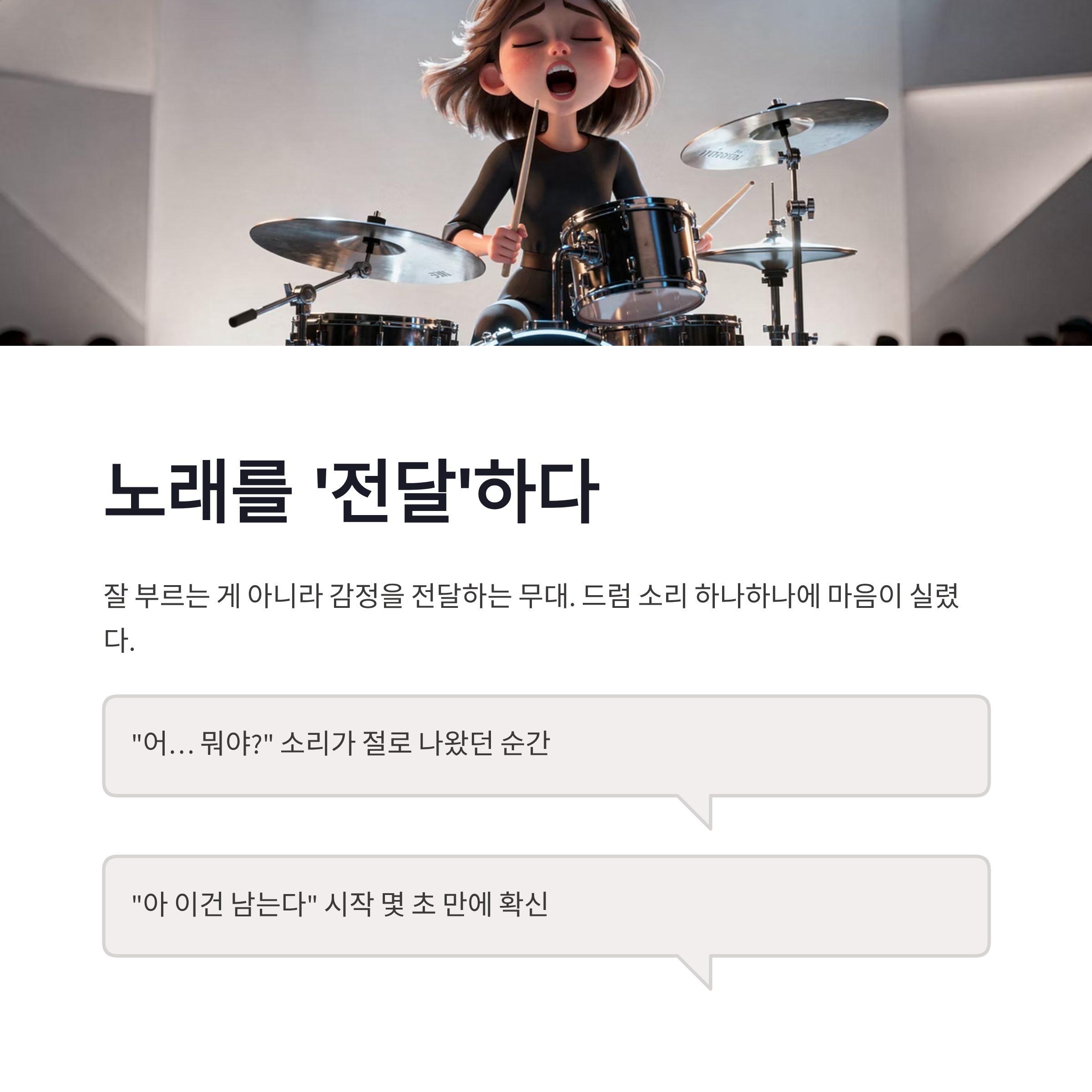| 무대 포인트 | 드럼 연주 + 보컬 동시 소화 |