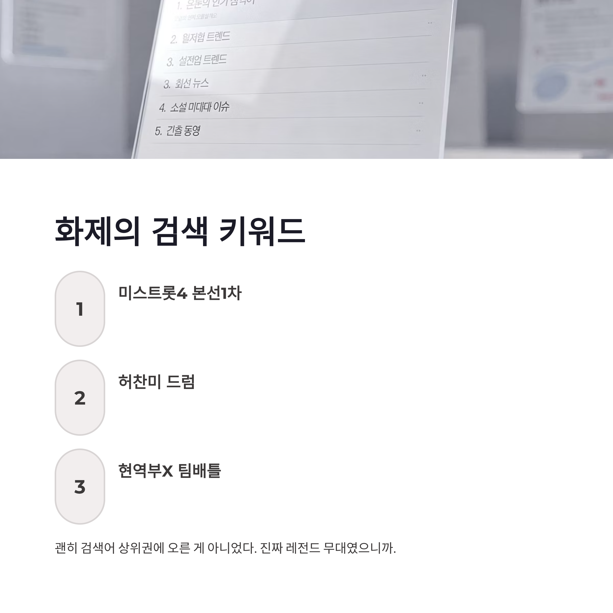 제가 느낀 건요, 미스트롯4 허찬미는 노래를 ‘잘’ 부르는 게 아니라 ‘전달’하더라구요. 드럼 소리 하나하나에 감정이 실려 있어서 괜히 마음이 쿵쿵… 연관해서 검색 많이 되는 키워드가 미스트롯4 본선1차, 허찬미 드럼, 현역부X 팀배틀 이런 것들이더라구요. 괜히 그런 게 아닌 듯했어요.