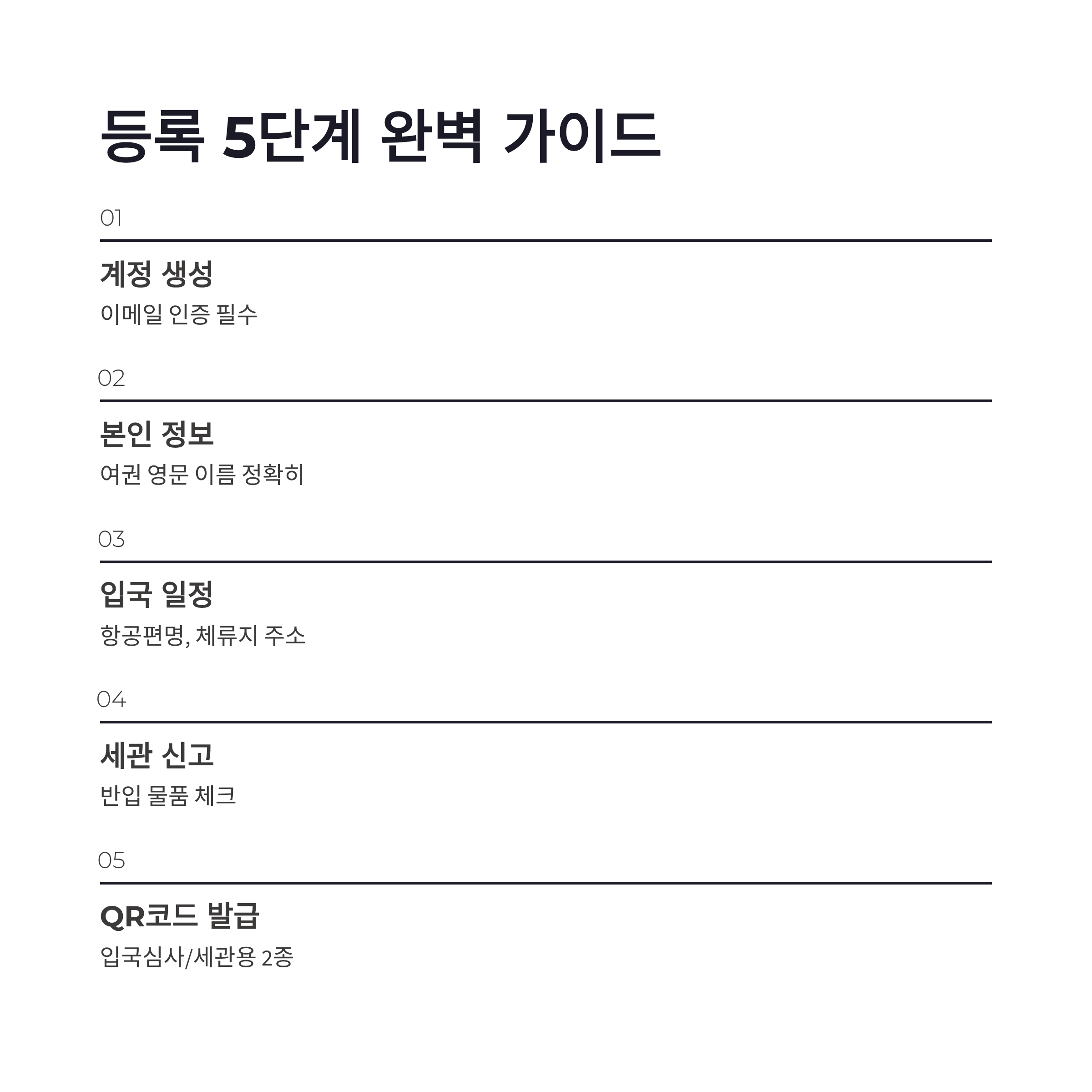 | 단계 | 입력 내용 | 체크 포인트 | | -- | -------- | -------------- | | 1 | 계정 생성 | 이메일 인증 필수 | | 2 | 본인 정보 등록 | 여권 영문 이름 정확히 | | 3 | 입국 일정 입력 | 항공편명, 체류지 주소 | | 4 | 세관 신고 작성 | 반입 물품 여부 체크 | | 5 | QR코드 발급 | 입국심사/세관용 2종 생성 |