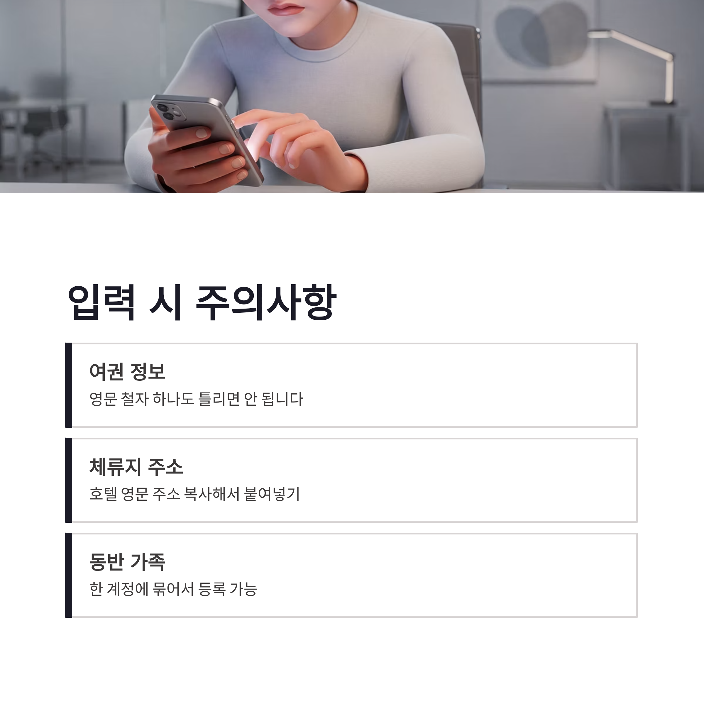 제가 해보니 체류지 주소 입력에서 잠깐 멈췄어요. 호텔 영문 주소 복붙하면 편하더라구요 ㅎㅎ 그리고 동반 가족은 ‘동반자 추가’ 기능으로 한 계정에 묶을 수 있습니다. 이거 진짜 편했어요.
