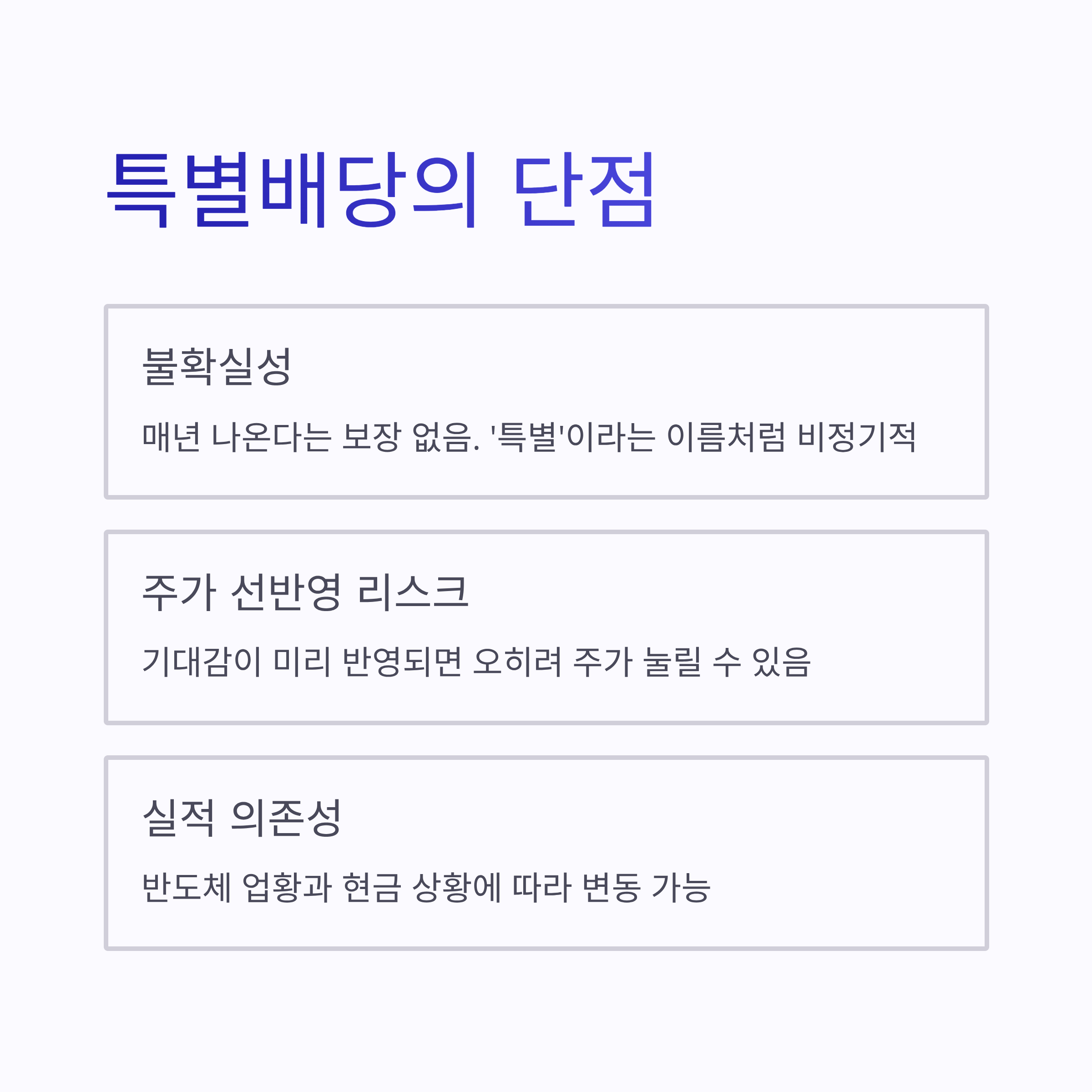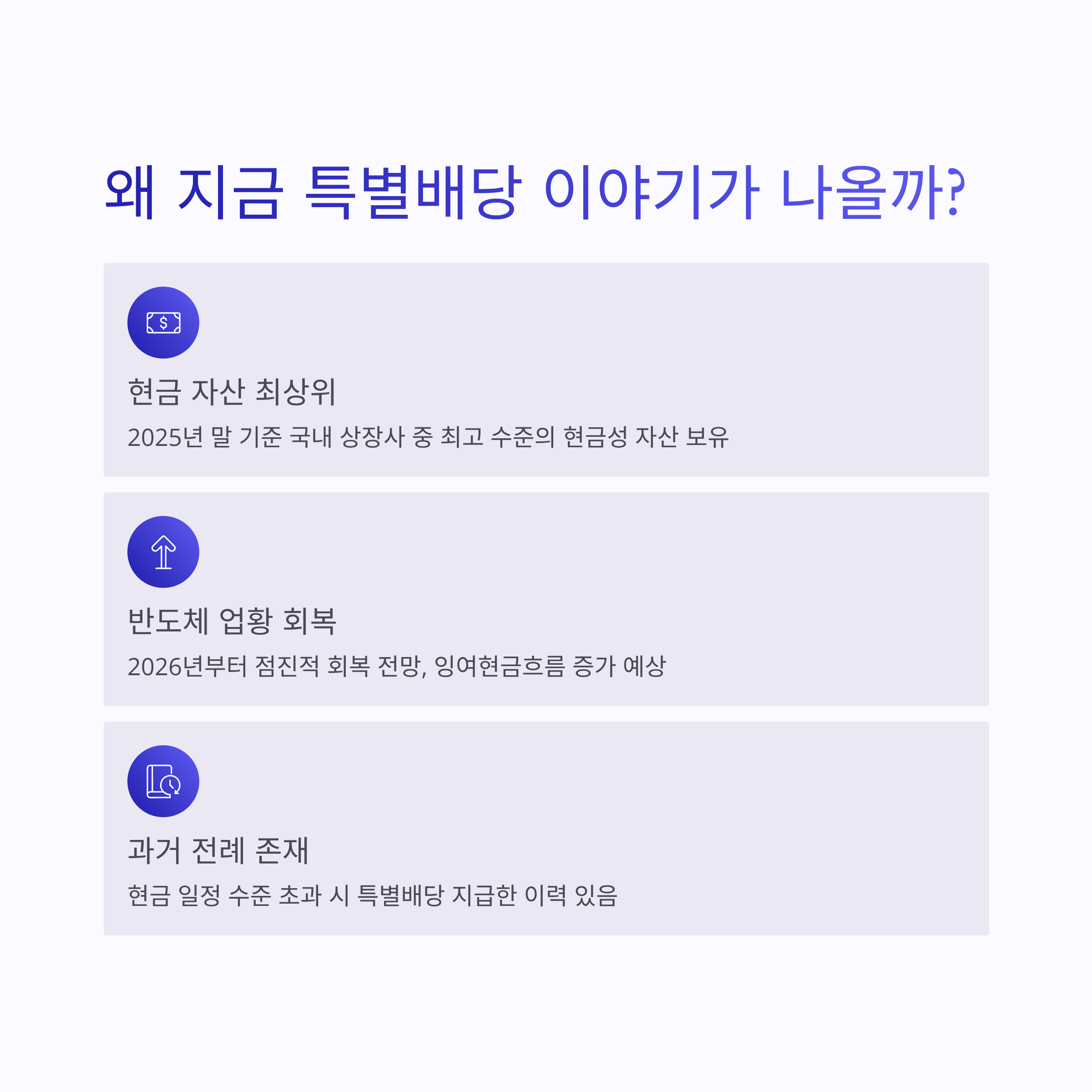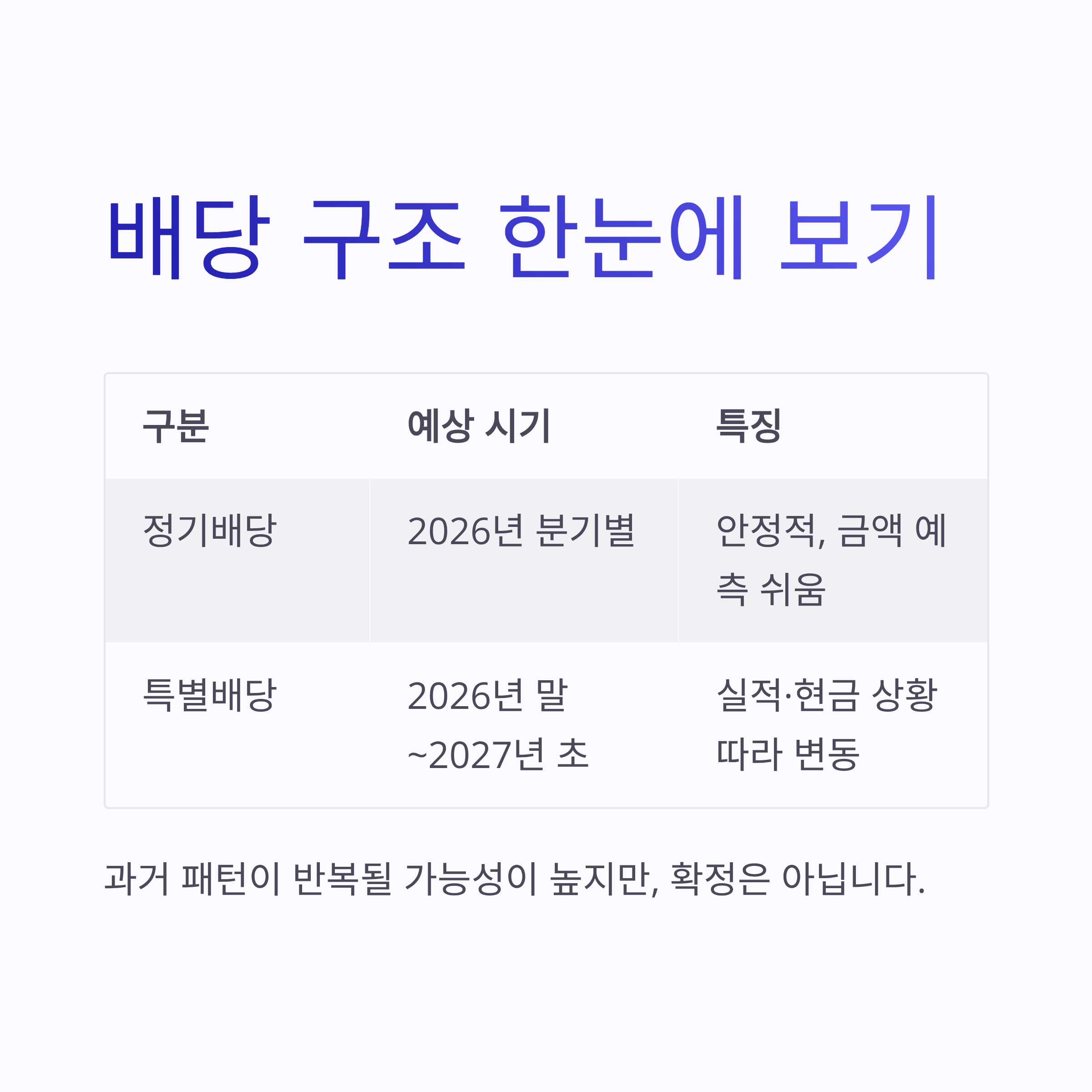 | 특별배당 | 2026년 말~2027년 초 | 실적·현금 상황 따라 변동 |