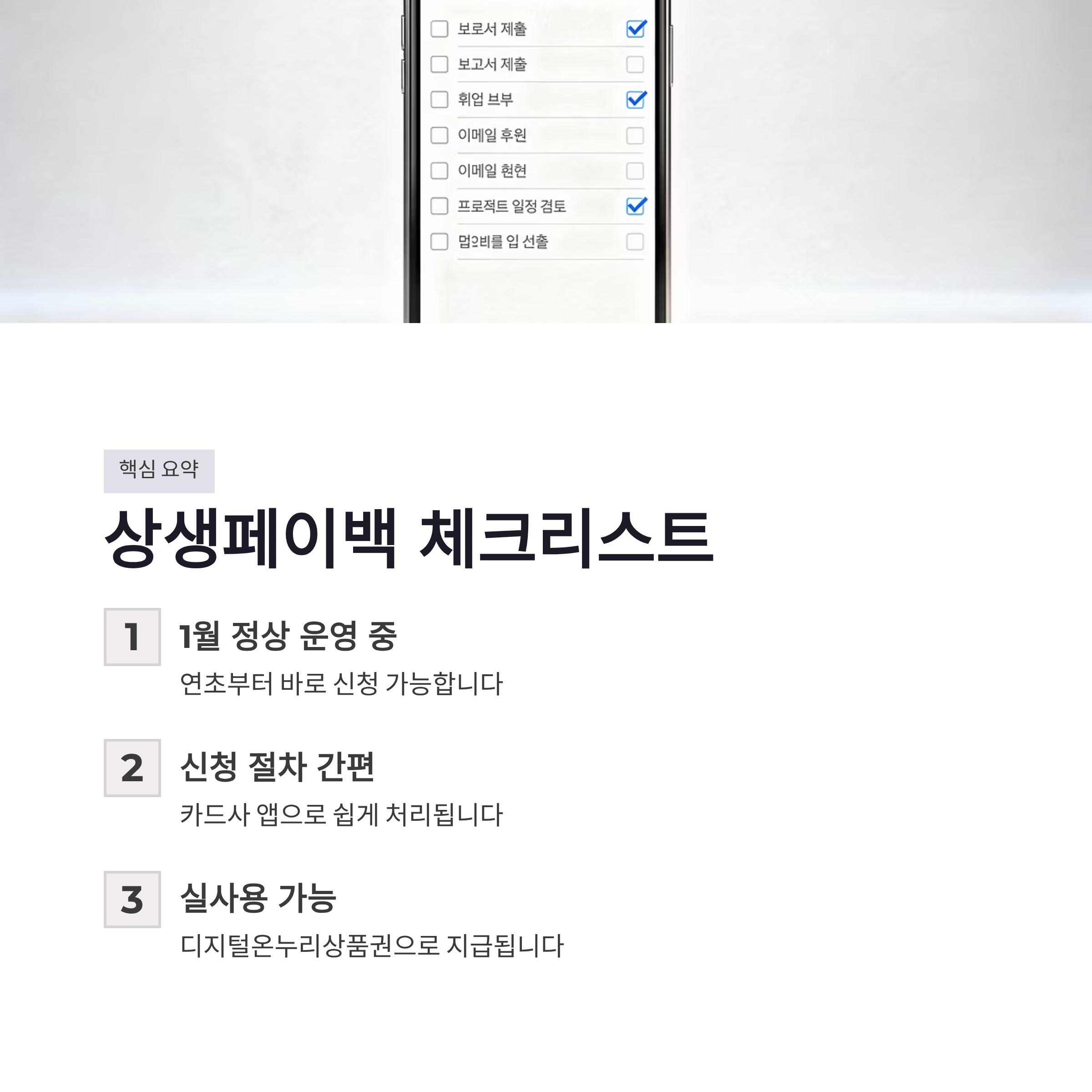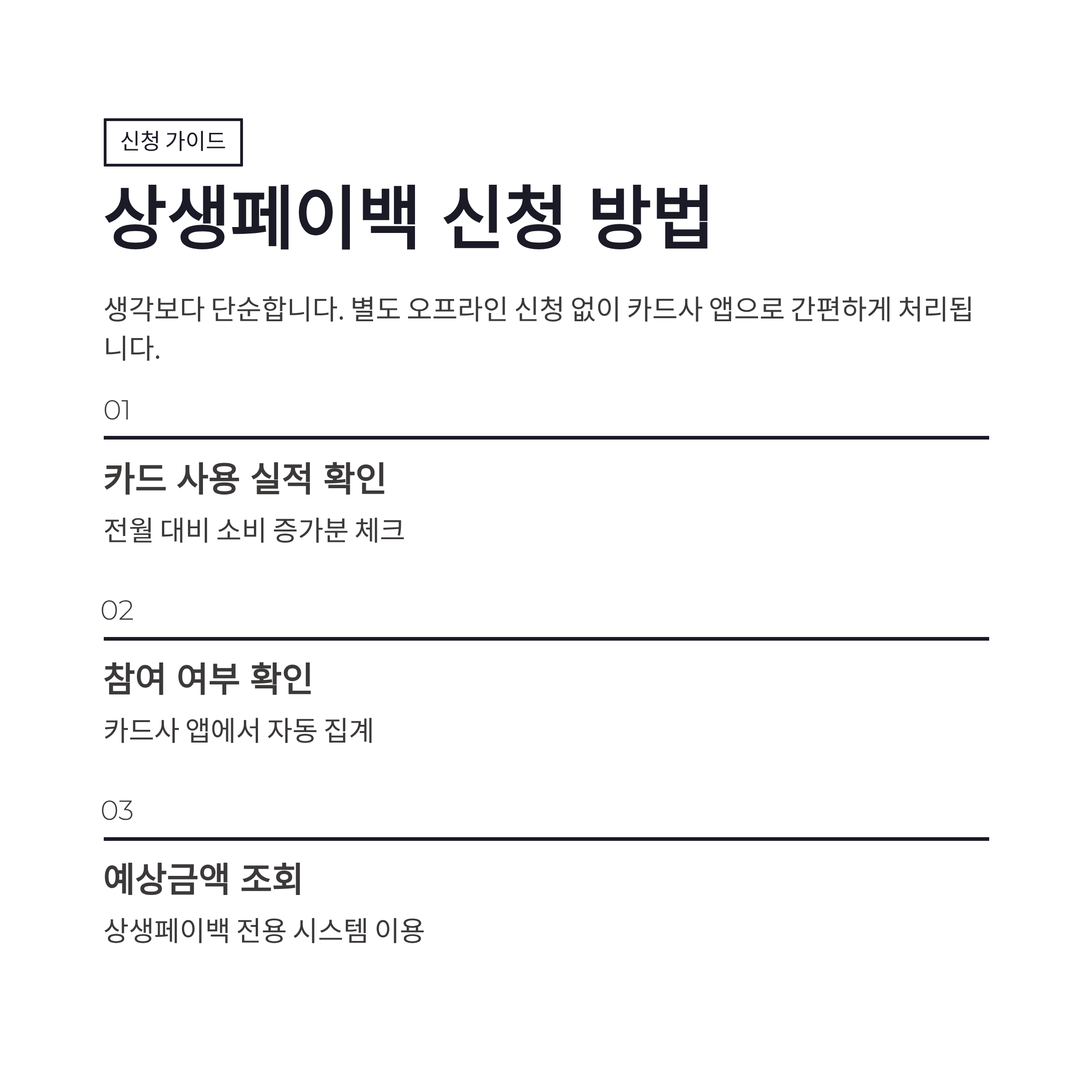 처음엔 신청 과정이 복잡할 줄 알았는데, 막상 해보니까 생각보다 단순했슴다. 핵심은 내 카드 사용 실적 + 참여 여부 확인 이 두 가지더라구요. 상생페이백은 별도 오프라인 신청이 아니라, 카드사 또는 전용 시스템을 통해 자동 집계되는 구조라서 중간에 포기할 이유가 없음… 이게 포인트였습니다.