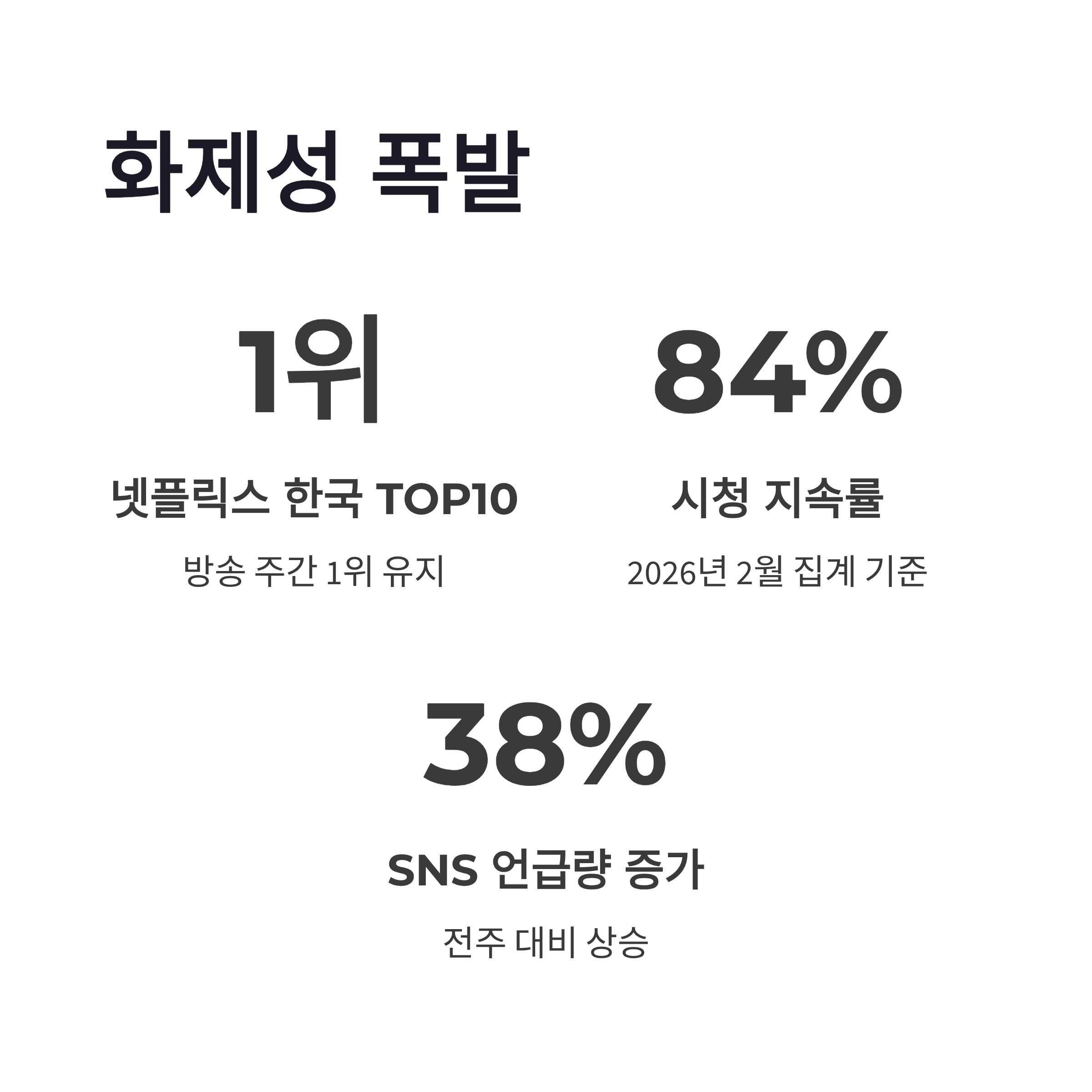 OTT 통합 순위 기준, 방송 주간 넷플릭스 한국 TOP10 1위를 유지했고 평균 시청 지속률은 약 84% 수준으로 알려졌습니다(2026년 2월 집계). 체감상 마지막 회 몰입도가 유독 높았어요. 저도 손에 땀 나더라구요.