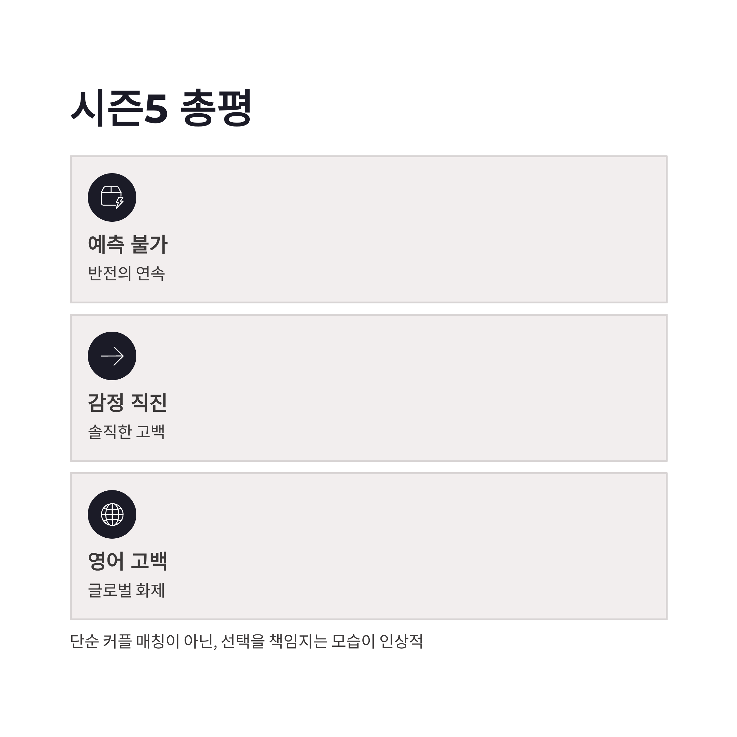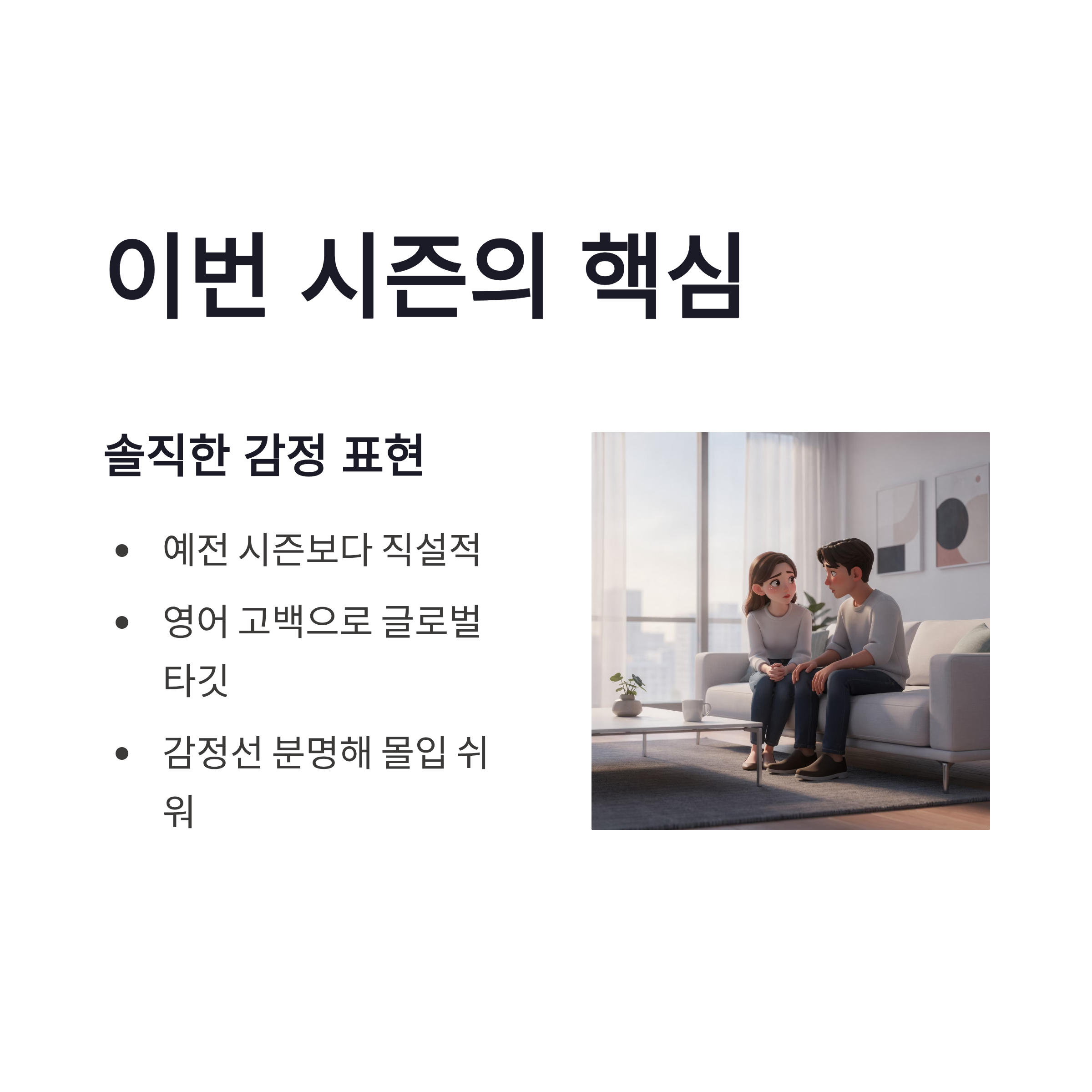 이번 시즌의 핵심은 솔직함이었던 것 같아요. 예전 시즌보다 감정 표현이 직설적이었고, 특히 영어 고백 장면은 글로벌 타깃을 의식한 연출이라는 분석도 나옵니다. 장점은 감정선이 분명해서 몰입이 쉬웠다는 점. 단점이라면 일부 장면이 편집으로 과장됐다는 의견도 있었구요.