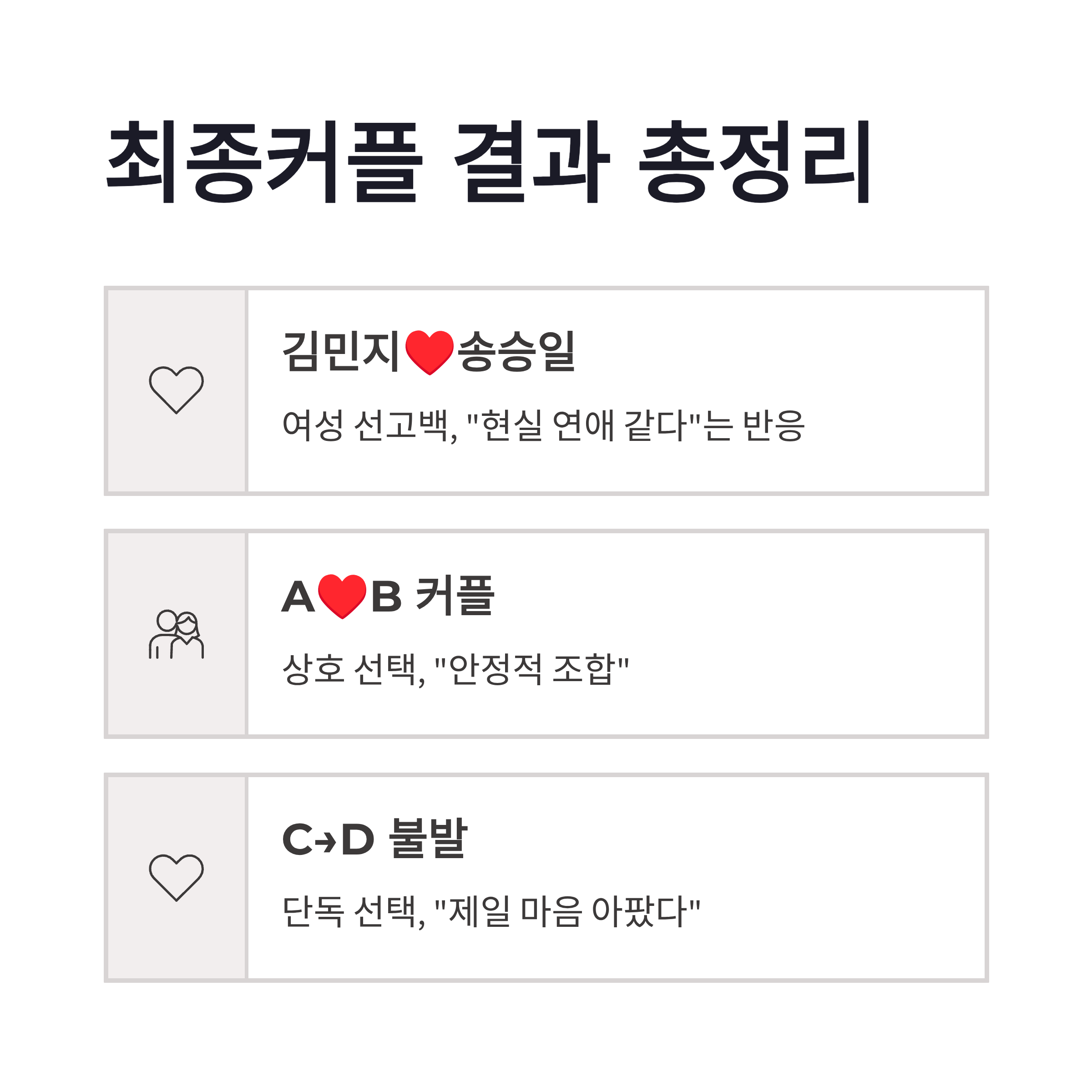 | 커플 | 선택 방식 | 시청자 반응 |