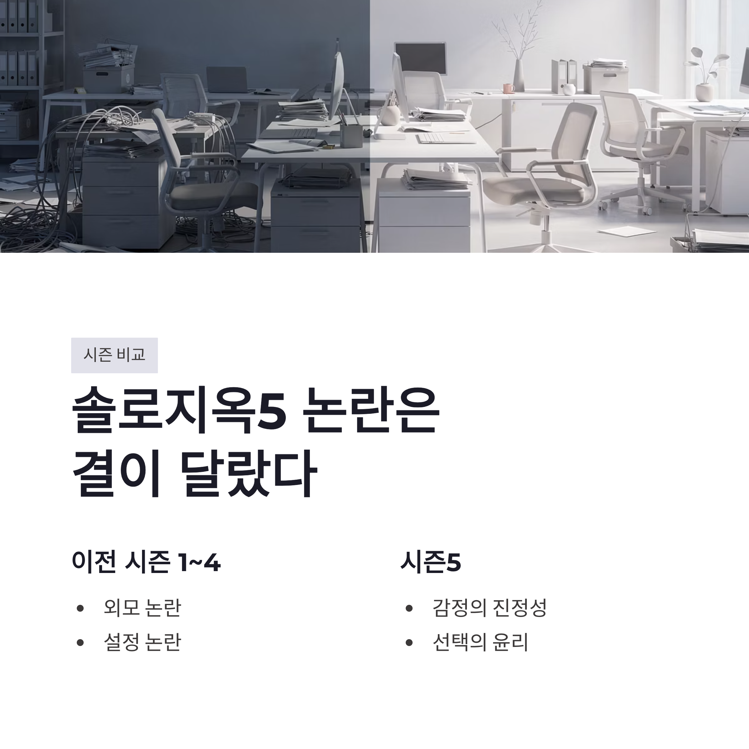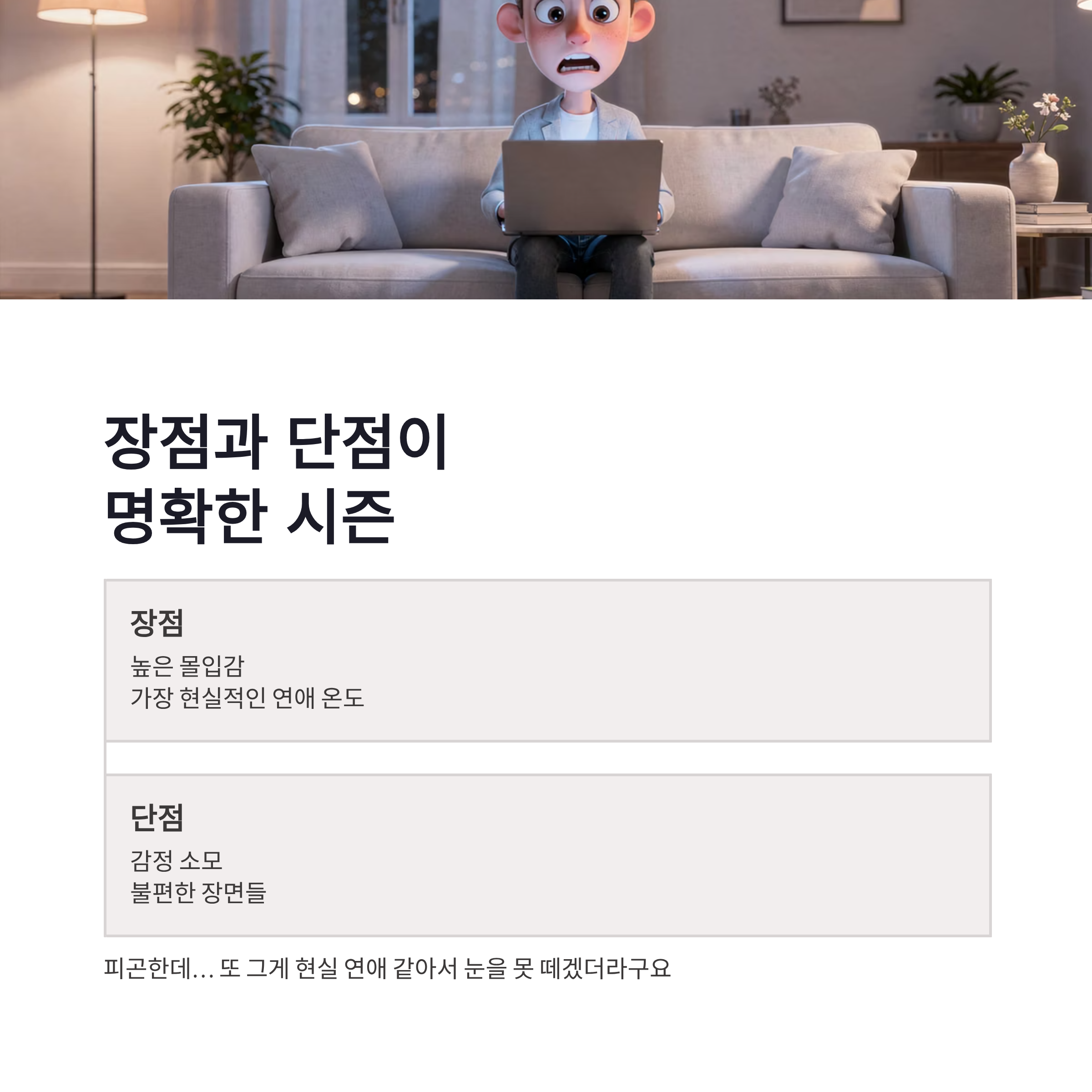 솔로지옥1~4도 말은 많았지만, 이번 솔로지옥5 논란은 결이 달랐어요. 외모나 설정 논란보다 감정의 진정성, 선택의 윤리 같은 이야기가 많아졌거든요. 솔직히 좀 피곤한데… 또 그게 현실 연애 같아서 눈을 못 떼겠더라구요 ㅠㅠ 장점은 몰입감, 단점은 감정 소모. 그래도 시즌 비교해보면 솔로지옥5가 가장 현실적인 연애 온도를 보여준 건 확실한 듯합니다. 그래서 호불호가 갈려도 화제는 더 커진 느낌이었어요.
