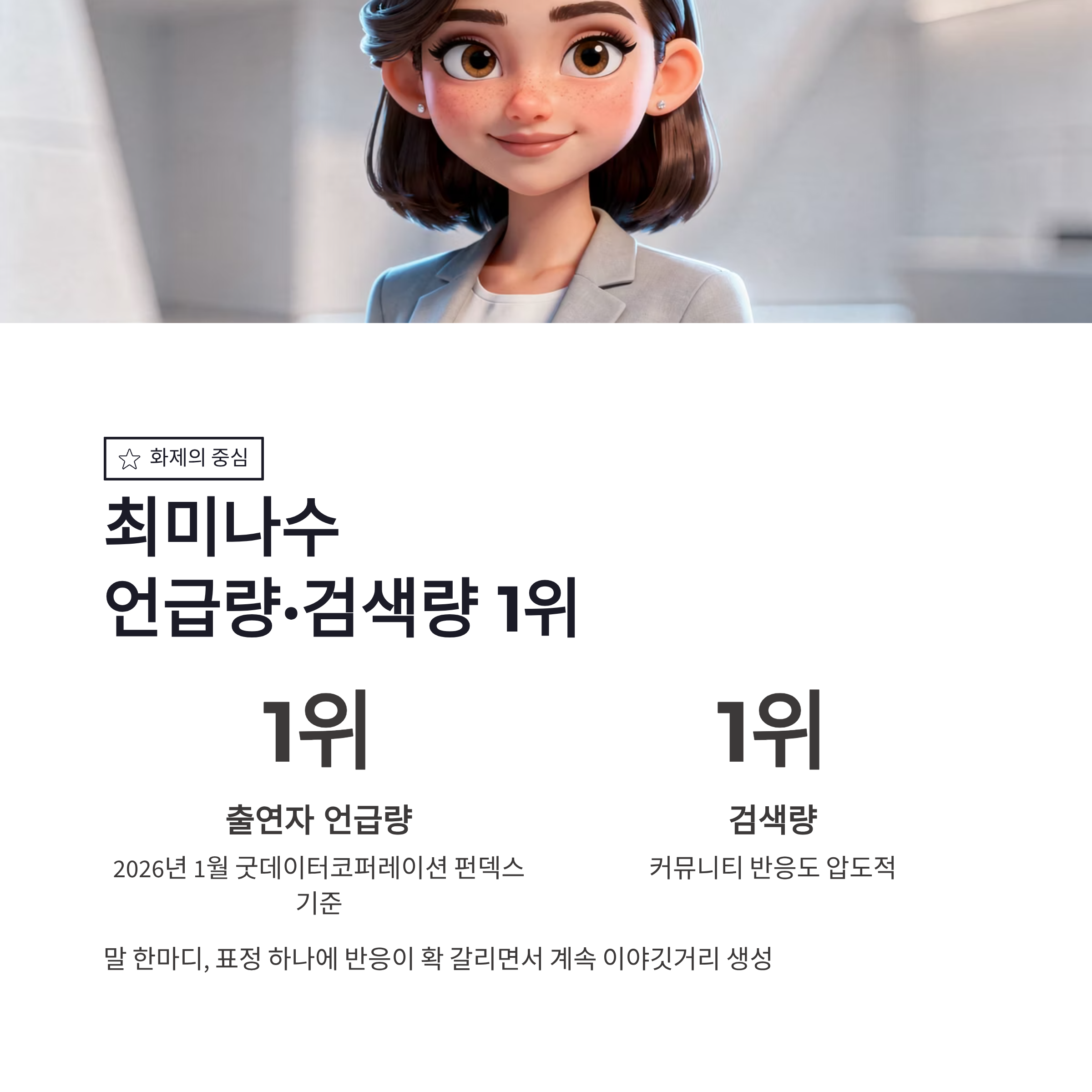 이번 시즌에서 가장 많이 언급된 인물은 단연 최미나수였어요. 2026년 1월 기준 굿데이터코퍼레이션 펀덱스 자료에서도 솔로지옥5 출연자 중 언급량·검색량 1위를 기록했구요. 체감상 커뮤니티 반응도 비슷했습니다. 말 한마디, 표정 하나에 반응이 확 갈리면서 계속 이야깃거리가 생겼거든요.