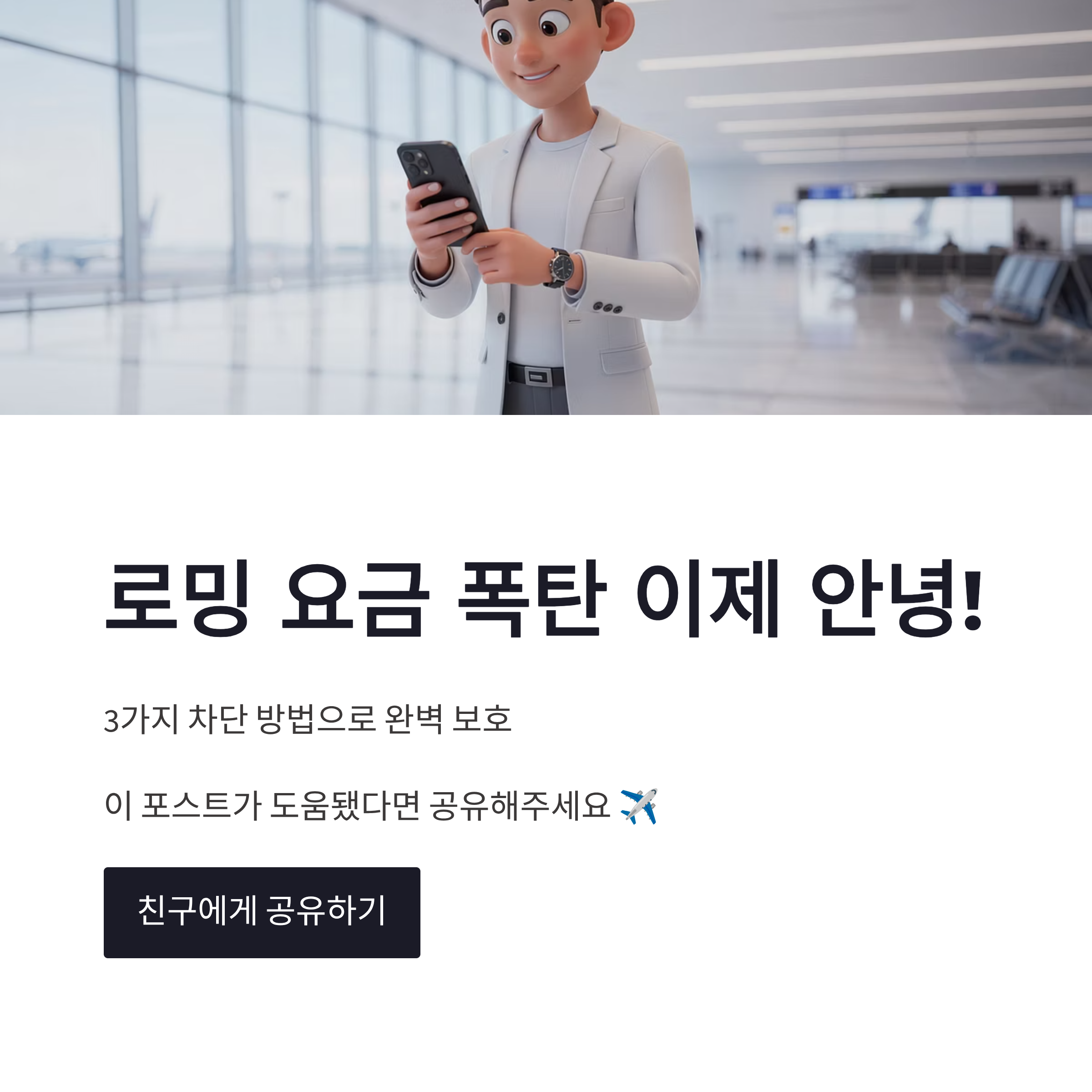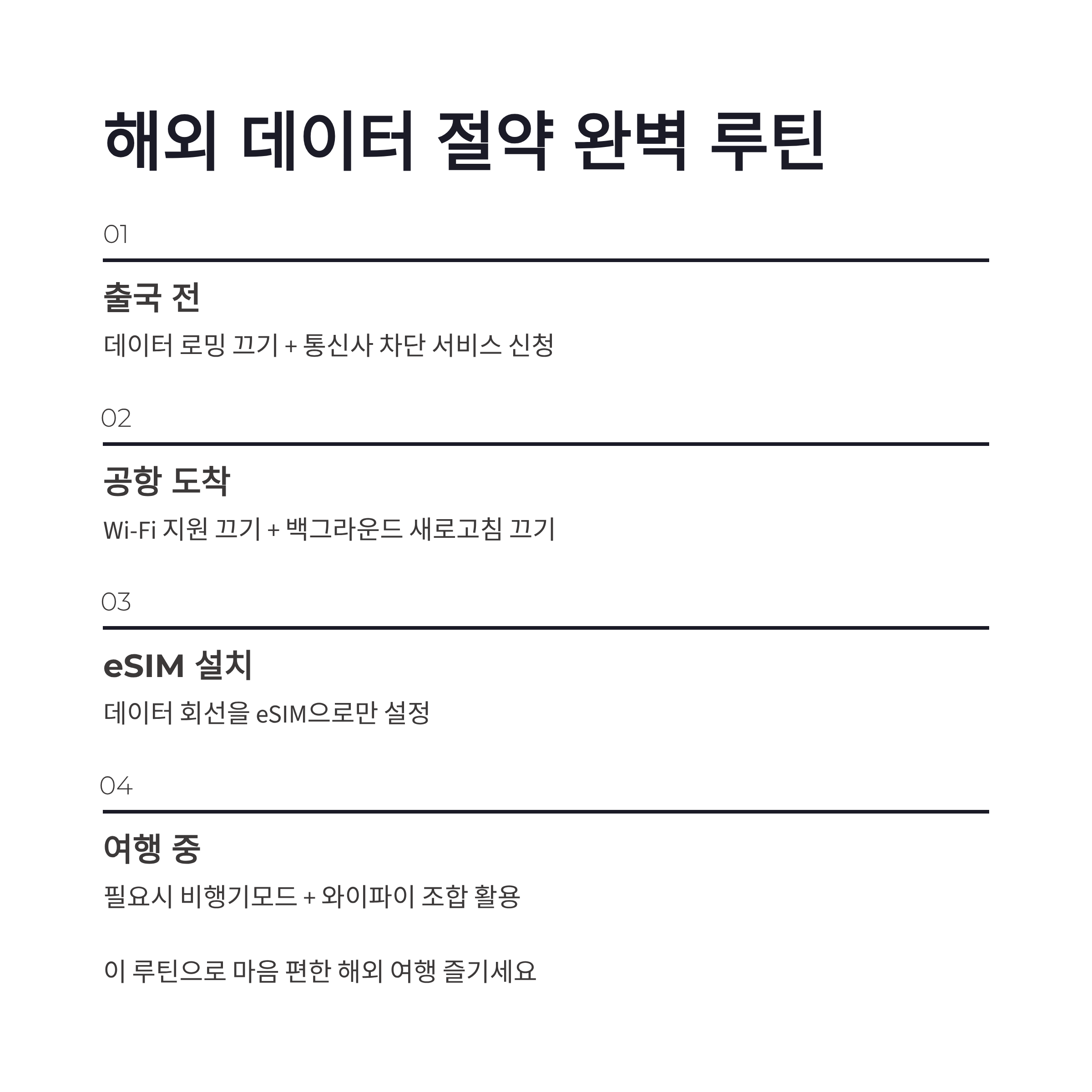 저는 해외 도착하면 아이폰 로밍 차단 상태(데이터 로밍 끔) 유지하고, 필요할 때만 와이파이로 씁니다. 이 습관 하나로 마음이 편해졌어요 ㅎㅎ