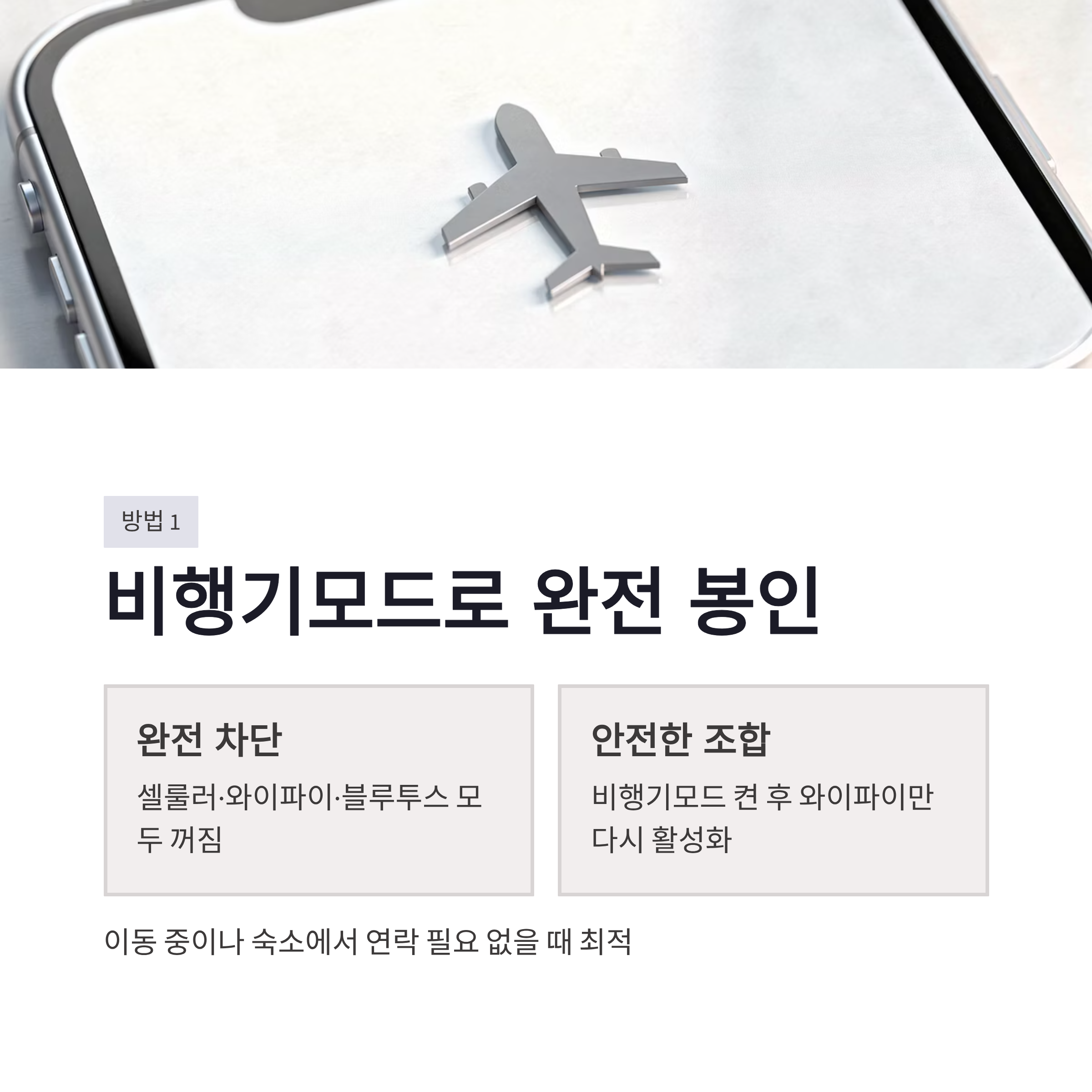 첫 번째 방법은 비행기모드(에어플레인 모드)입니다. 켜는 순간 셀룰러/와이파이/블루투스가 꺼지니까 “아예 연결 자체를 끊는” 방식이죠. 다만 비행기모드는 전화·문자까지 같이 막혀요. 저는 이동 중이나 숙소에서 쉬는 시간처럼 연락 필요 없을 때만 씁니다. 비행기모드 켠 뒤 와이파이만 다시 켜면 끝! 이 조합이 은근 안전하더라구요