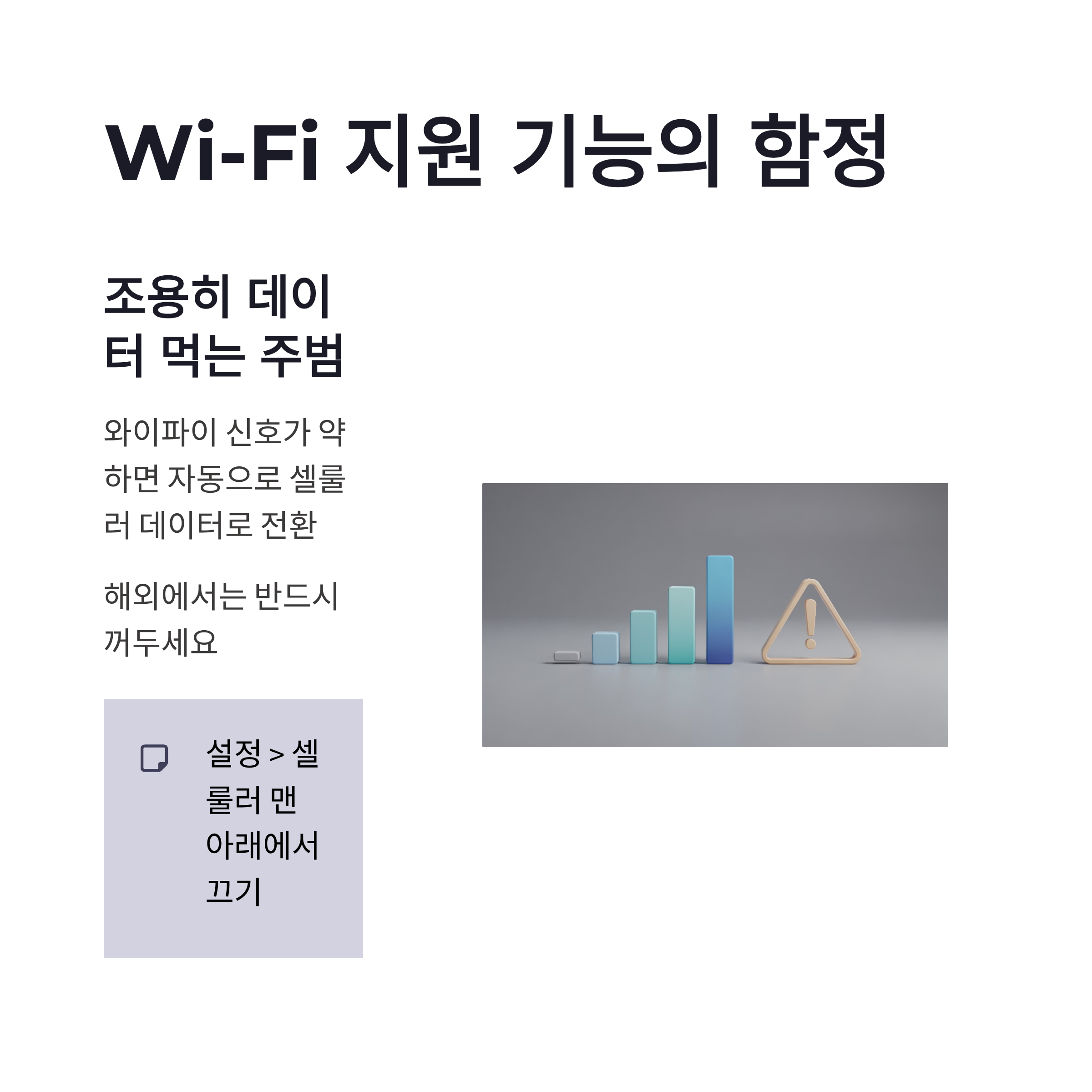 | Wi-Fi 지원 | 설정 > 셀룰러 (맨 아래) | 끔 | 와이파이 약하면 몰래 셀룰러 땡겨씀 |