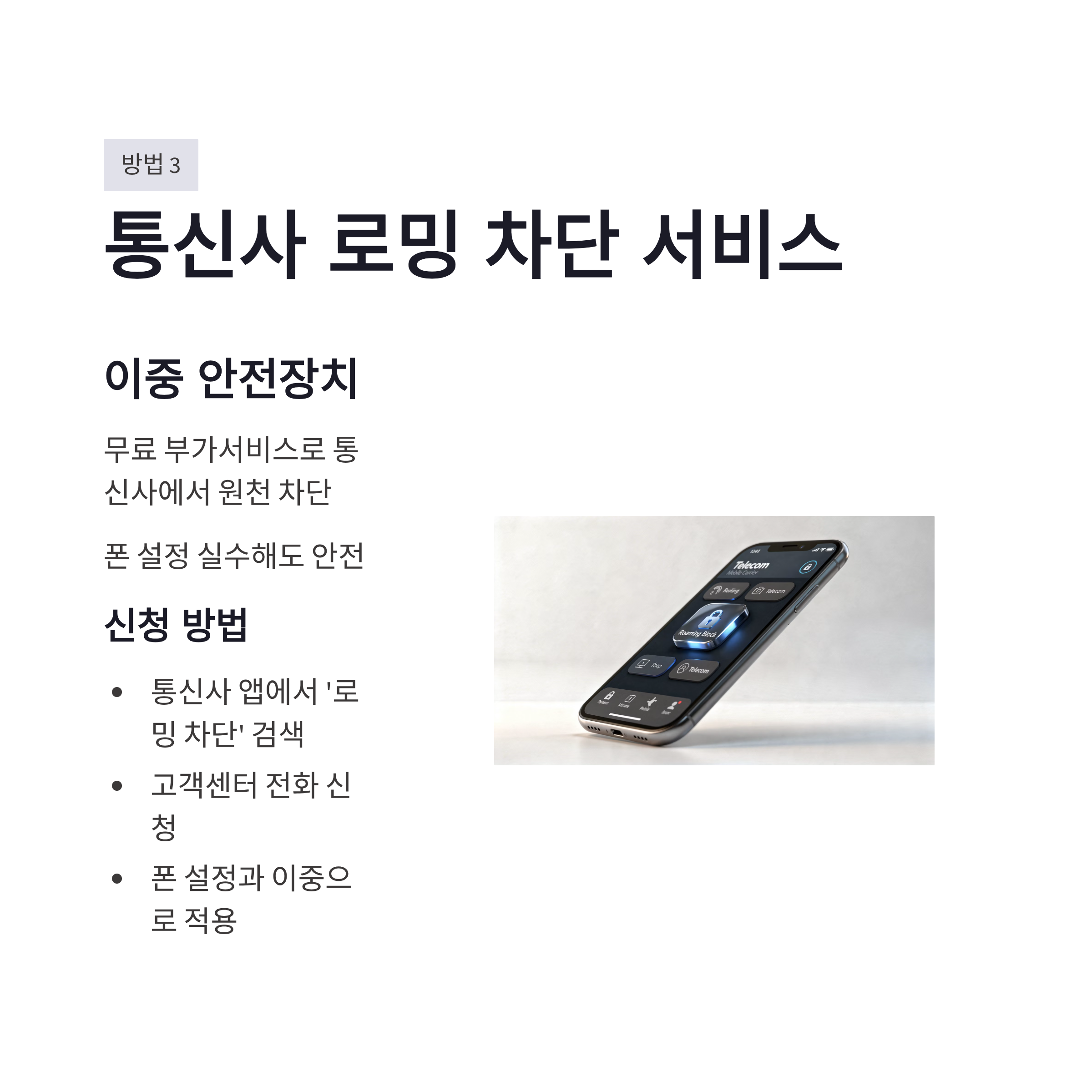 세 번째는 통신사 차단 서비스(무료 부가서비스)를 걸어두는 방식이에요. 기기 설정을 잘 못 만지는 가족 폰이나, “나 실수할 것 같다…” 싶은 분들에게 특히 좋습니다. 폰에서 버튼을 잘못 눌러도 통신사 쪽에서 데이터 접속 자체를 막아버리는 느낌이라 더 든든하더라구요. 다만 이름이 통신사마다 조금씩 달라서, 앱/고객센터에서 ‘로밍 차단’, ‘데이터 로밍 차단’ 같은 키워드로 찾으면 금방 나옵니다. 저는 이걸 걸어두고 + 폰에서도 데이터 로밍을 꺼서 이중으로 잠가요. 이 조합이 제일 안심됩니다.