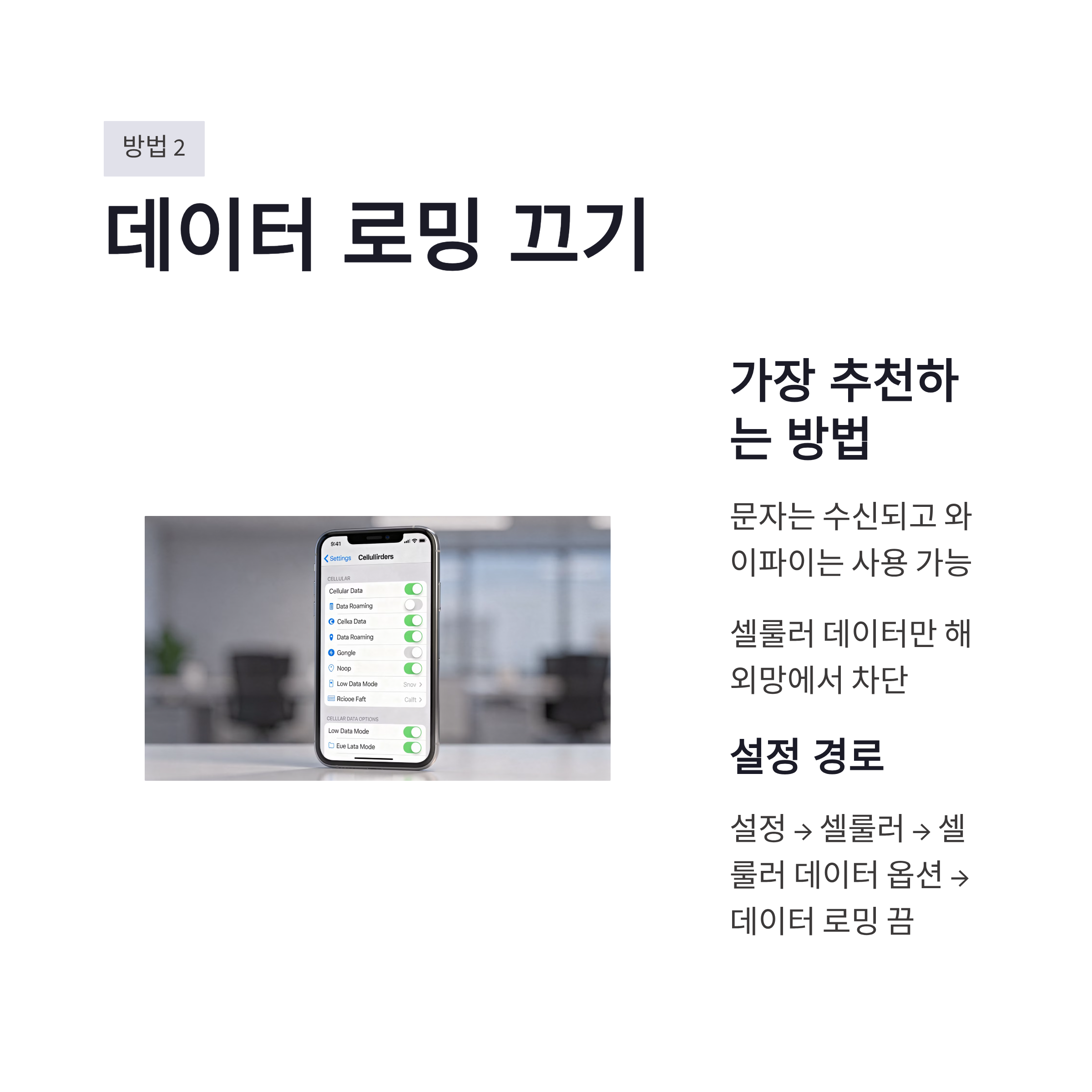 | 데이터 로밍 | 설정 > 셀룰러 > 셀룰러 데이터 옵션 | 끔 | 해외망 데이터 과금 차단 |