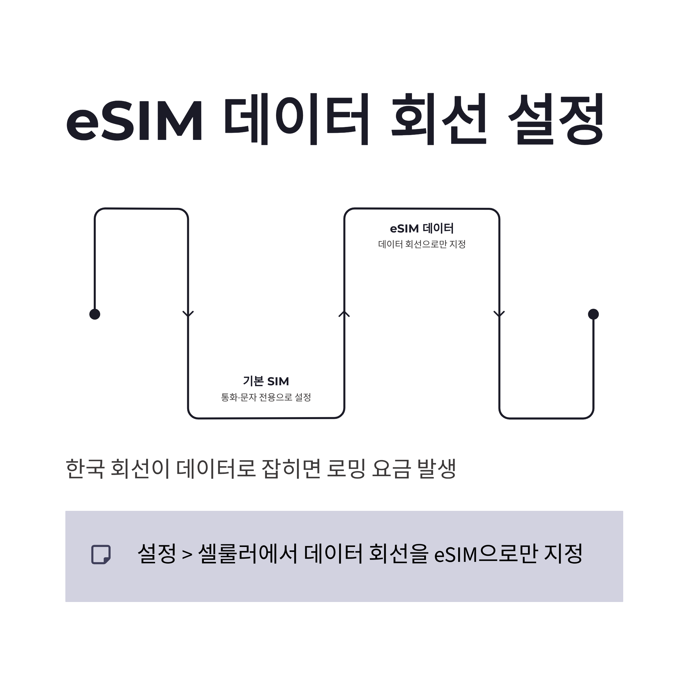 | 데이터 회선(eSIM/유심) | 설정 > 셀룰러 | 데이터는 eSIM만 | 한국 회선이 데이터로 잡히면 위험 |