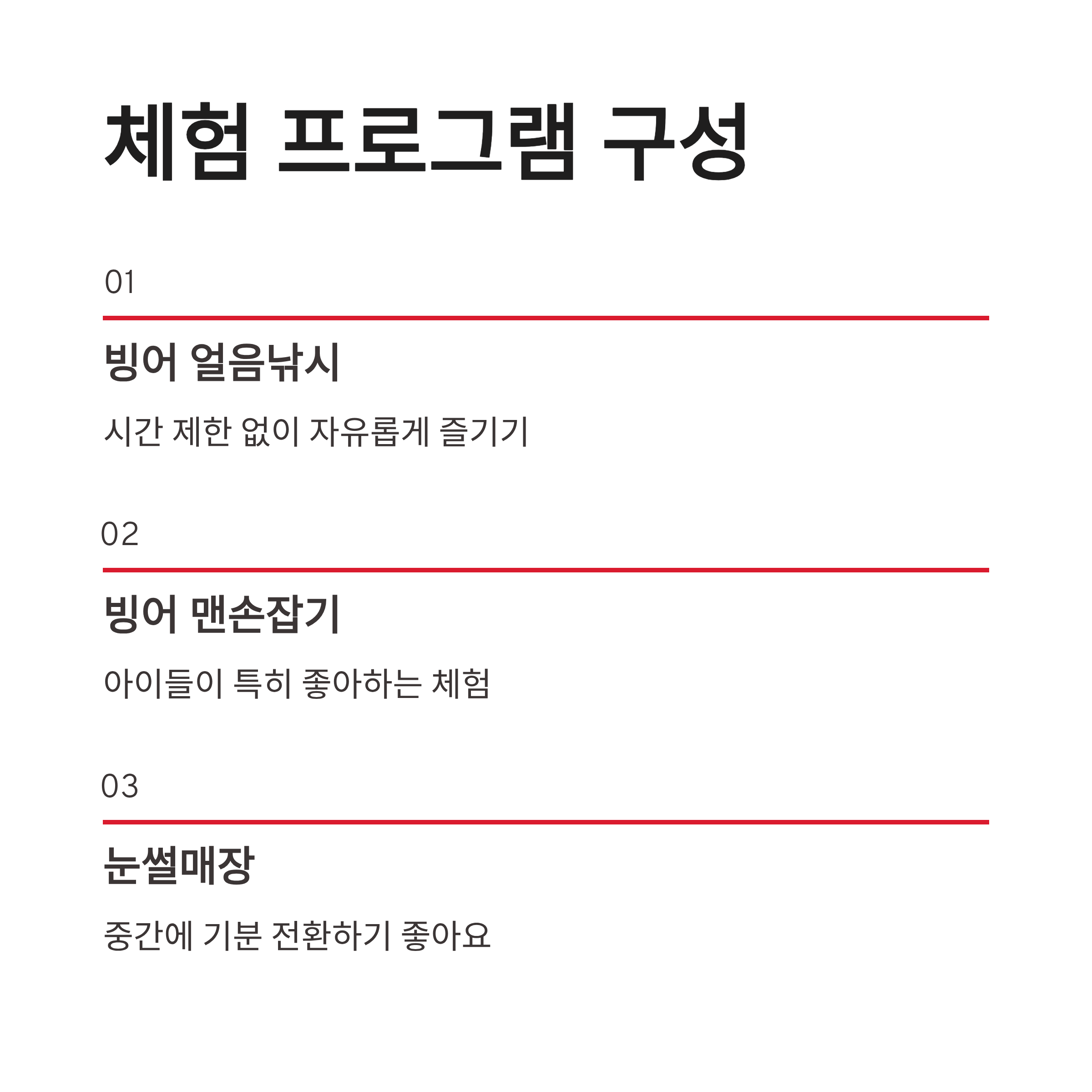 | 주요 체험 | 빙어 얼음낚시, 맨손잡기, 눈썰매 |