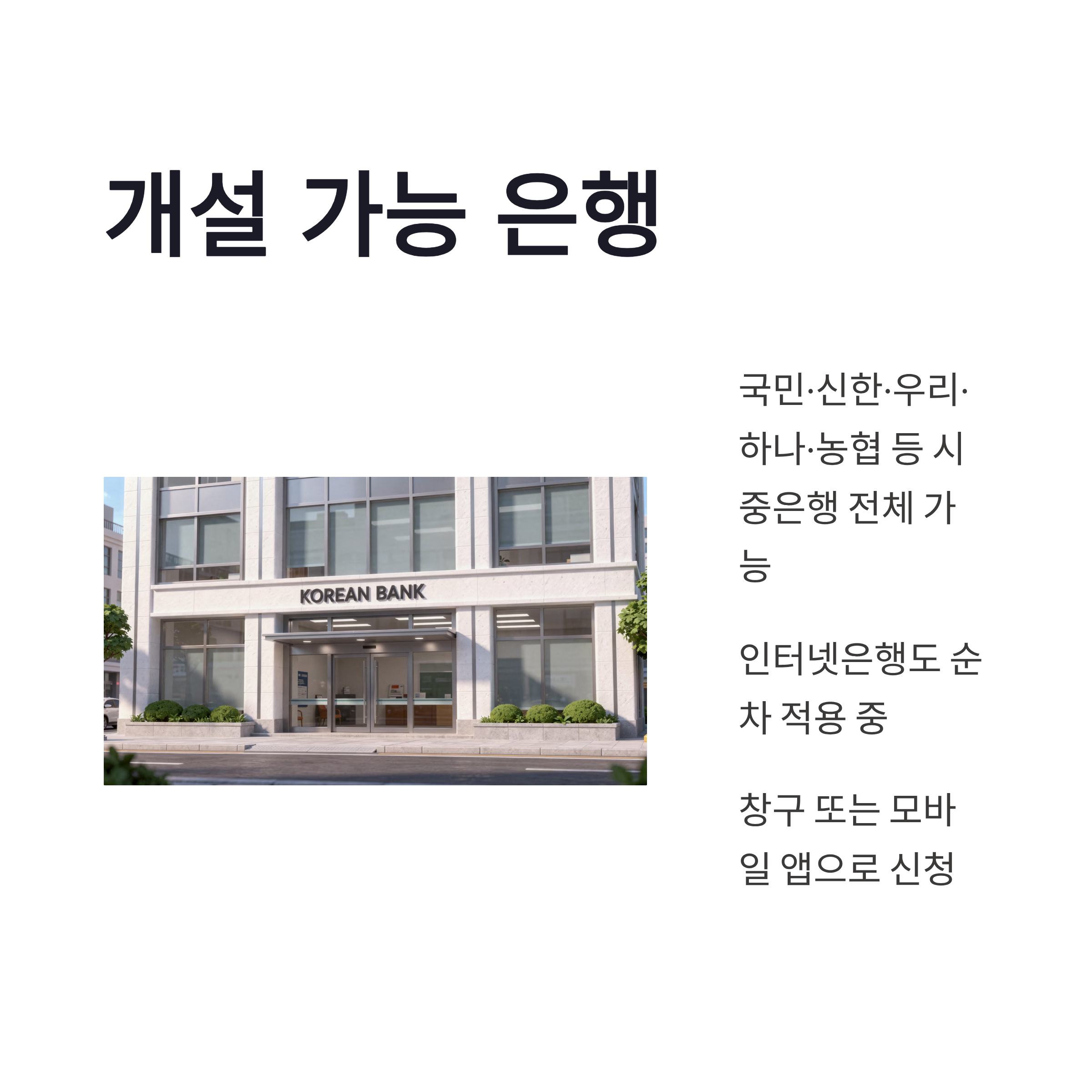 | 개설 방법 | 은행 창구 또는 모바일 앱 |