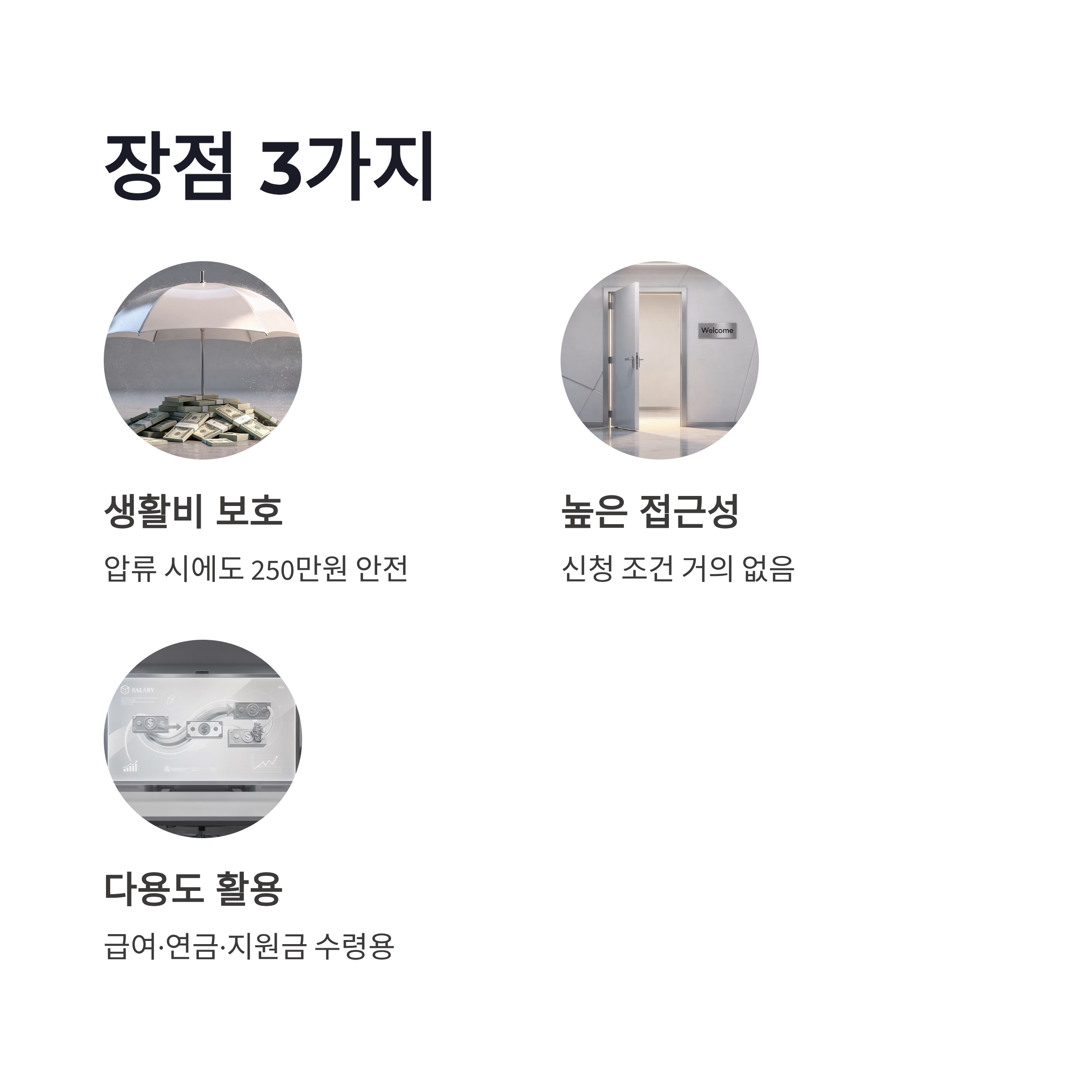 장점은 확실합니다. 첫째, 압류가 들어와도 생활비는 보호됩니다. 둘째, 신청 조건이 거의 없어서 접근성이 좋아요. 셋째, 급여·연금·지원금 수령용으로 활용하기 좋더라구요.