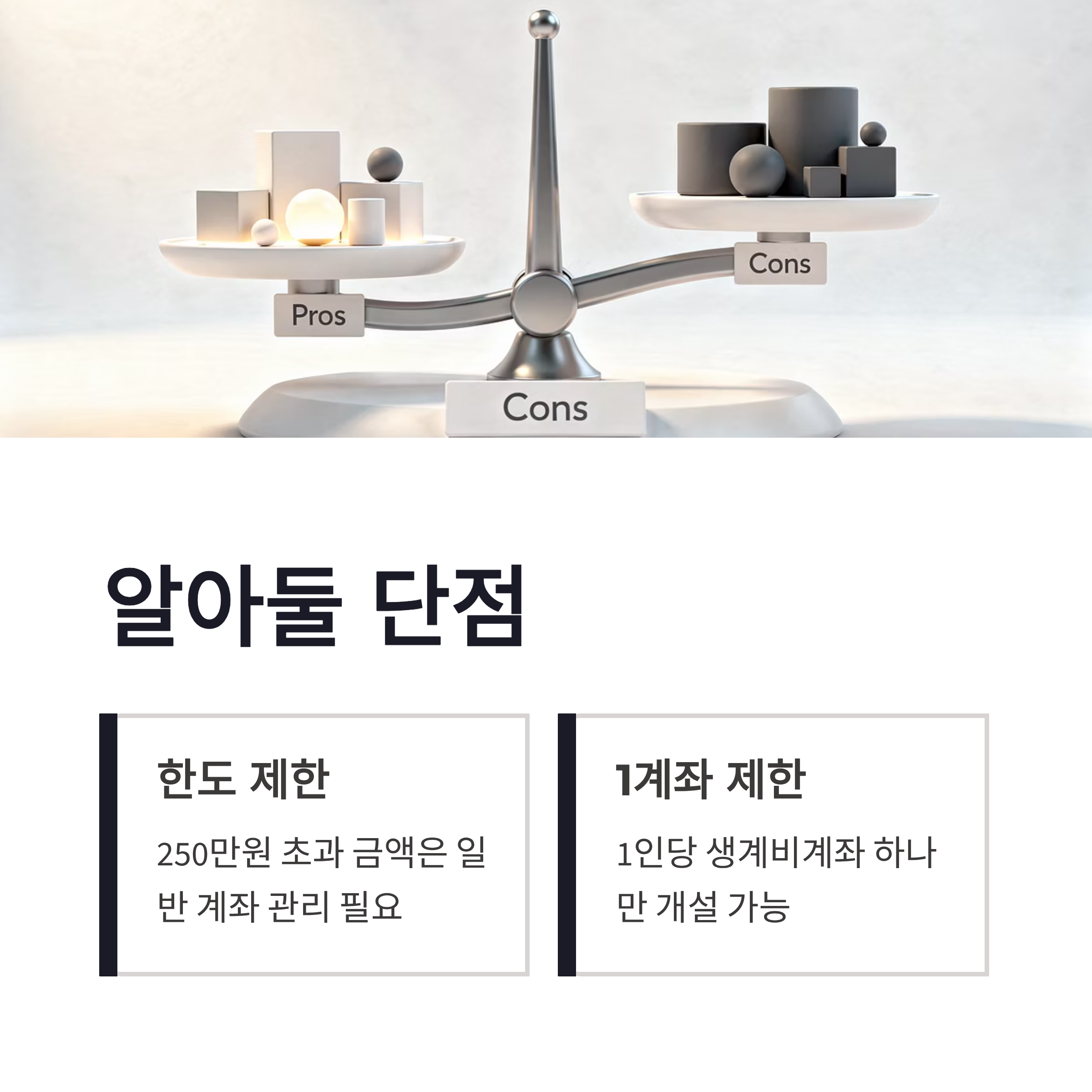 단점도 있긴 해요. 보호 한도가 250만 원이라 그 이상 금액은 일반 계좌로 관리해야 하고, 계좌 하나만 가능하다는 점은 조금 아쉽더라구요. 그래도 현실적으로 이 정도면 꽤 큰 변화라고 느꼈습니다.