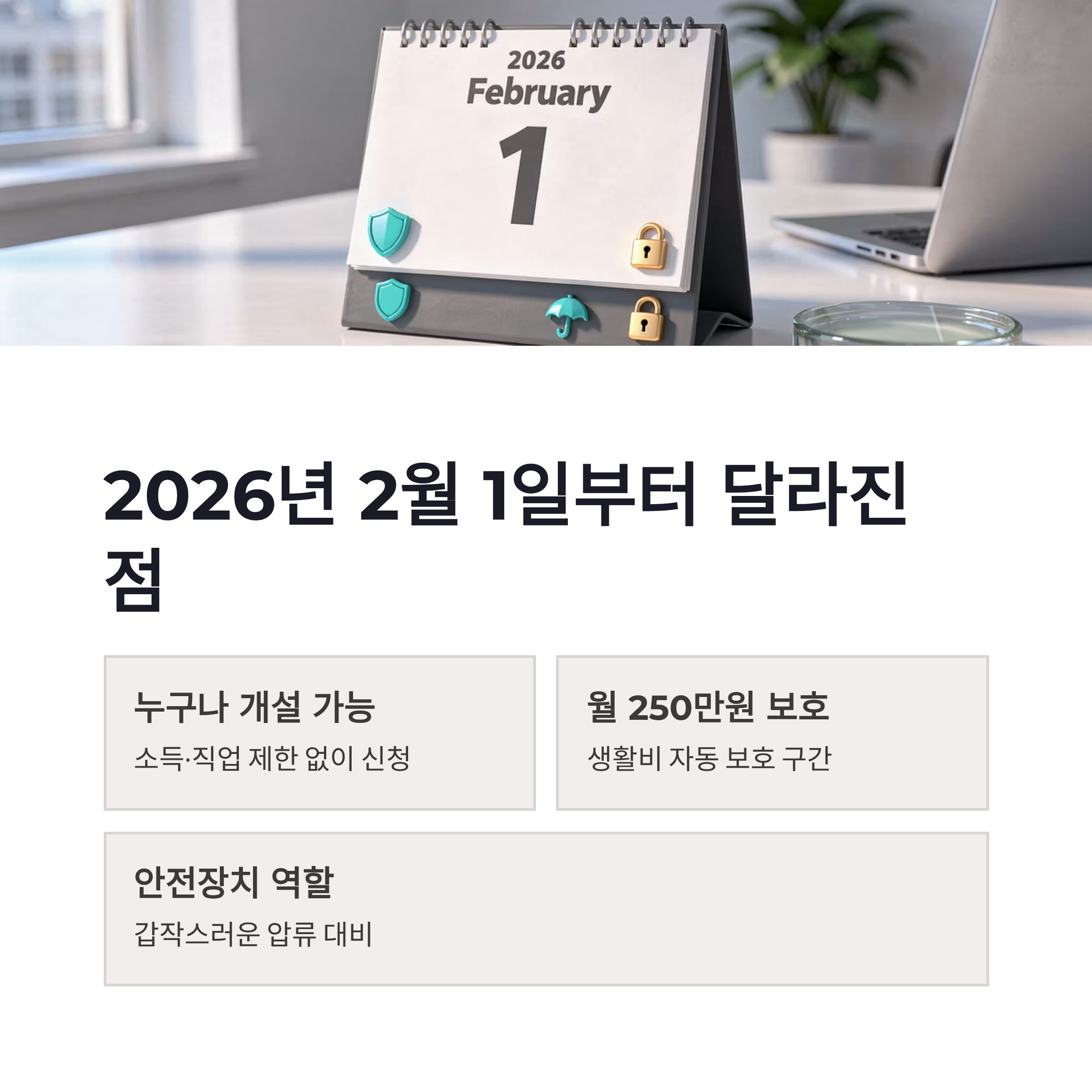 솔직히 말해서 통장 압류 한 번 겪어보면 진짜 멘탈이 같이 털리더라구요…ㅠㅠ 그래서 압류방지통장 제도가 2026년 2월 1일부터 현장에 바로 적용된다는 소식 듣고 저도 엄청 찾아봤습니다. 이번에 바뀐 핵심은 딱 하나예요. 생계비계좌를 누구나 만들 수 있게 됐다는 점입니다. 예전엔 기초수급자나 일부 대상자만 가능했는데, 이제는 직장인·프리랜서·자영업자 상관없이 신청 가능하더라구요. 특히 월 최대 250만 원까지 자동 보호된다는 점이 진짜 큽니다. 이 금액은 통장에 들어오는 순간 보호구간으로 분류돼서, 갑작스러운 압류 상황에서도 생활비는 지킬 수 있게 설계돼 있구요. 개인적으로 이건 그냥 금융상품이 아니라 안전장치 느낌이었어요. 심리적으로도 훨씬 낫더라구요.