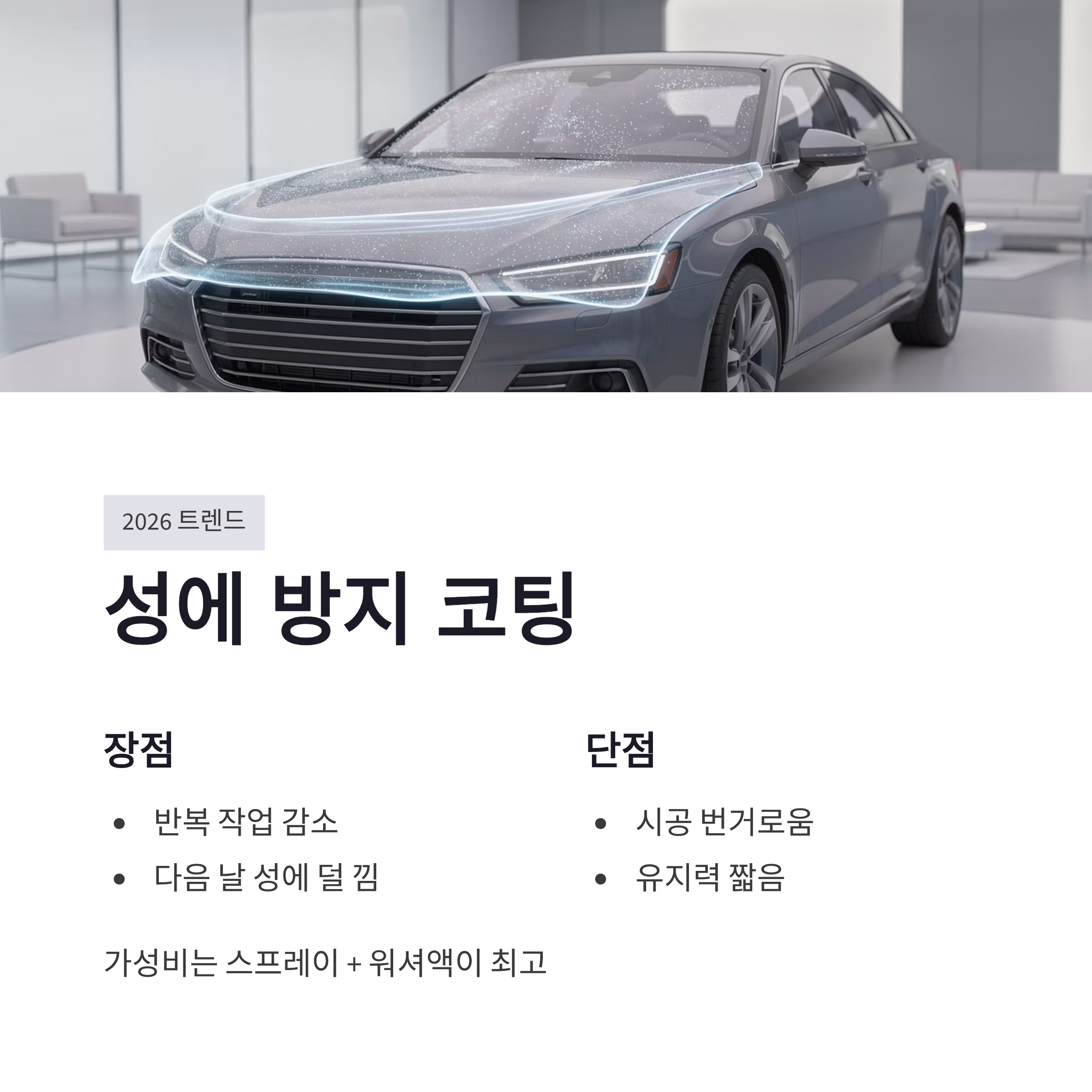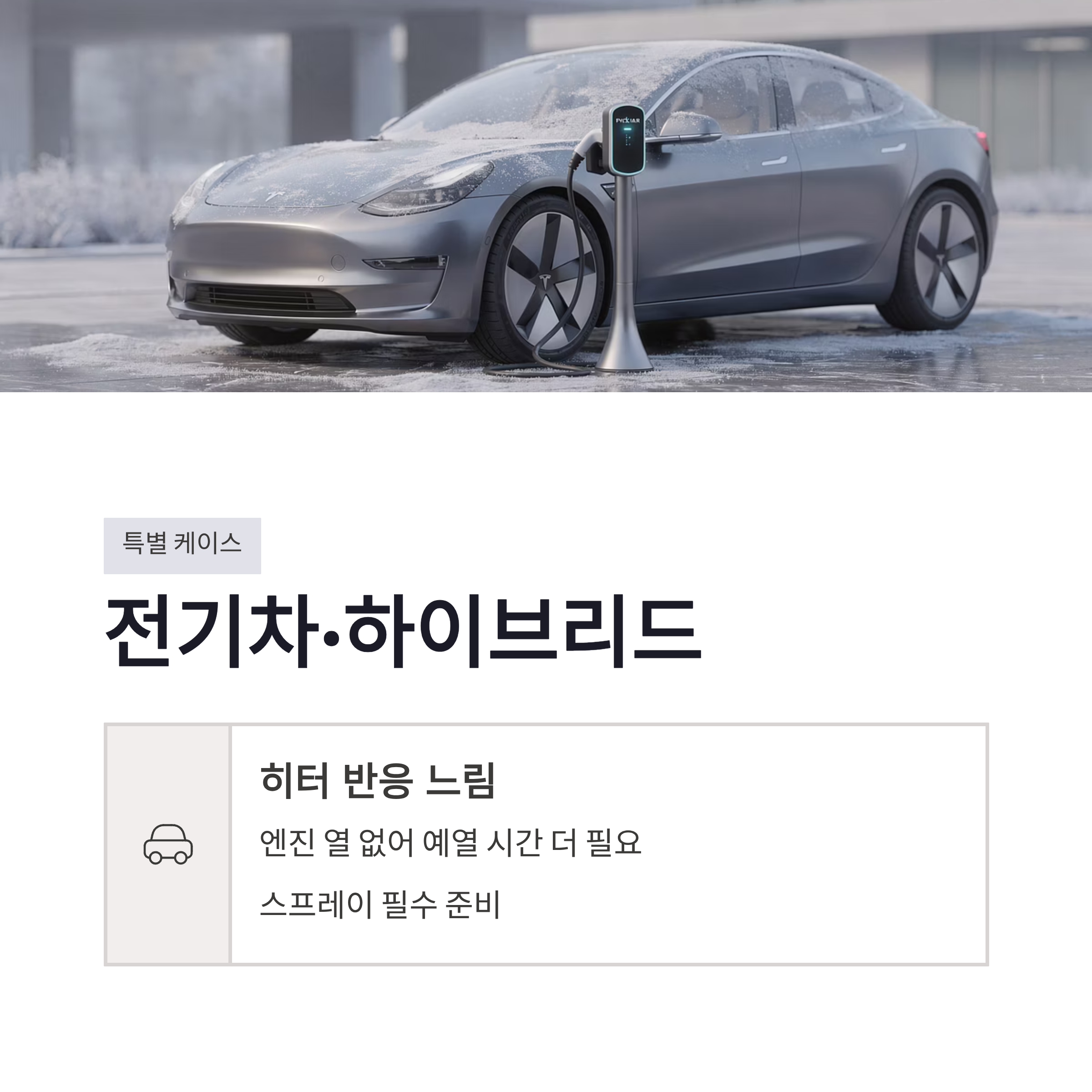 2026년 기준으로는 성에 방지 코팅도 많이 쓰더라구요. 전면유리에 얇게 코팅해두면 다음 날 성에가 덜 낍니다. 장점은 반복 작업이 줄어든다는 거, 단점은 시공 귀찮고 유지력이 생각보다 짧다는 점. 개인적으로는 스프레이 + 워셔액이 가성비 최고였어요. 전기차나 하이브리드는 히터 반응 느려서 더 체감 큽니다.
