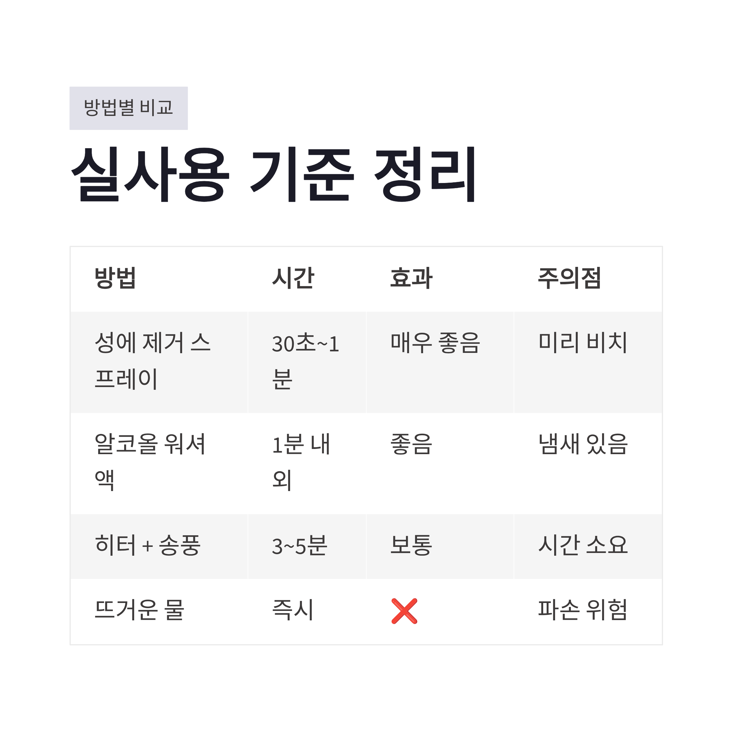 | 방법 | 소요시간 | 효과 | 주의점 |