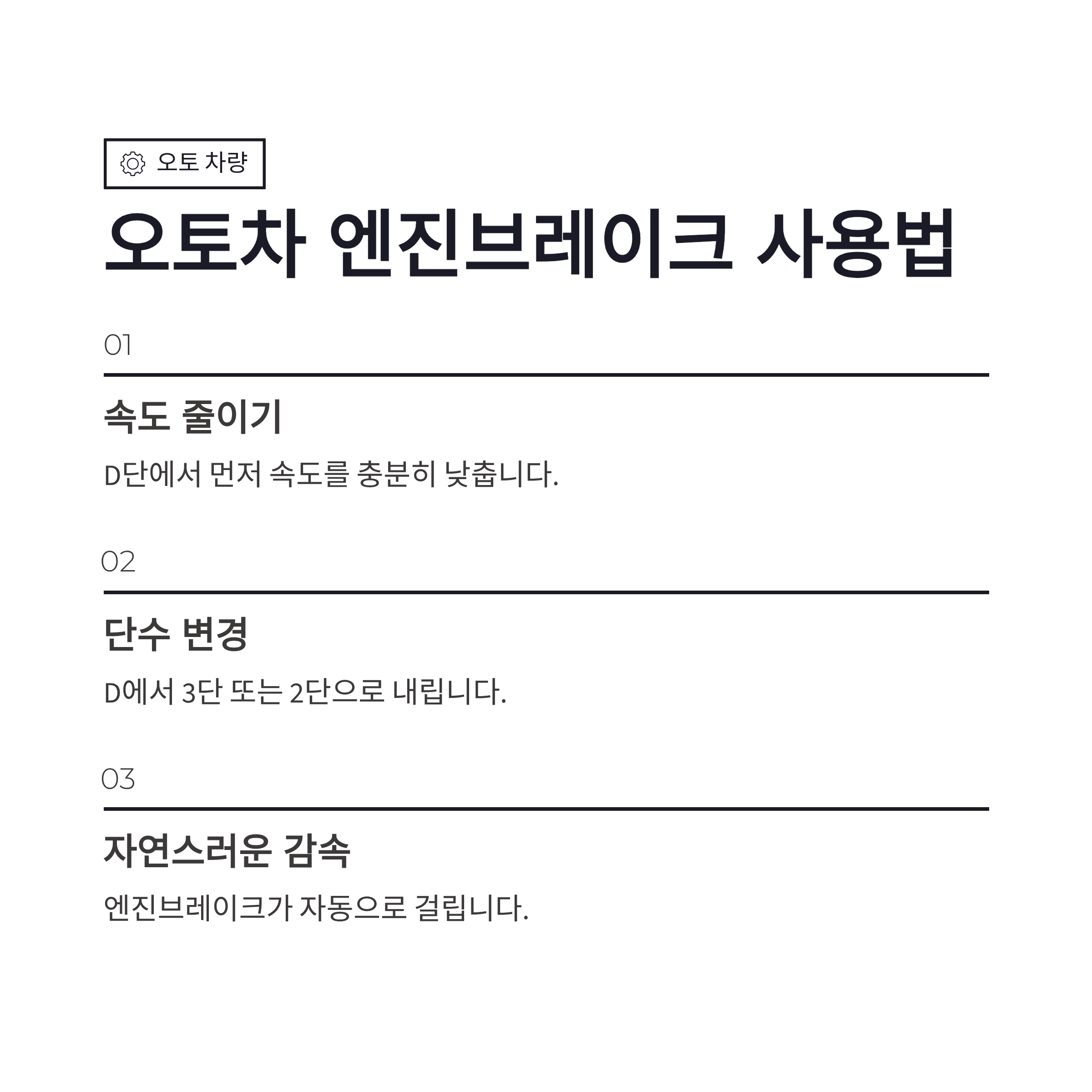 오토차라고 엔진브레이크 못 쓰는 거 절대 아니구요. D에서 바로 브레이크만 밟는 대신, 속도 줄여야 할 때 D → 3단 또는 2단으로 내려주면 자연스럽게 엔진브레이크가 걸립니다. 저도 처음엔 헷갈렸는데, 생각보다 단순하더라구요. 특히 내리막길에서 효과가 확 느껴졌어요.