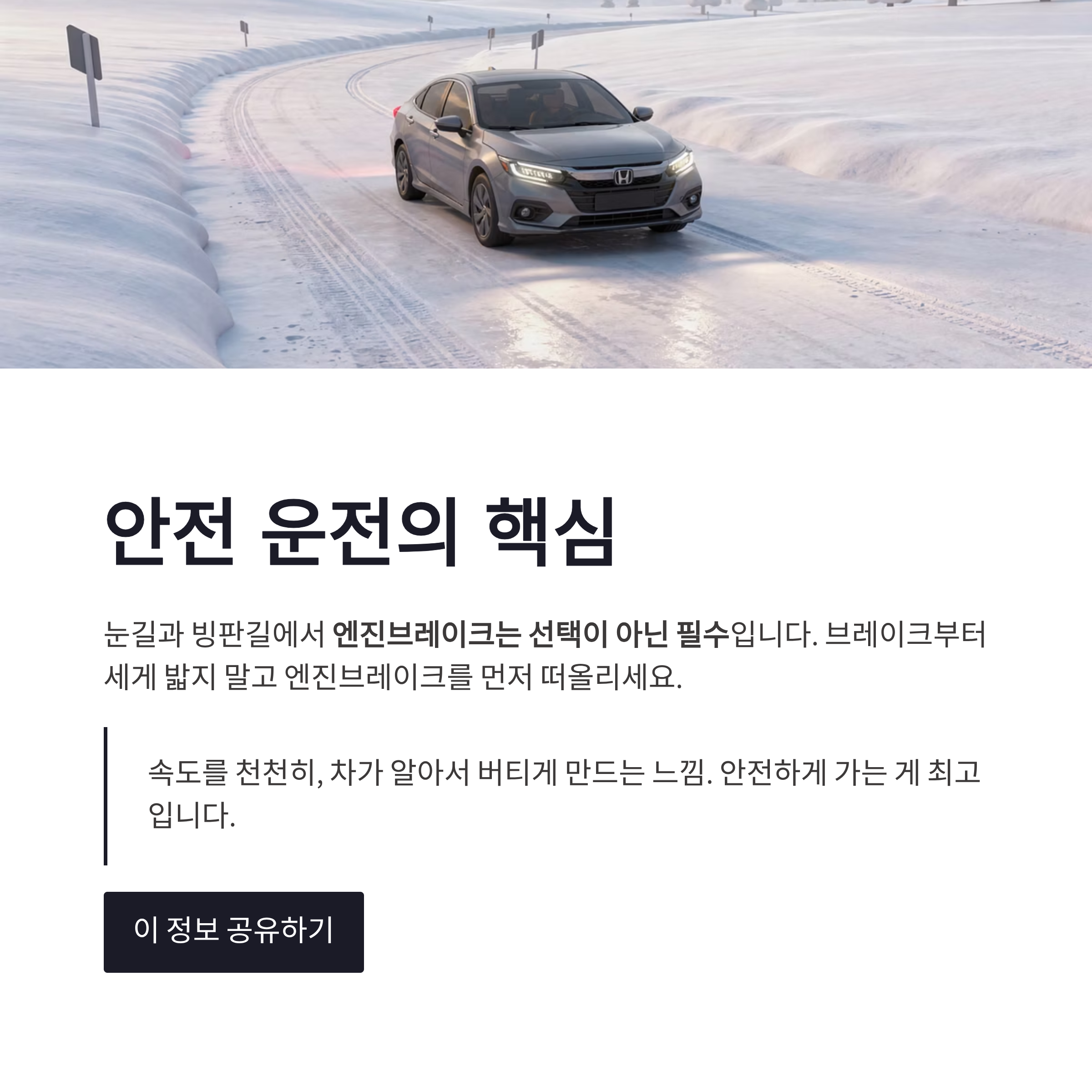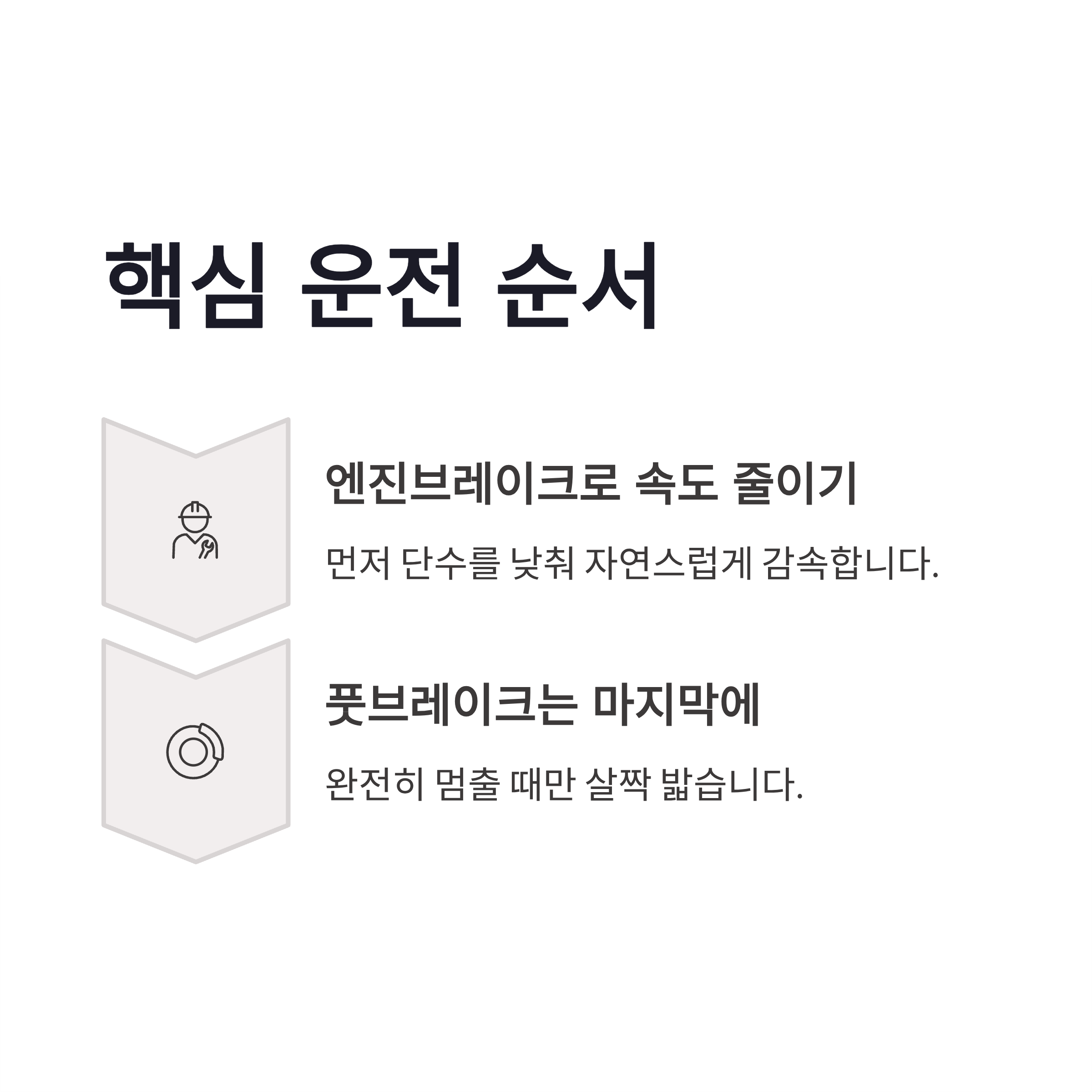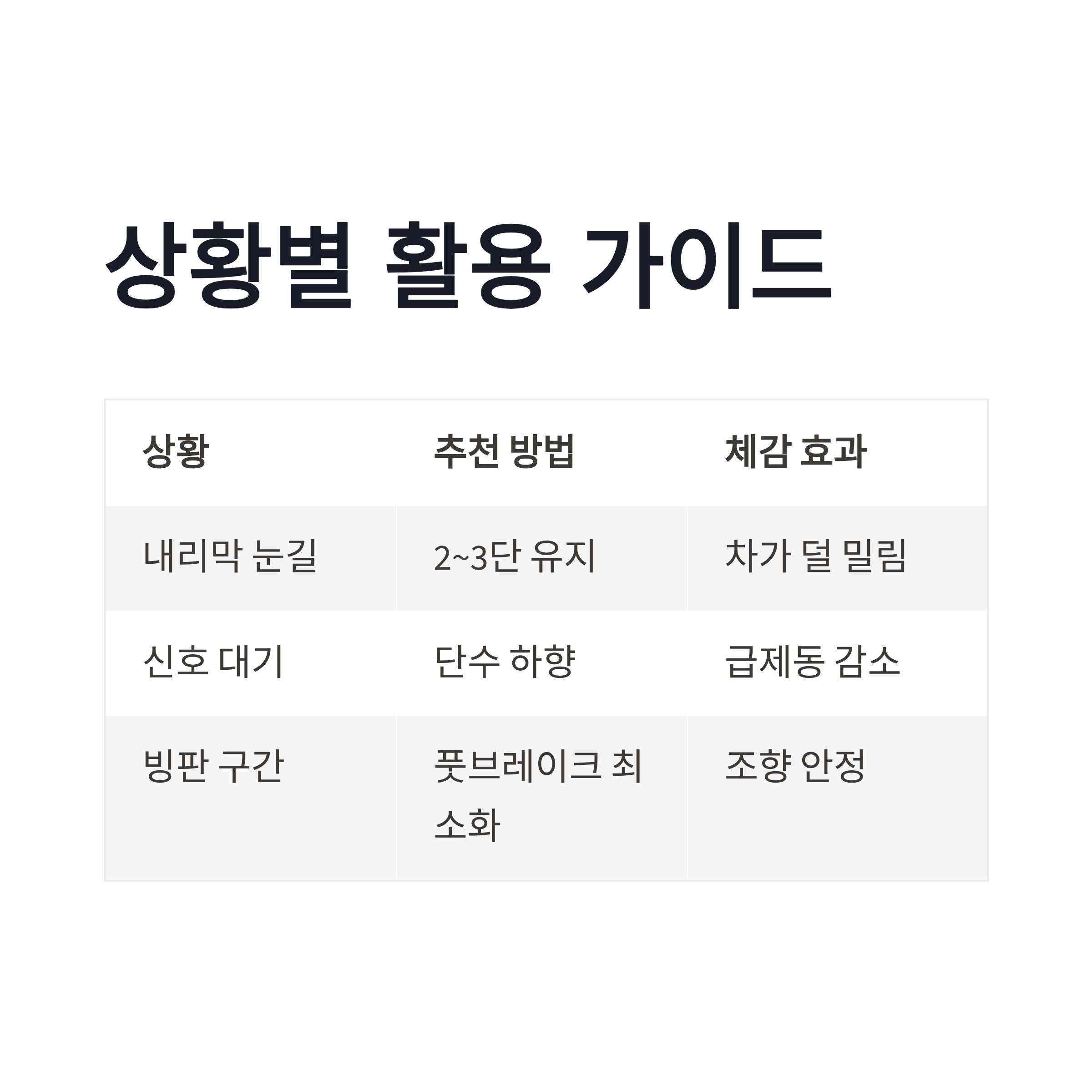 | 빙판 구간 | 풋브레이크 최소화 | 조향 안정 |