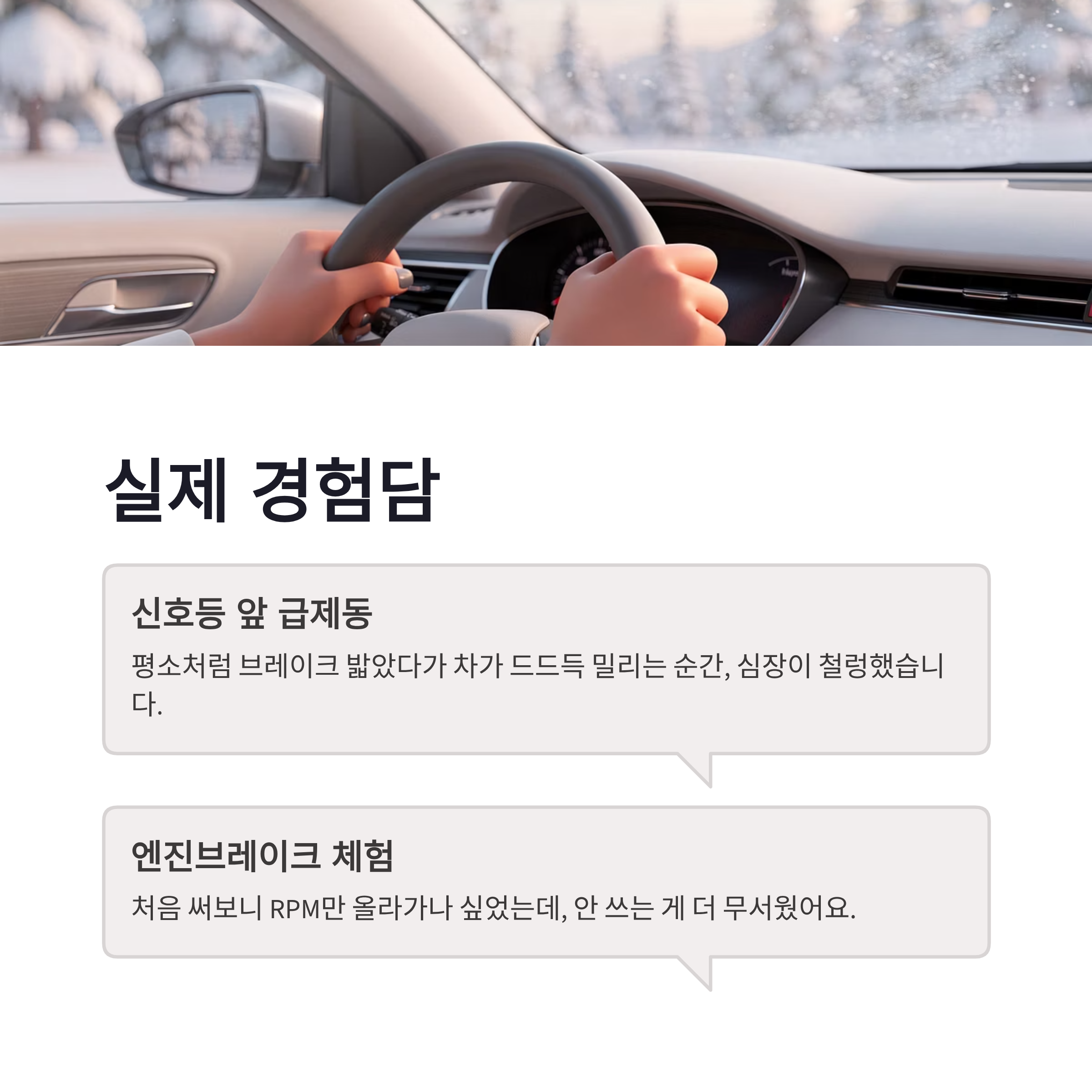2026년 들어 눈길 사고 통계 보면, 급제동으로 인한 미끄러짐 비율이 여전히 높다고 하더라구요. 그래서 요즘은 운전학원이나 안전교육에서도 엔진브레이크를 기본으로 가르치는 추세래요. 장점은 명확합니다. 차가 덜 튀고, 방향 유지가 쉽고, 브레이크 마모도 줄어요. 단점이라면… 처음 쓰면 RPM 소리에 살짝 놀란다는 거? ㅋㅋ 그래도 익숙해지면 그 소리마저 안심 신호처럼 느껴지더라구요.