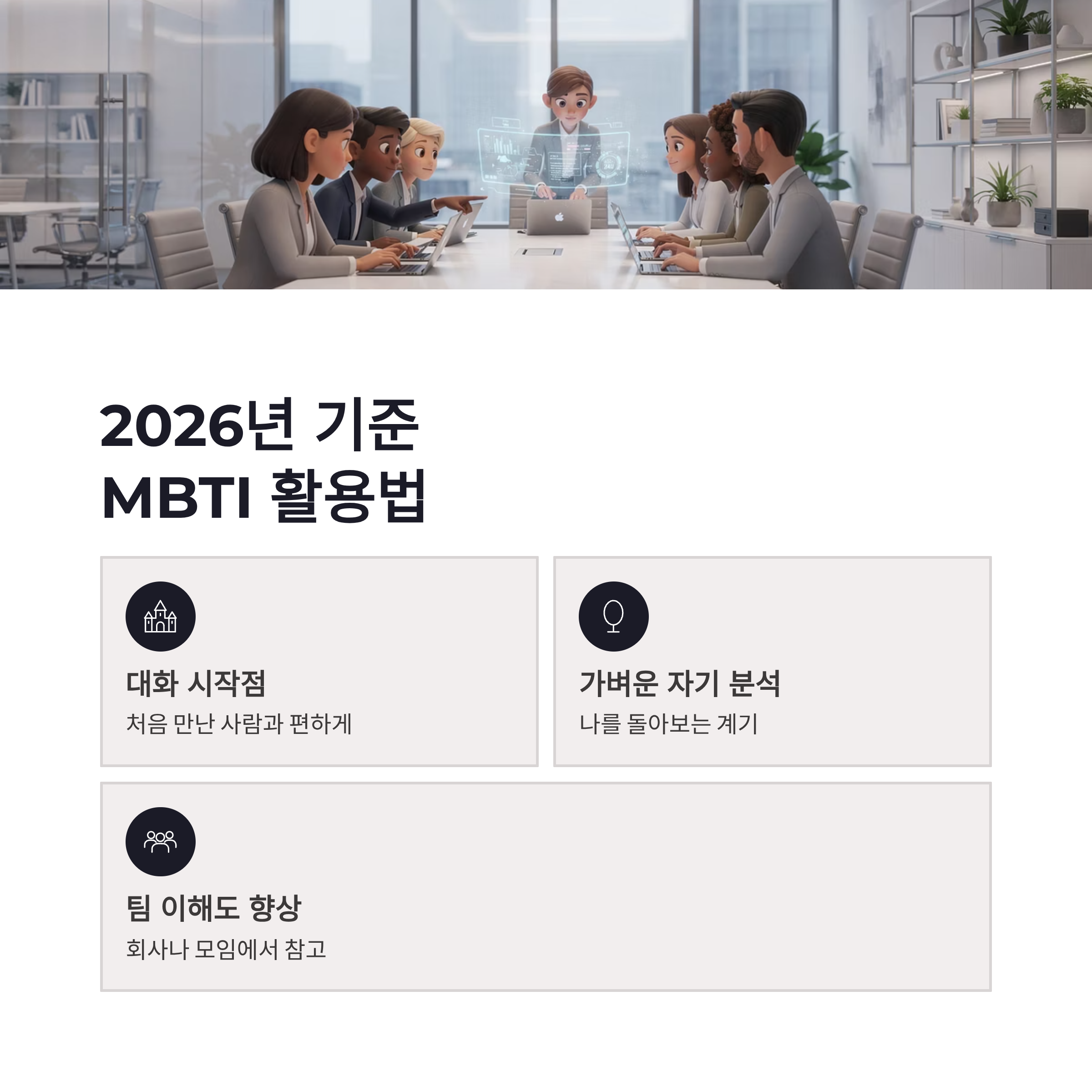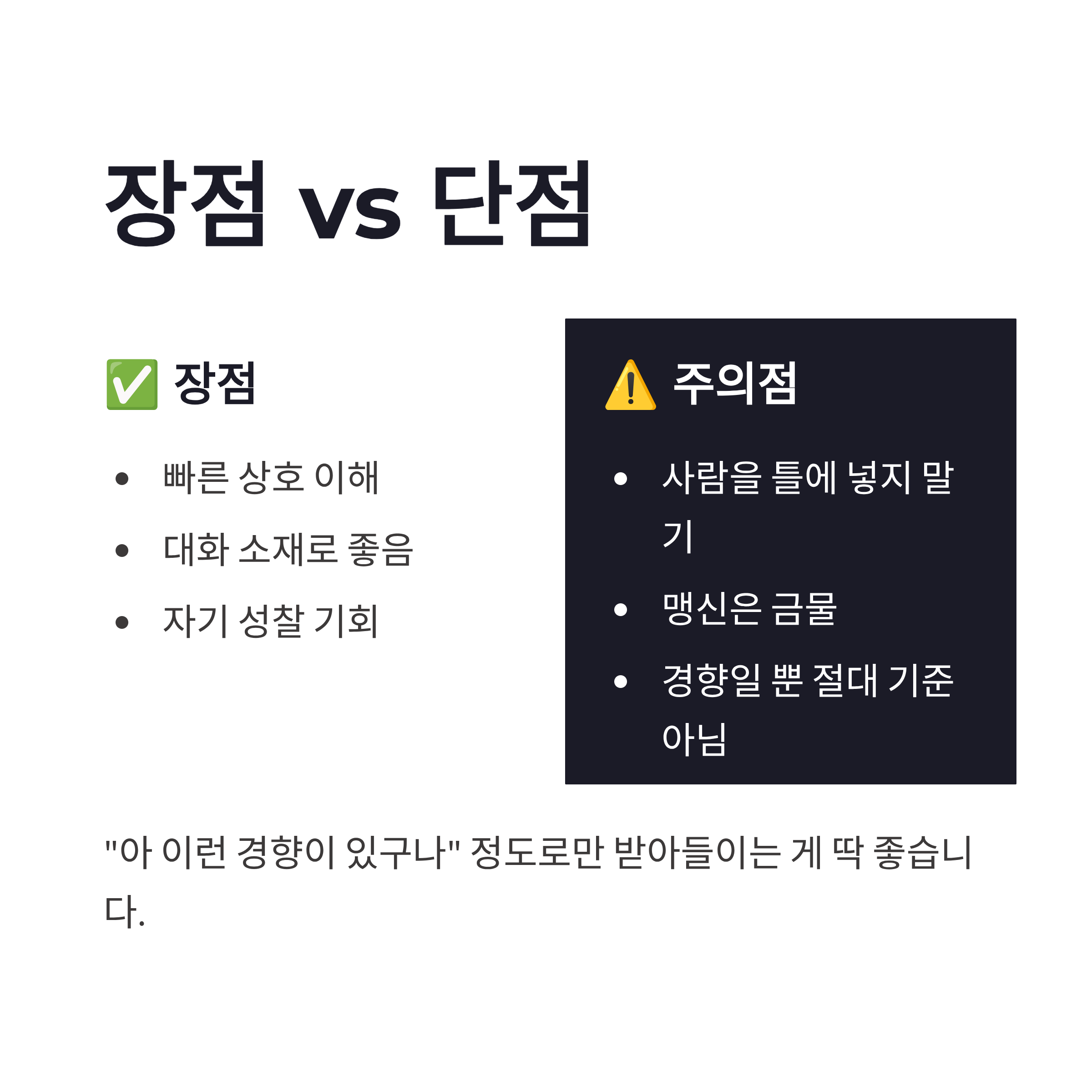 요즘 2026년 기준으로 보면, MBTI를 성격 규정 도구라기보단 대화 참고서 정도로 쓰는 분위기예요. 실제로 심리 쪽에서도 MBTI는 성향 경향을 보는 도구지, 성격을 고정하는 기준은 아니라고 하더라구요. 저도 엠비티아이 검사 결과가 상황이나 시기에 따라 조금씩 바뀌는 걸 여러 번 경험했구요. 장점은 빠르게 서로를 이해하는 데 도움 된다는 점, 단점은 너무 믿으면 사람을 틀에 넣게 된다는 거… 이게 좀 위험합니다 ㅠㅠ 그래서 저는 “아 이런 경향이 있구나” 정도로만 받아들이는 편이 제일 편하더라구요. 그 정도가 딱 좋슴다.