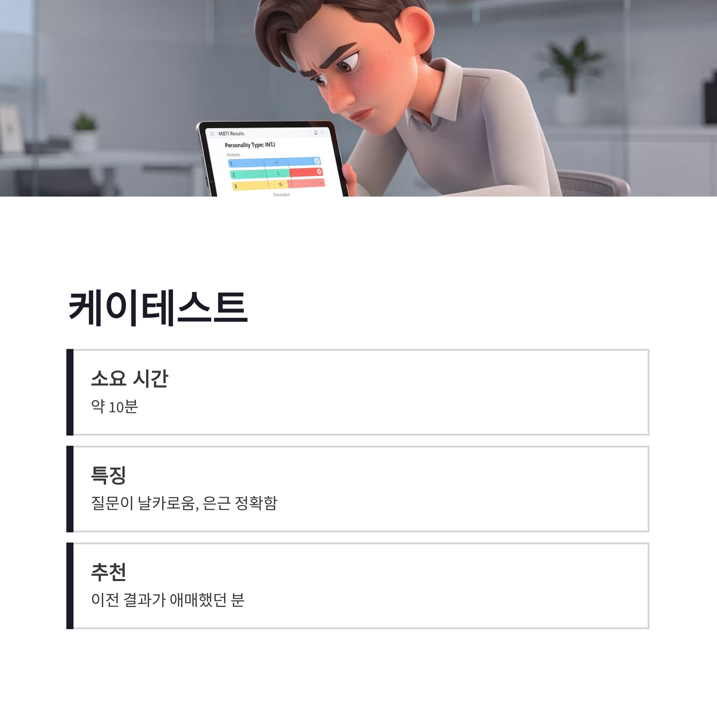 | 케이테스트 | 질문이 날카로움, 은근 정확 | 약 10분 | 이전 결과가 애매했던 분 |