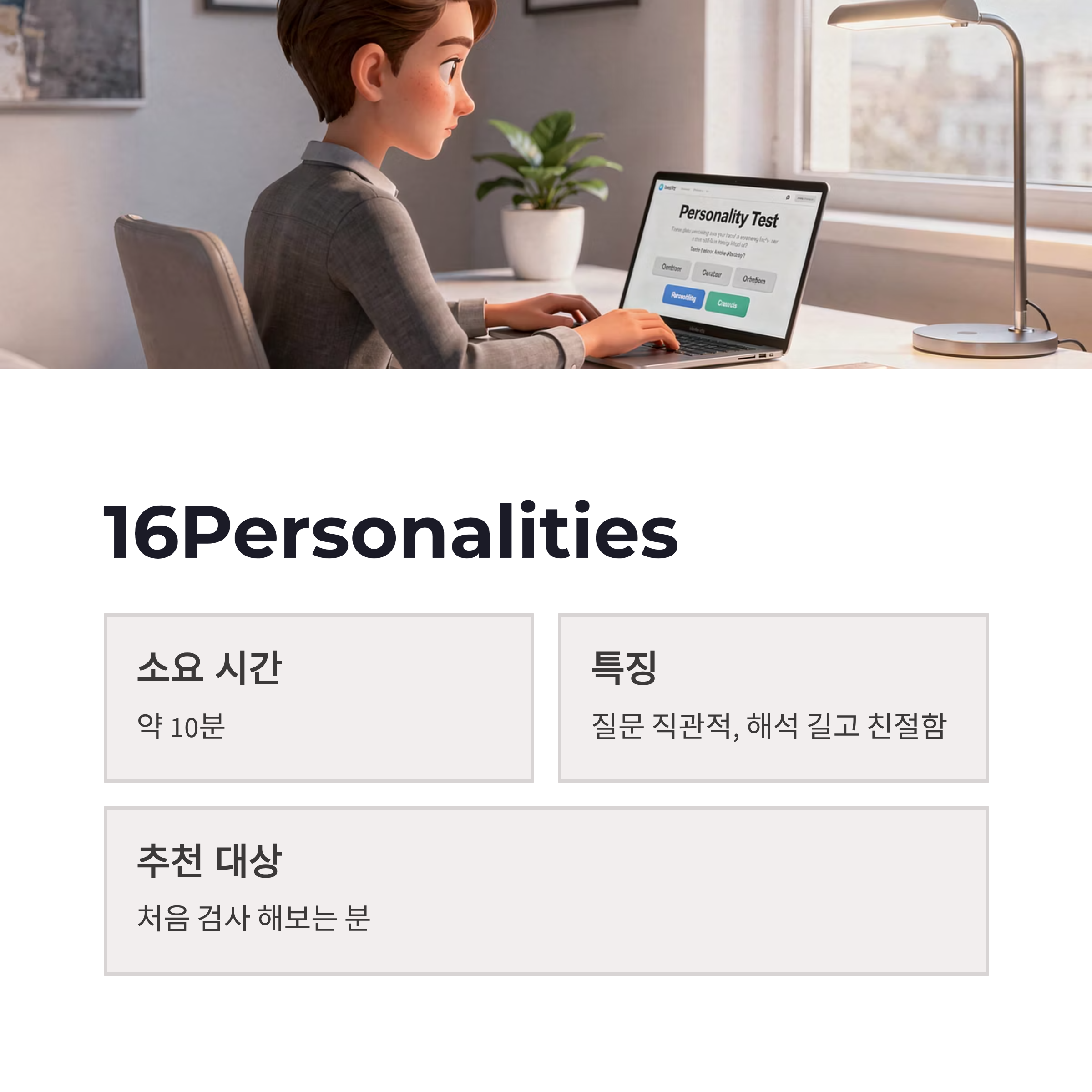 | 16Personalities | 질문이 직관적, 해석이 길고 친절 | 약 10분 | 처음 엠비티아이 검사 해보는 분 |