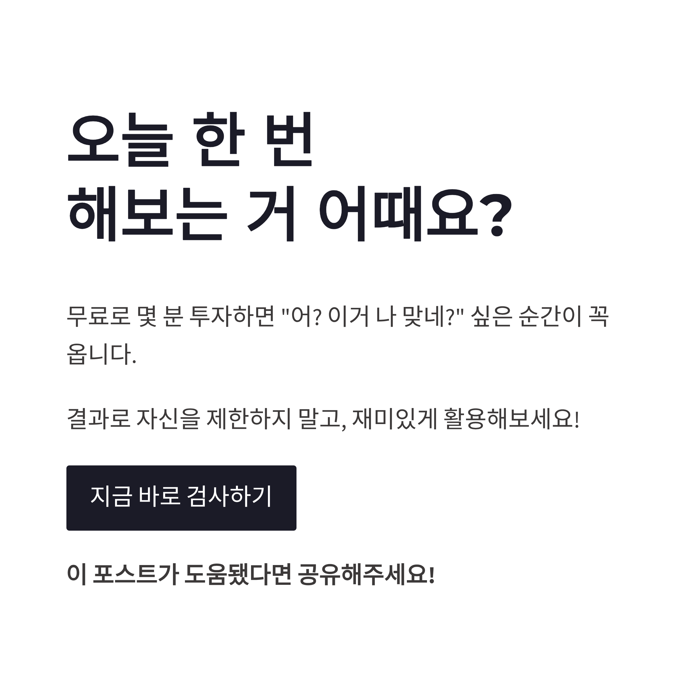 개인적으로는 엠비티아이 검사를 한 번만 하지 말고, 최소 두 군데 이상 해보는 걸 추천합니다. 결과가 같으면 은근 신뢰도 올라가고, 다르면 “아 내가 이런 상황에선 다르게 반응하나?” 이런 생각도 들더라구요. 생각보다 재미있습니다 이게 ㅋㅋ